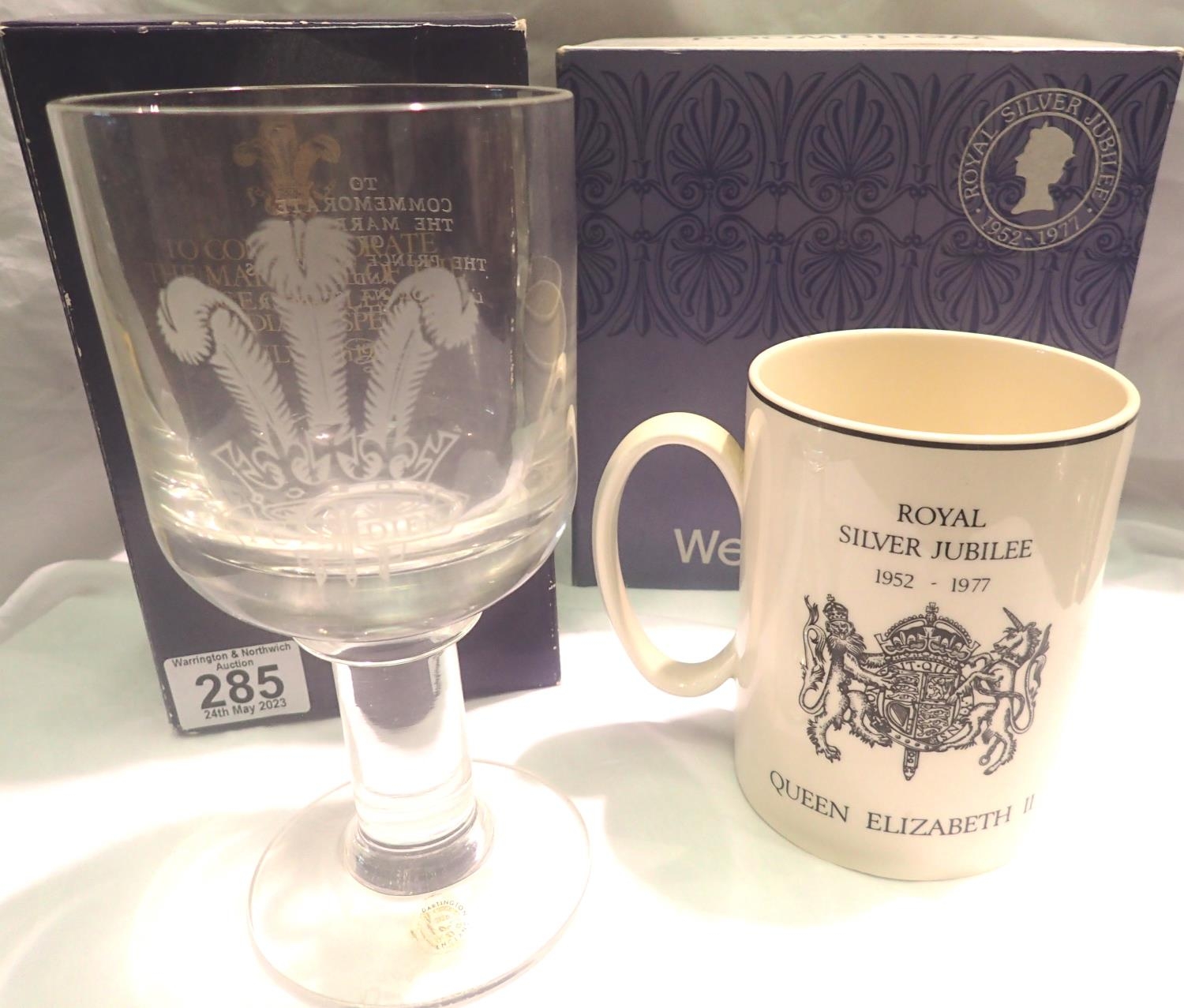 Wedgwood and Dartington Crystal 20th century Royal commemoratives, two boxed (3). P&P Group 2 (£18+VAT for the first lot and £3+VAT for subsequent lots)