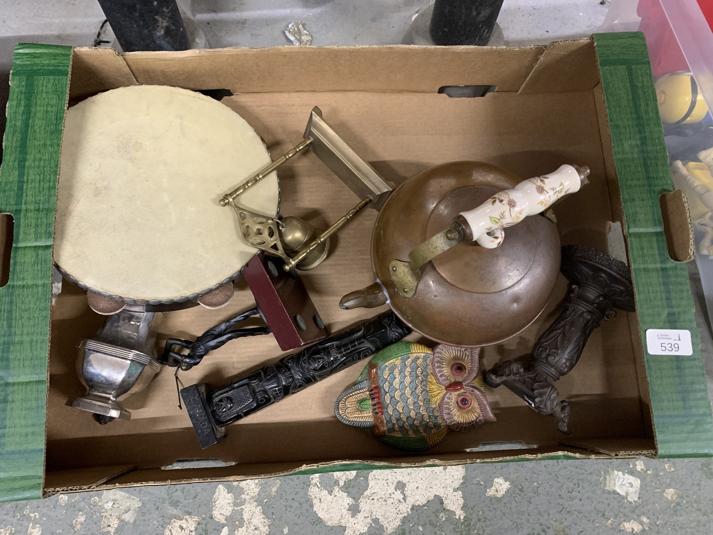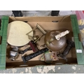 A Collection of Vintage Household and Decorative Items including Copper Kitchenware and Carved Souvenirs