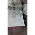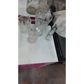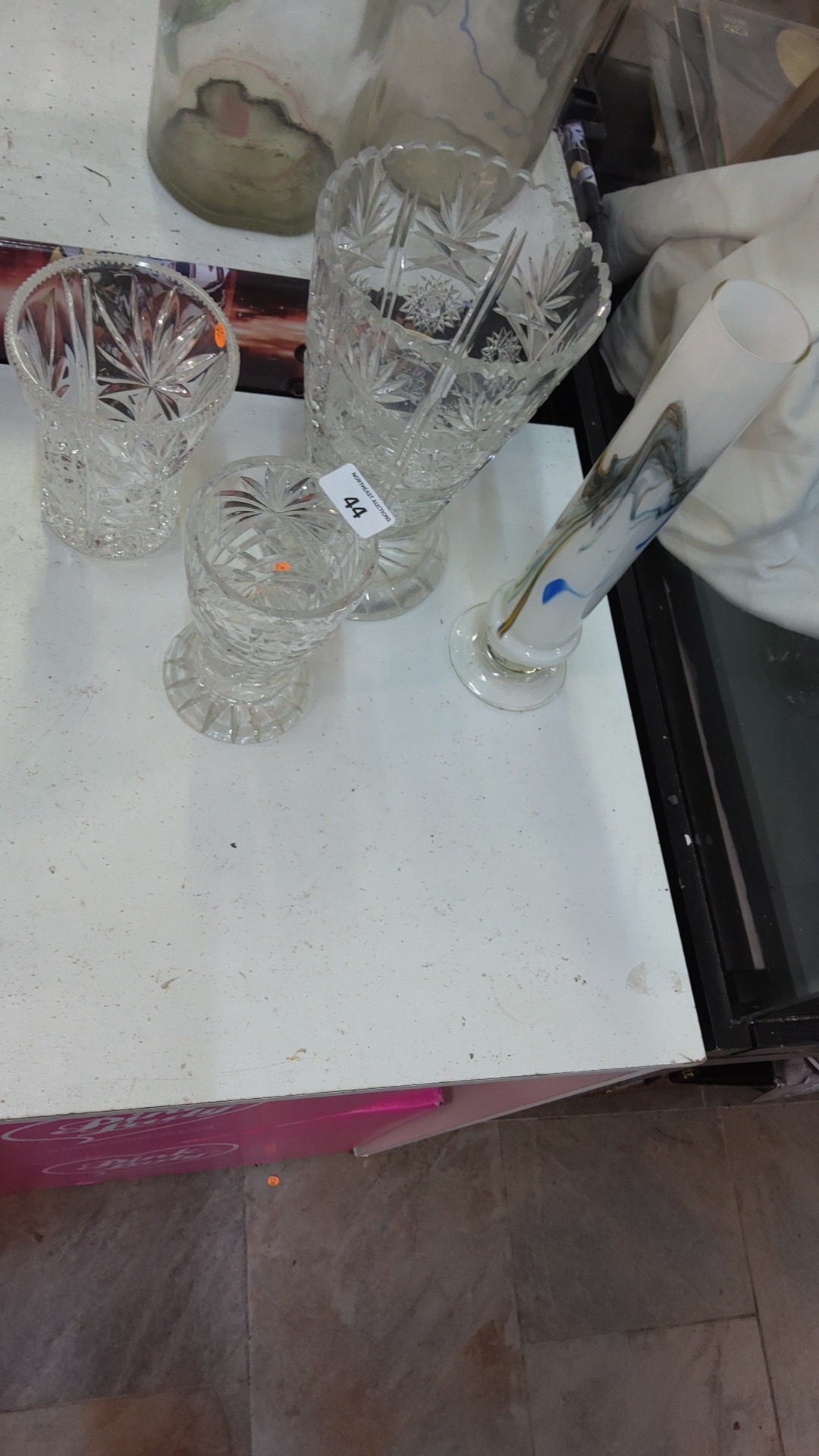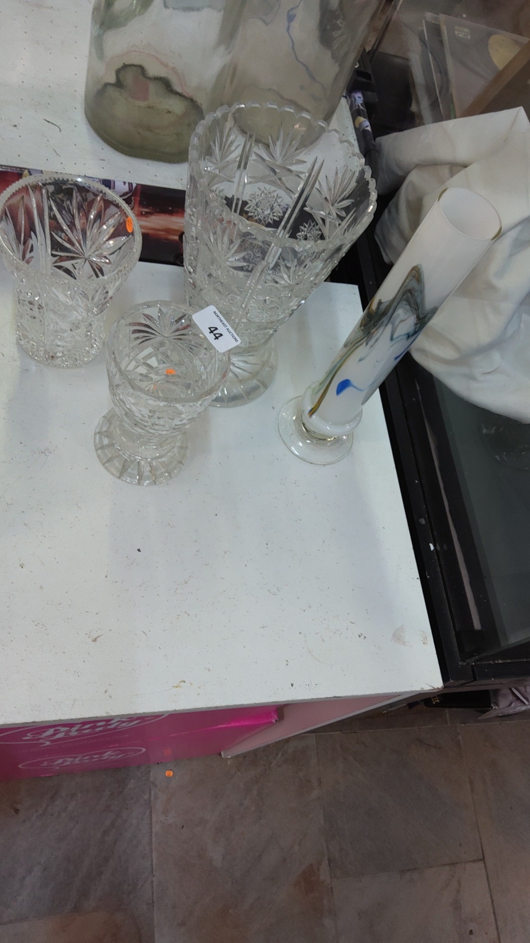 Set of four assorted vases: three clear cut lead-crystal examples with hobstar and fan motifs, together with a tall white cased-glass bud vase trailed with multicolour swirls.
