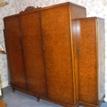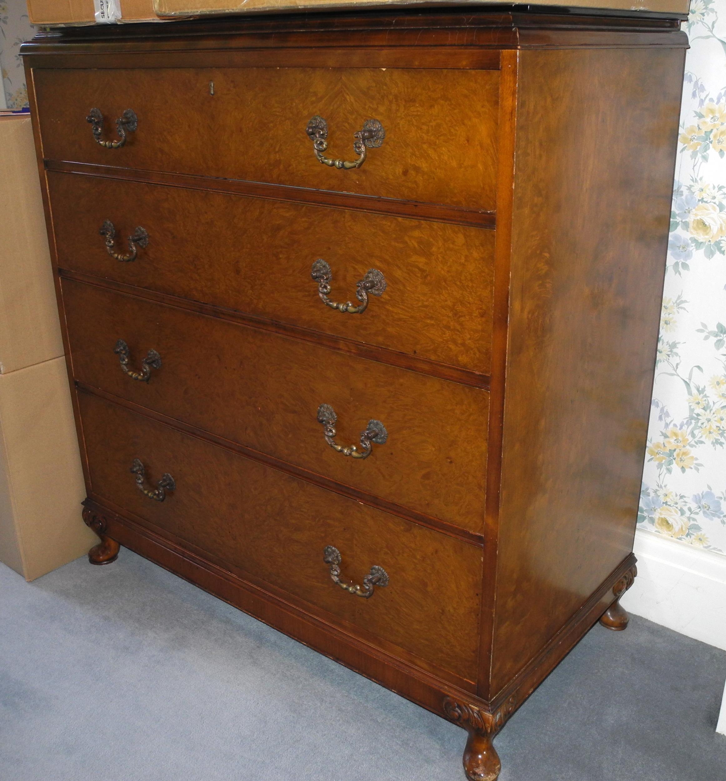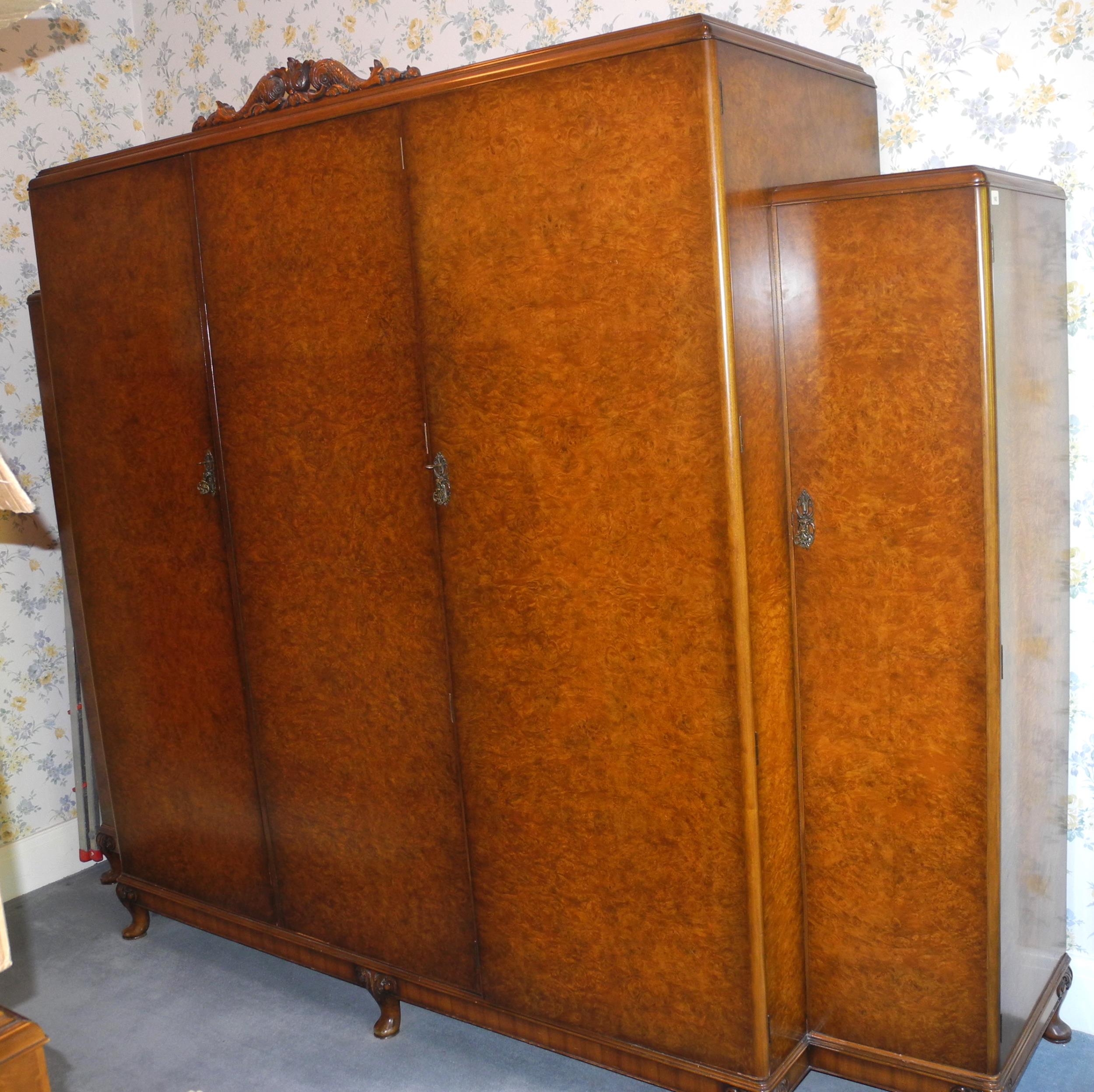 A large burr walnut break centre wardrobe, dolphin carved cresting; a conforming chest of four long drawers, c.1940