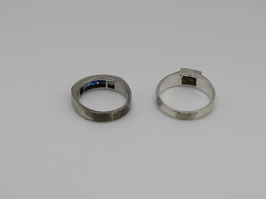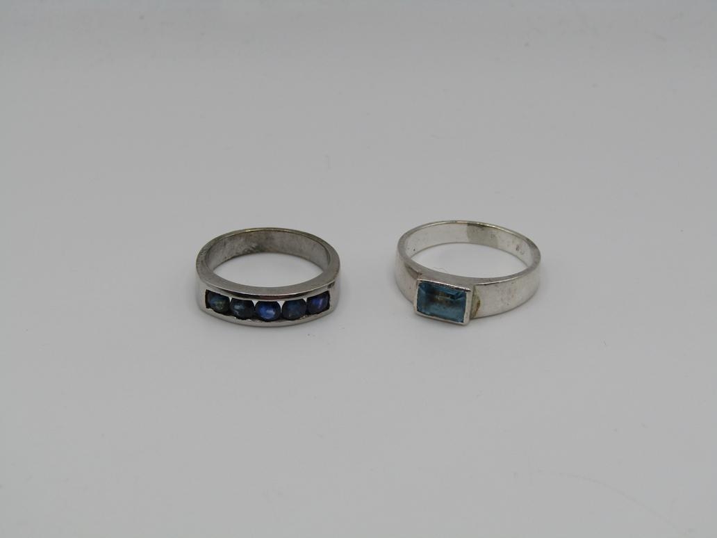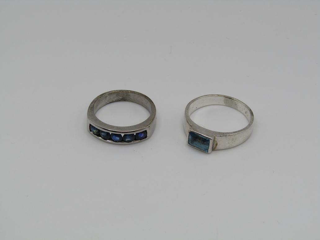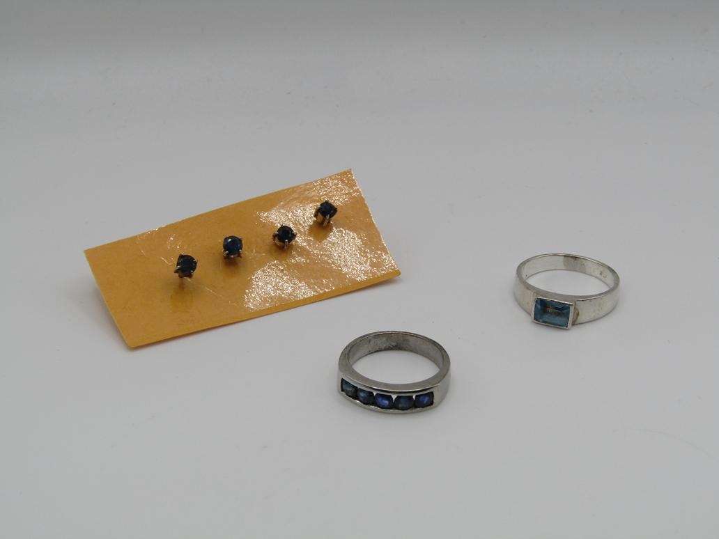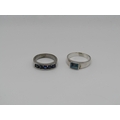 TWO SILVER STONE SET RINGS AND TWO PAIRS OF SILVER STONE SET EARRINGS