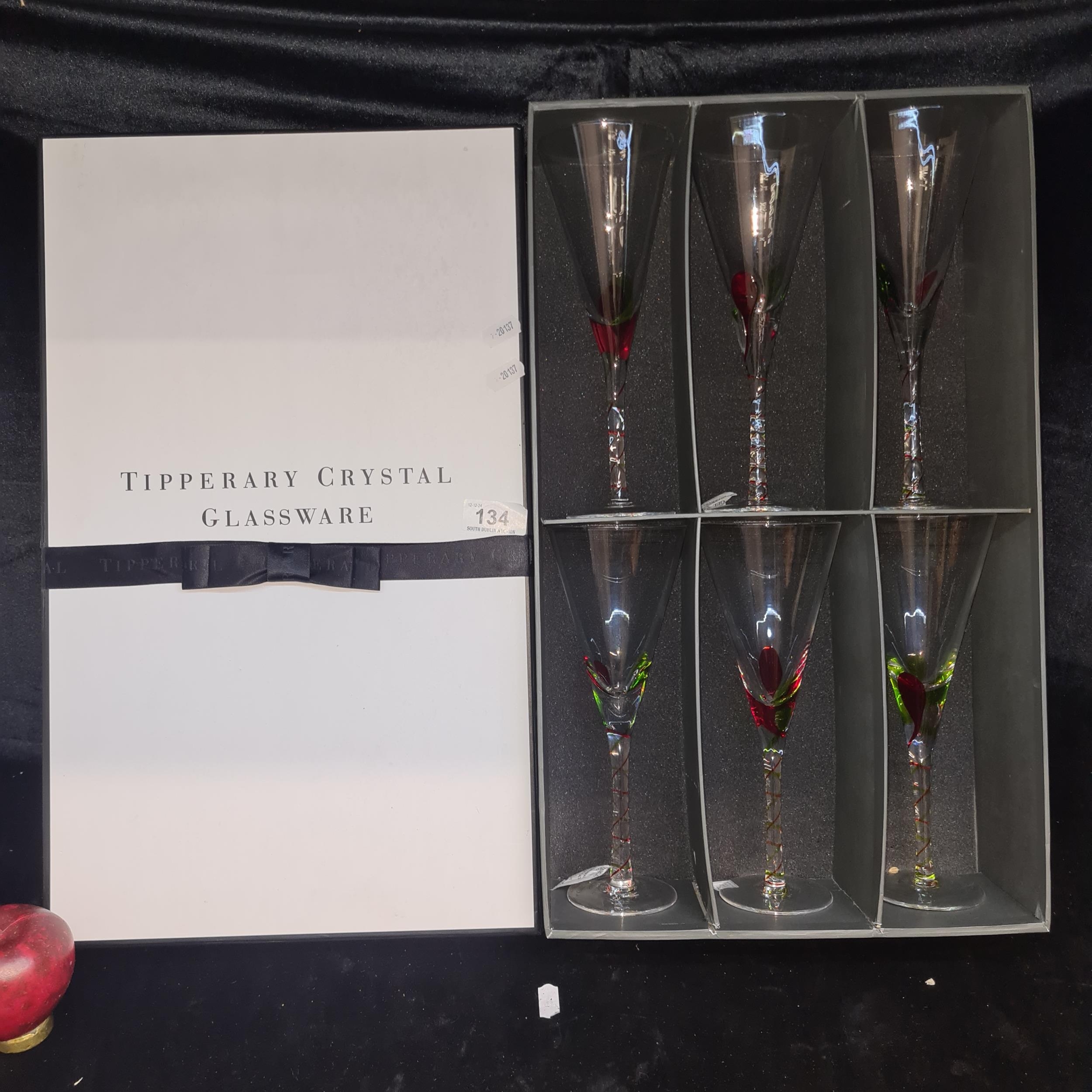 A lovely set of six Tipperary Crystal wine glasses with hints of red and green to stems. Housed in original Tipperary Crystal box. All in good condition.
