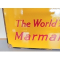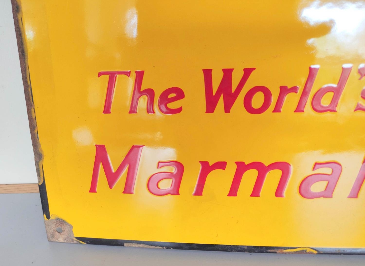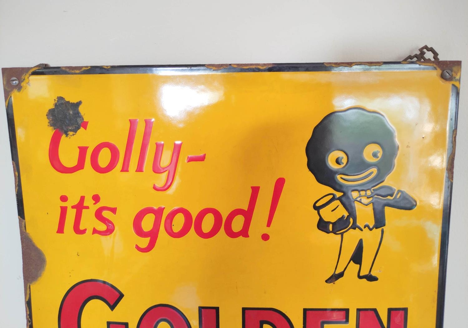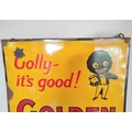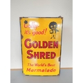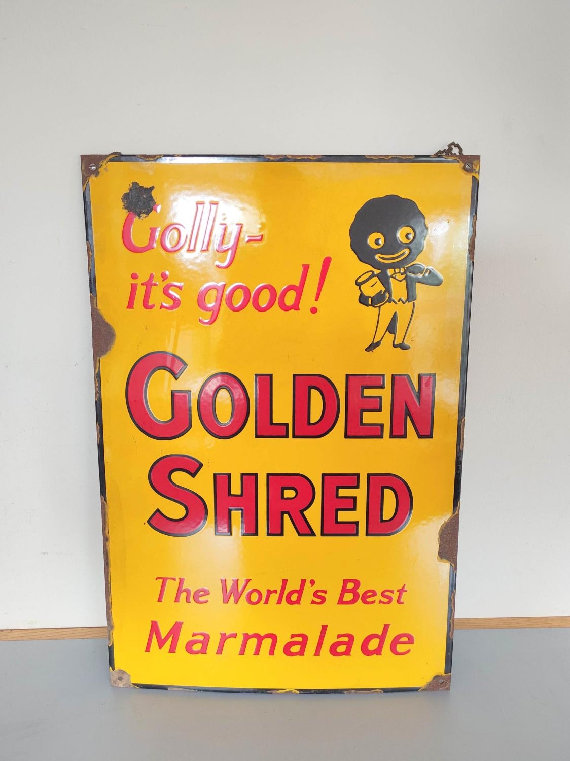 Vintage Robertson's Golden Shred enamel sign with their infamous mascot surrounded by the text "Golly it's good!, The world's best marmalade". Colours, & lettering crisp with some rust spots to borders. 60cm x 40cm.