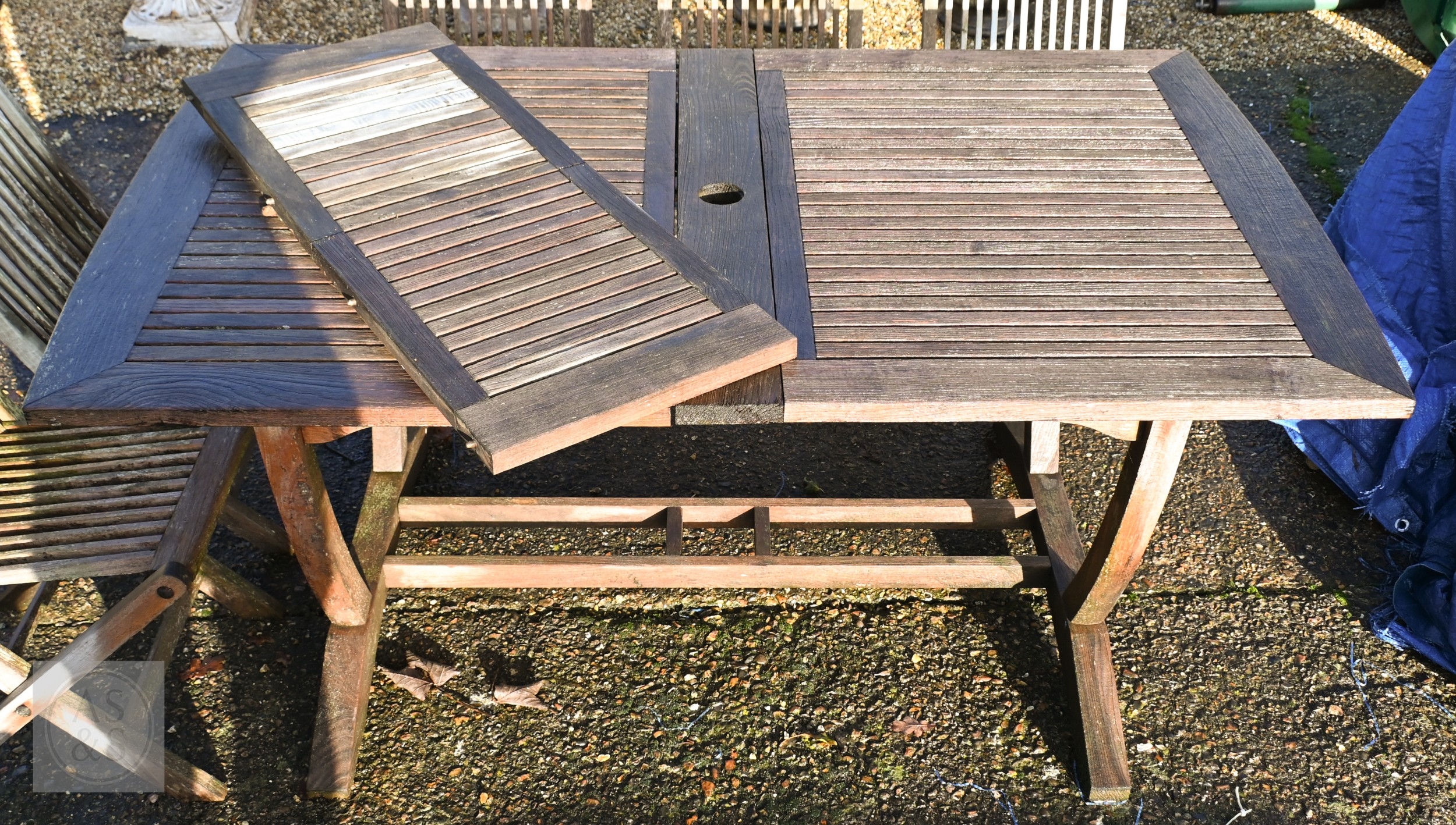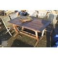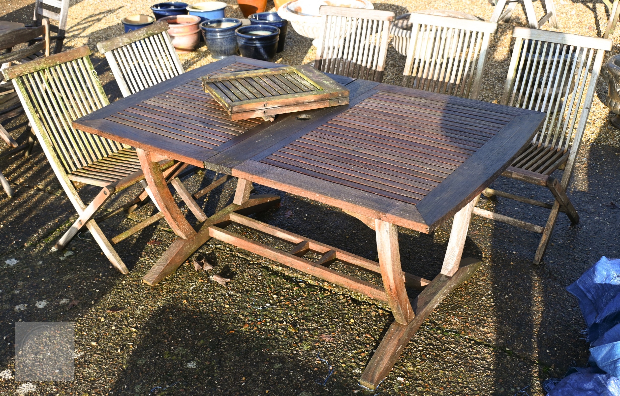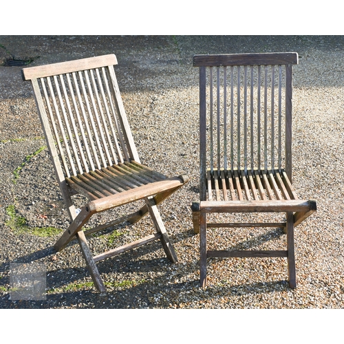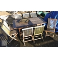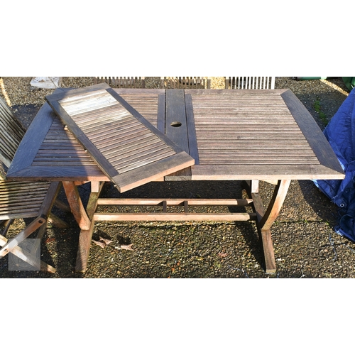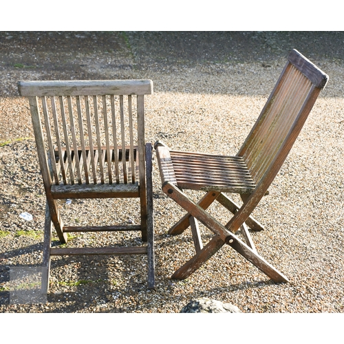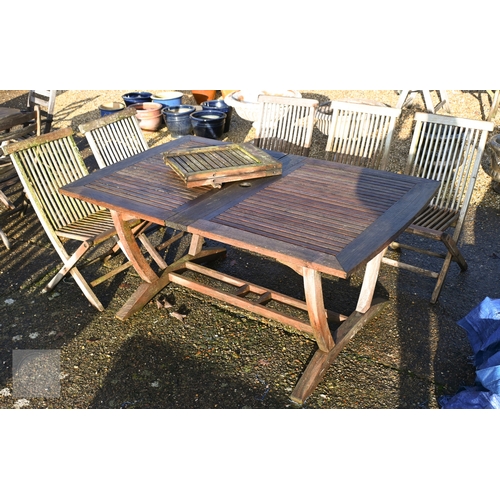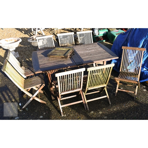 A weathered teak extending garden table 164 cm x 100 cm (max 204 cm) x 76 cm h to/with a set of eight folding chairs, some elements a/f