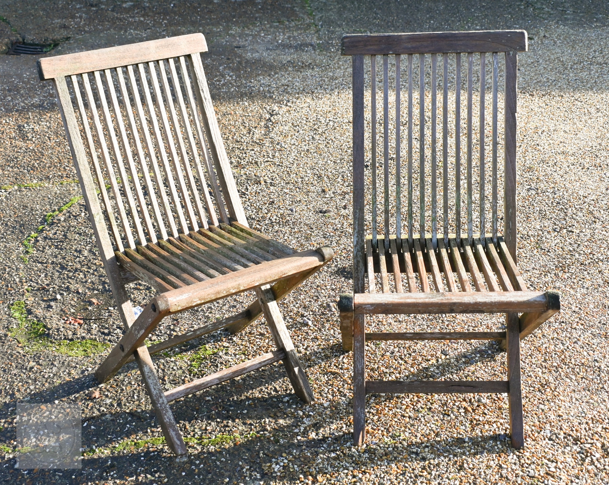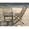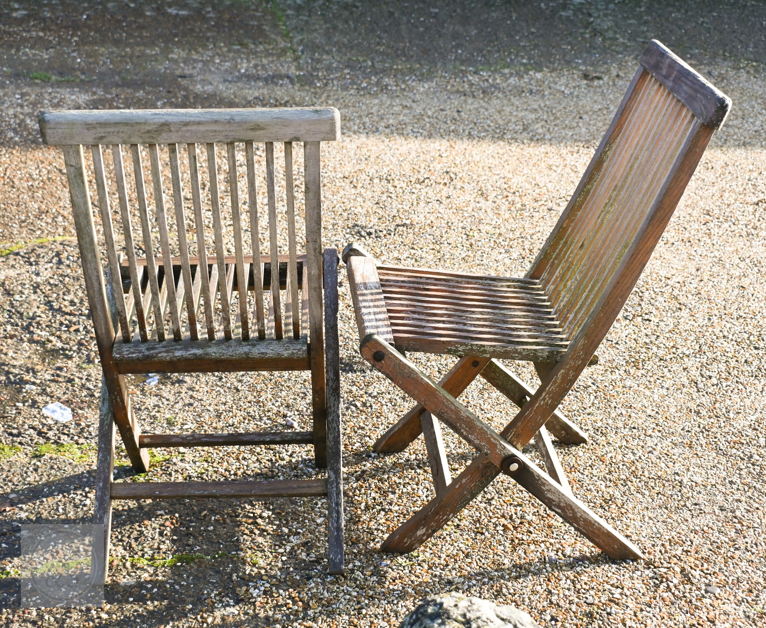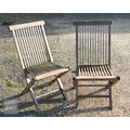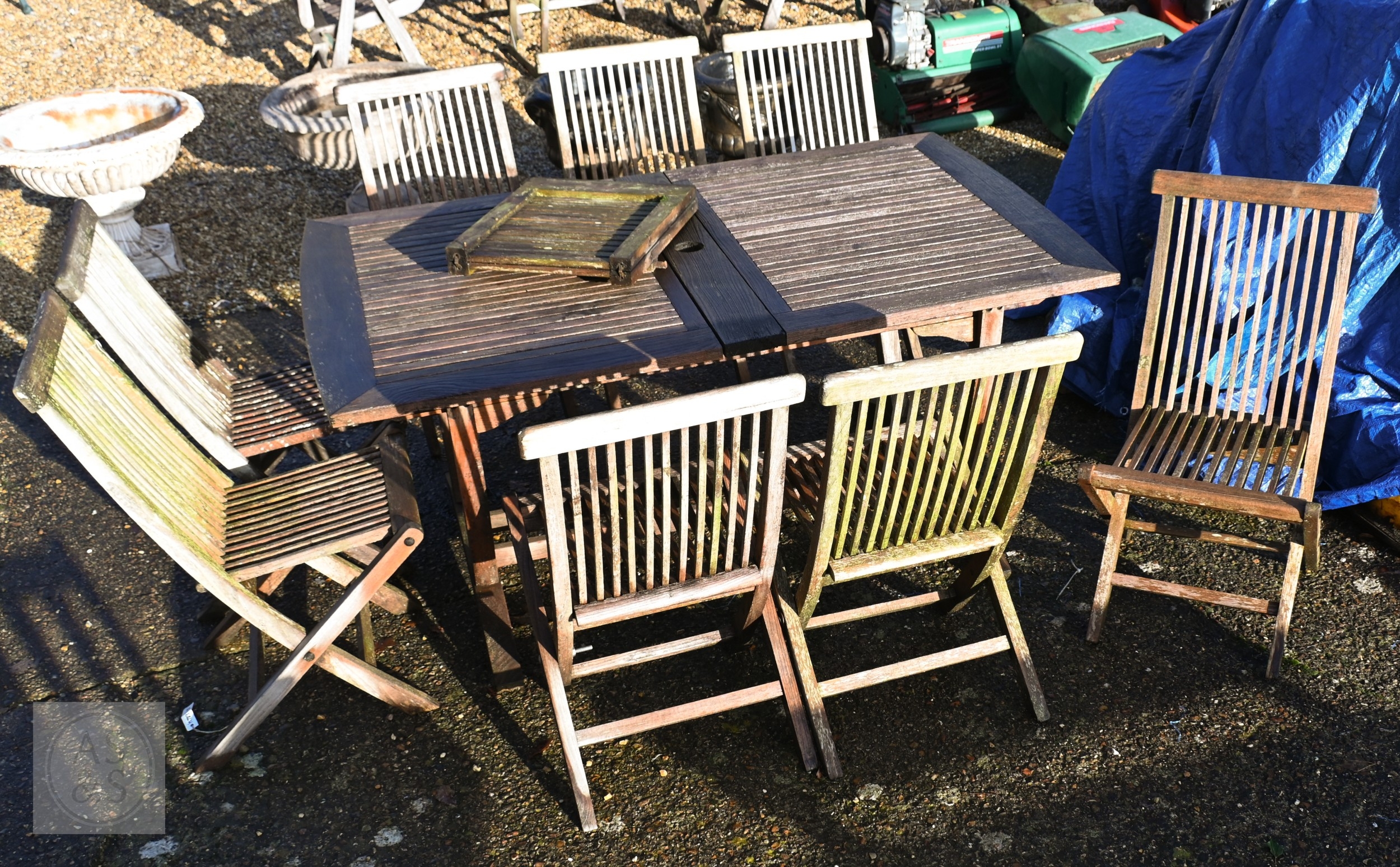 A weathered teak extending garden table 164 cm x 100 cm (max 204 cm) x 76 cm h to/with a set of eight folding chairs, some elements a/f
