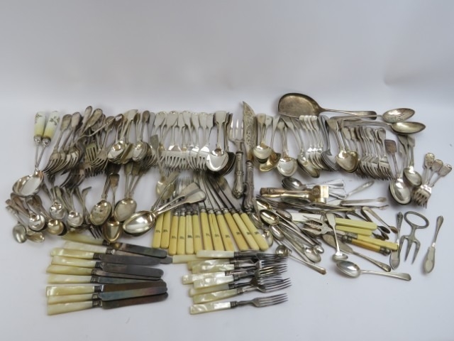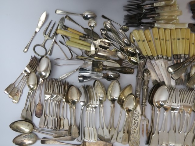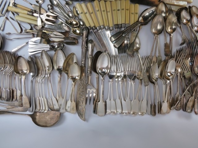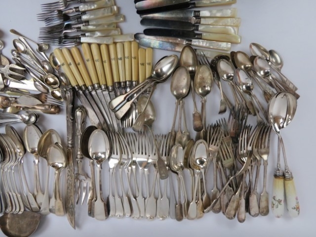 A large quantity of vintage silver plated dining table flatware. (Quantity)
