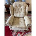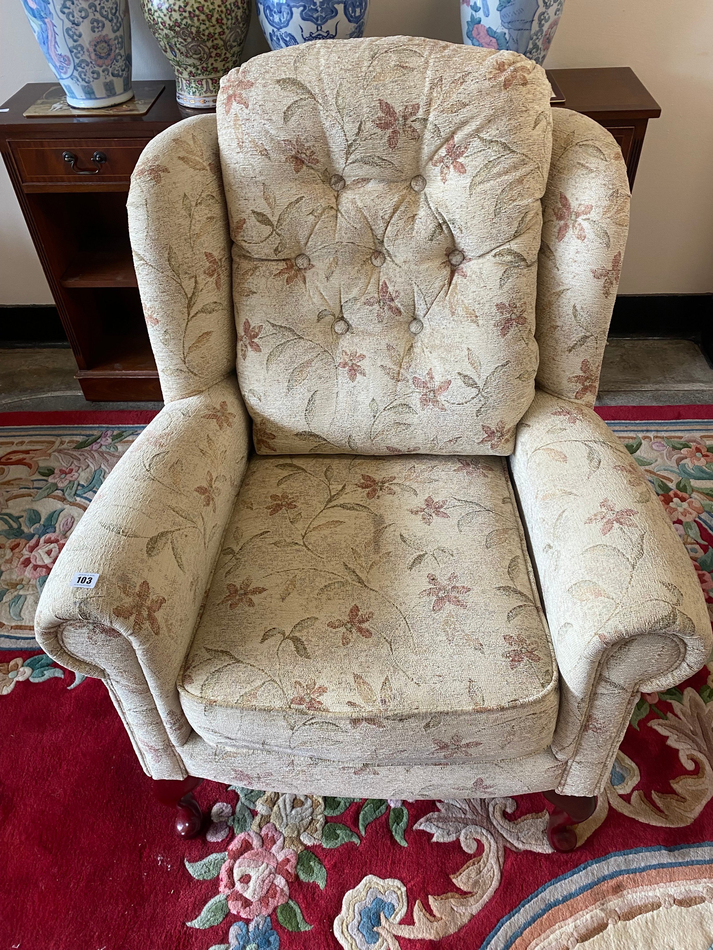 An HSL wingback armchair upholstered in cream and floral pattern material, loose seat and back cushion, on cabriole legs