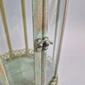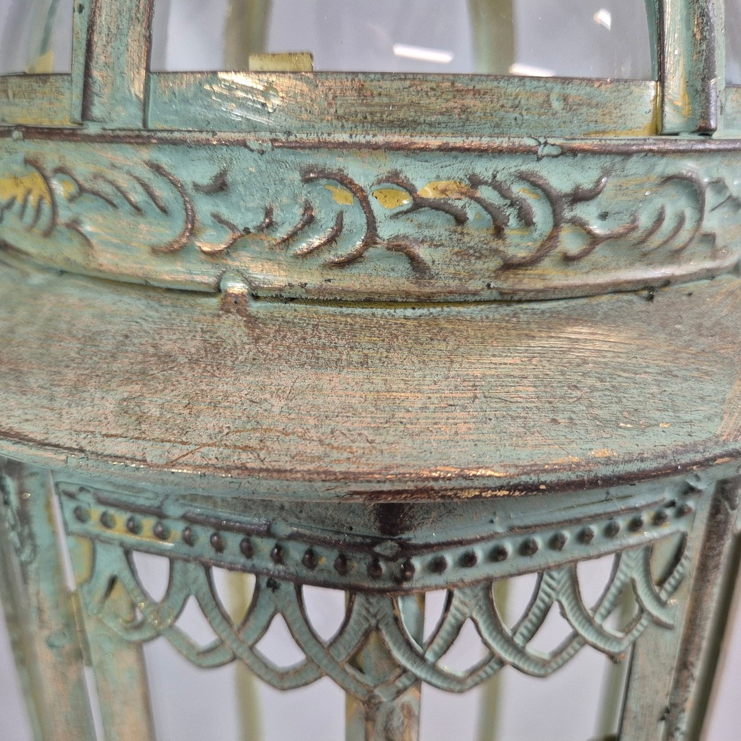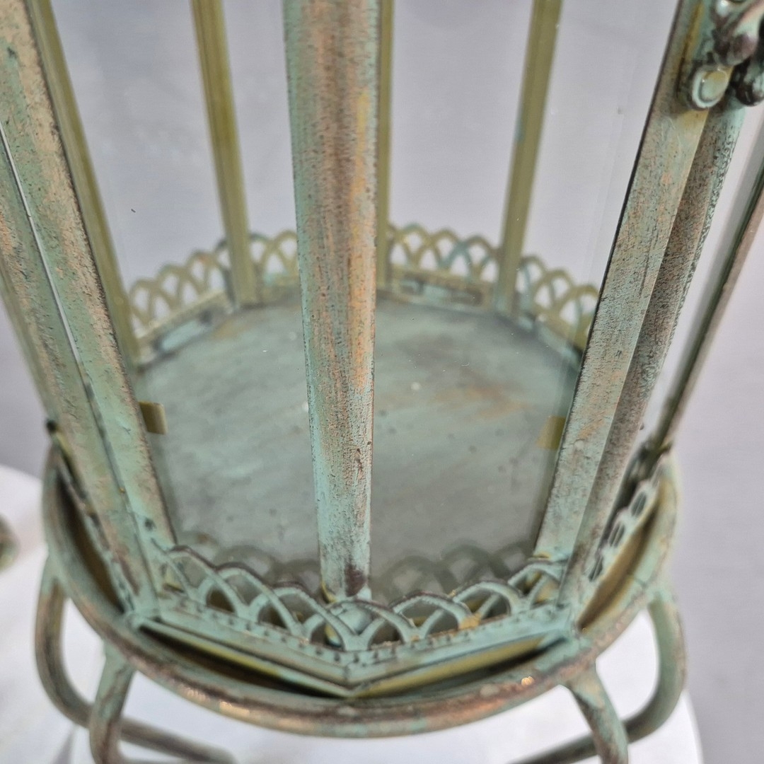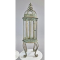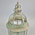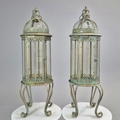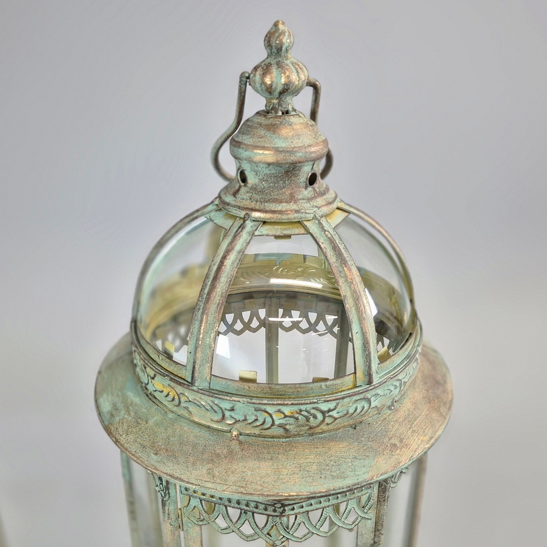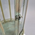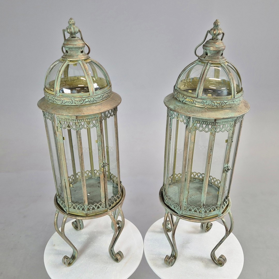 PAIR OF LANTERNS ON STANDS IN VERDIGRIS FINISH METAL AND GLASS. 80cm H x 28cm W.