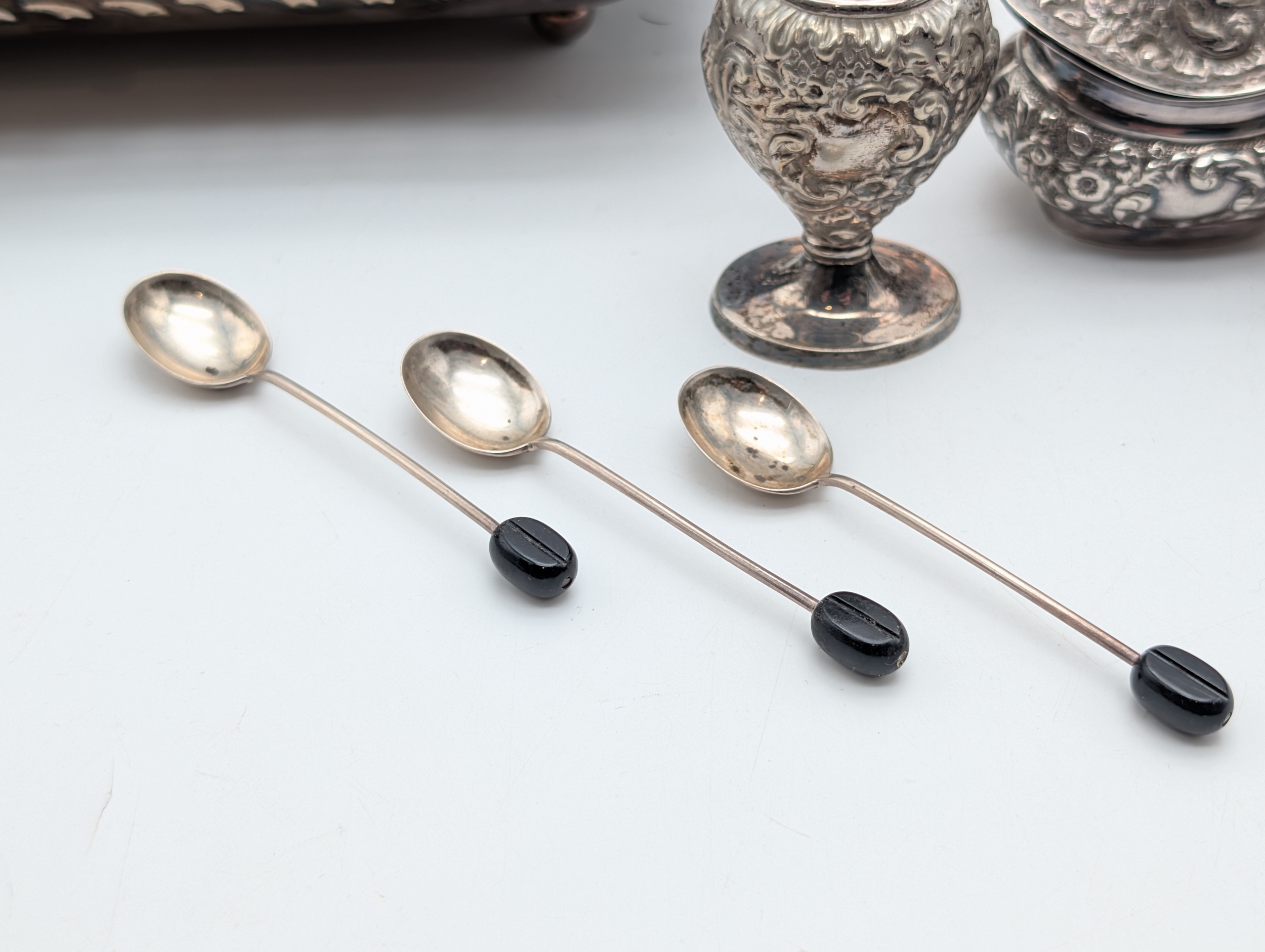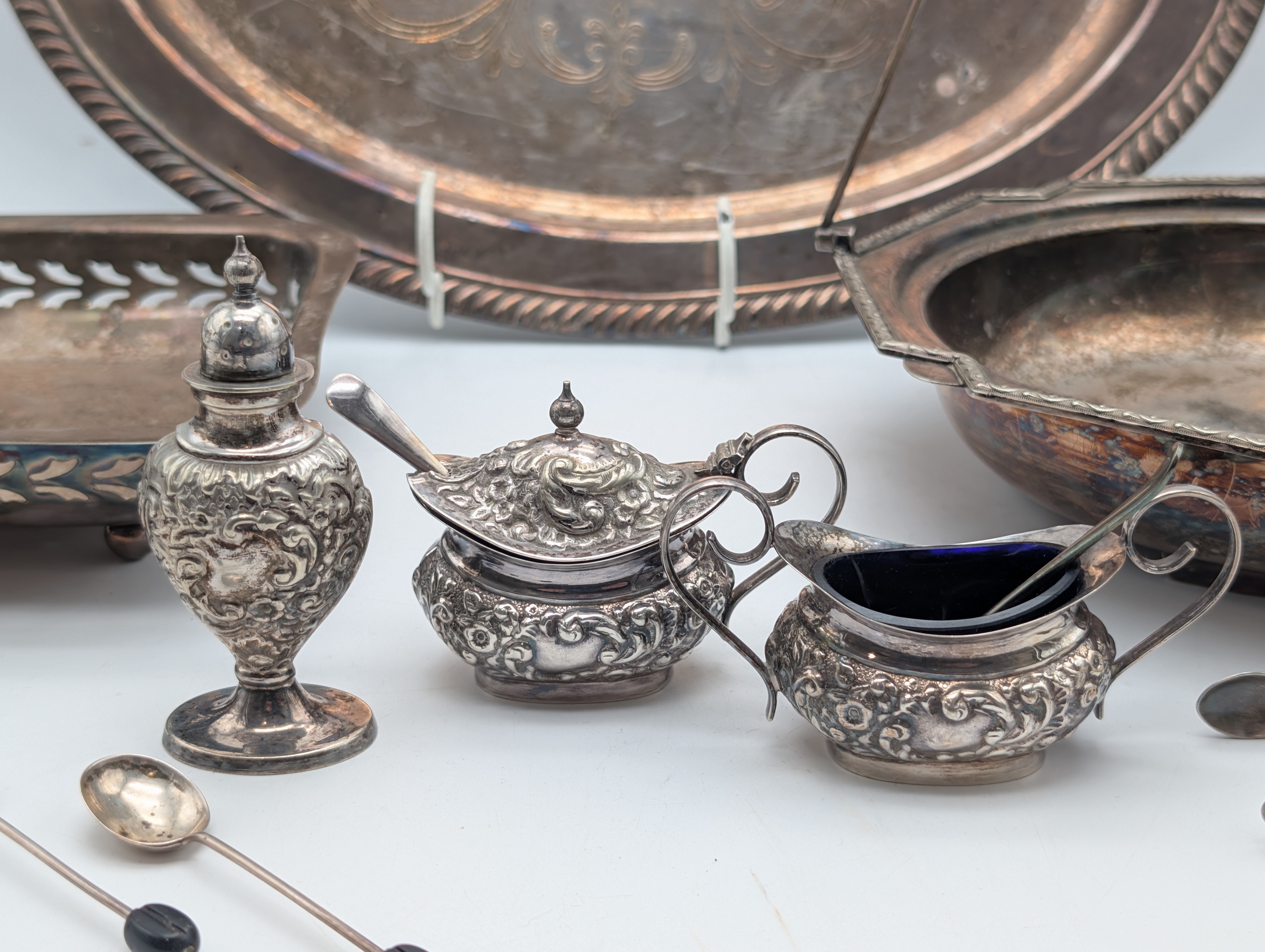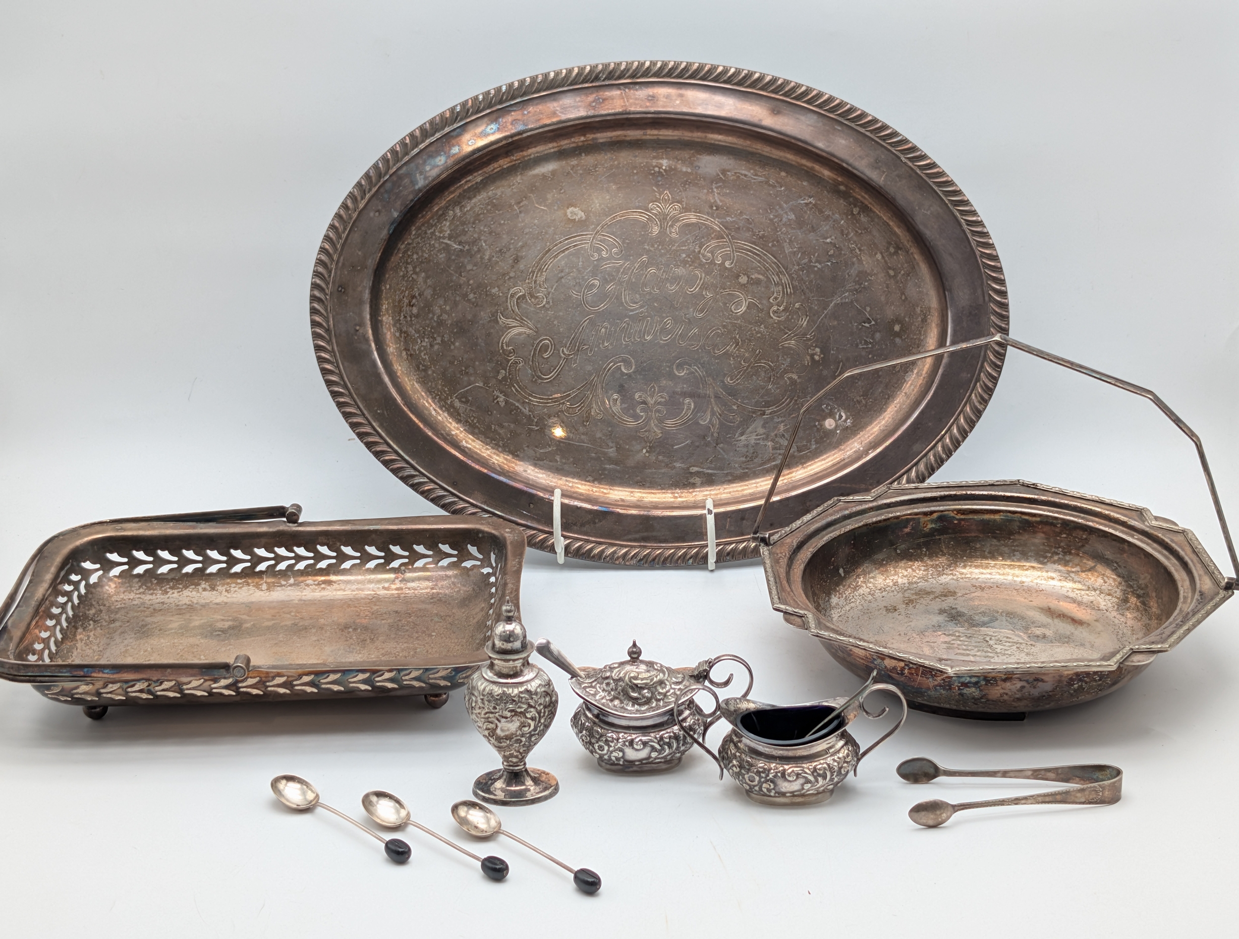 Mixed Silver-Plated Wares with Coffee Bean Spoons A mixed group of silver-plated items, including an oval serving tray engraved ‘Happy Anniversary’, a pierced rectangular tray, a handled serving dish, and a small three-piece condiment set with embossed decoration (comprising lidded pot, pepper, and cream jug with blue glass liner), together with a pair of sugar tongs and three silver teaspoons with coffee bean terminals.