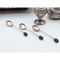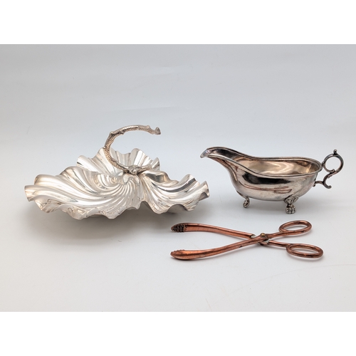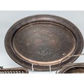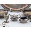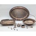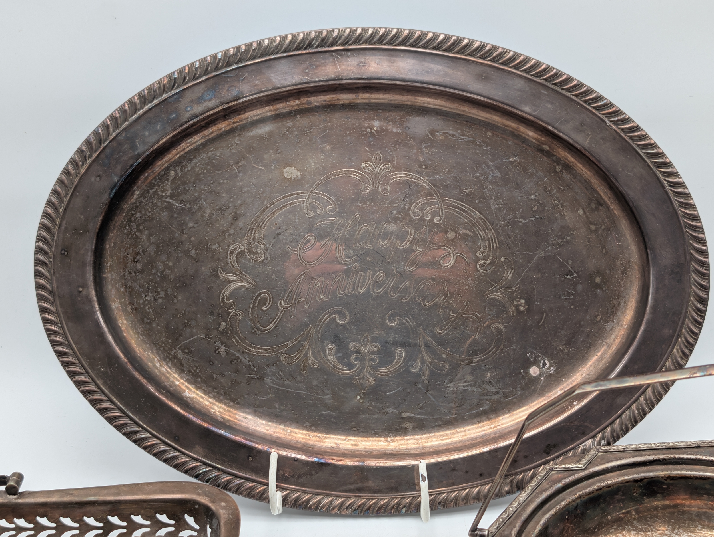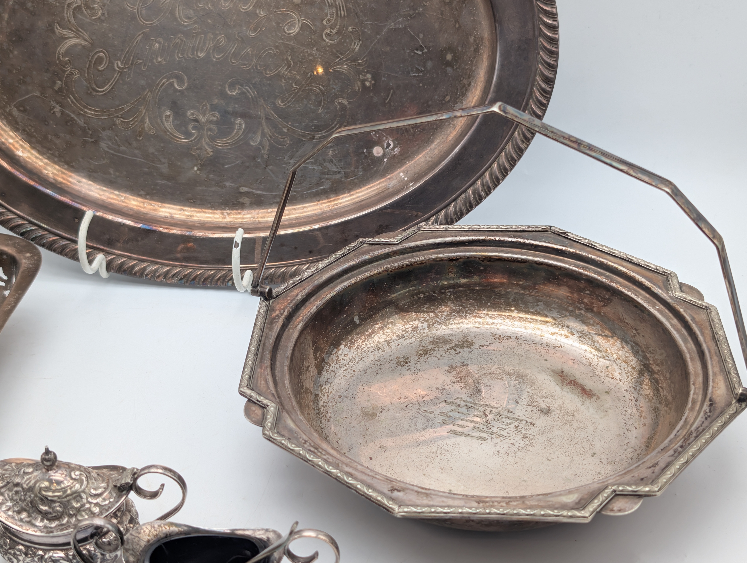 Mixed Silver-Plated Wares with Coffee Bean Spoons A mixed group of silver-plated items, including an oval serving tray engraved ‘Happy Anniversary’, a pierced rectangular tray, a handled serving dish, and a small three-piece condiment set with embossed decoration (comprising lidded pot, pepper, and cream jug with blue glass liner), together with a pair of sugar tongs and three silver teaspoons with coffee bean terminals.