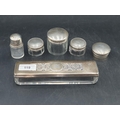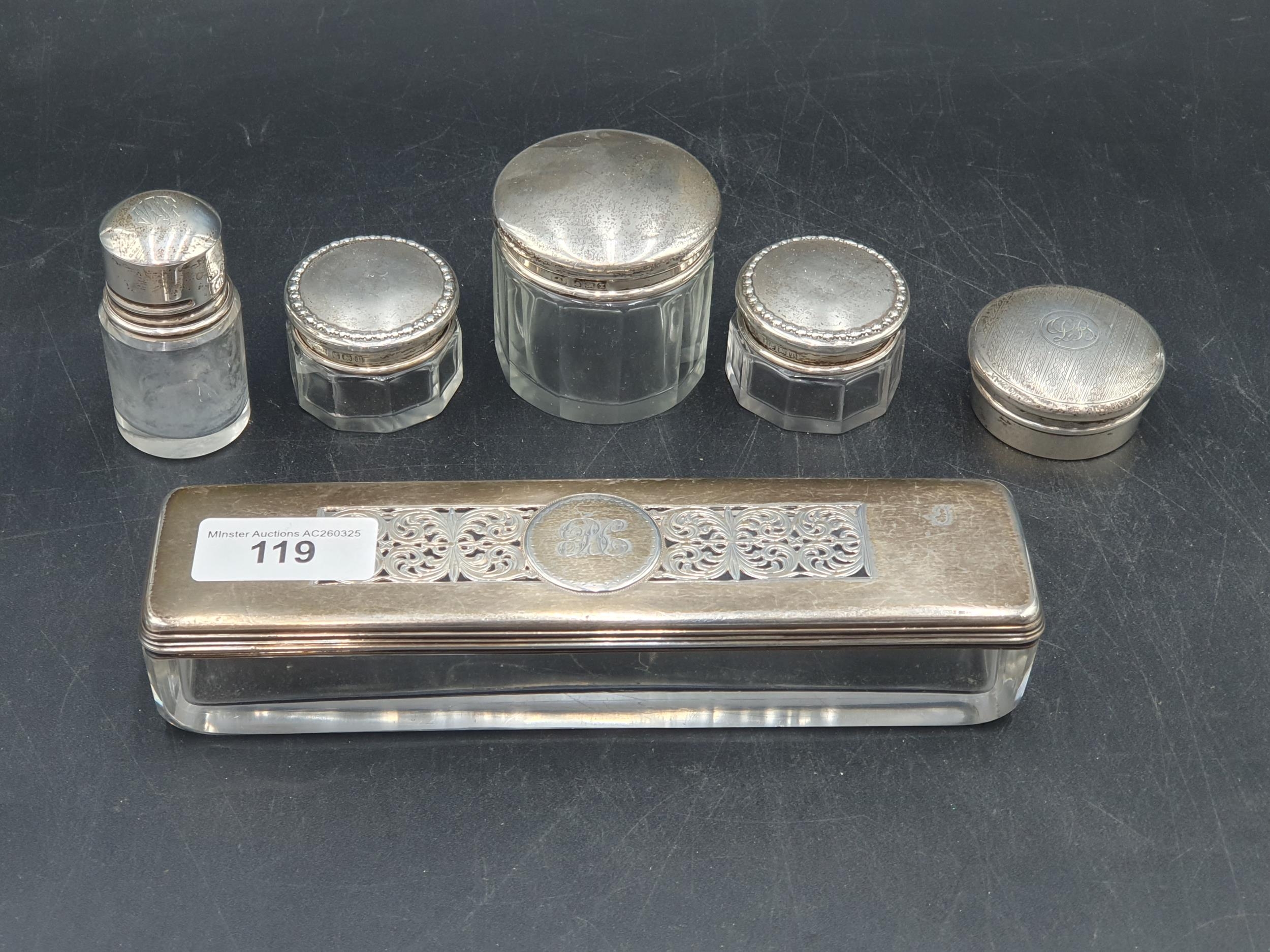 A George IV silver lidded rectangular glass Box, London 1820, and five silver lidded Jars and Boxes