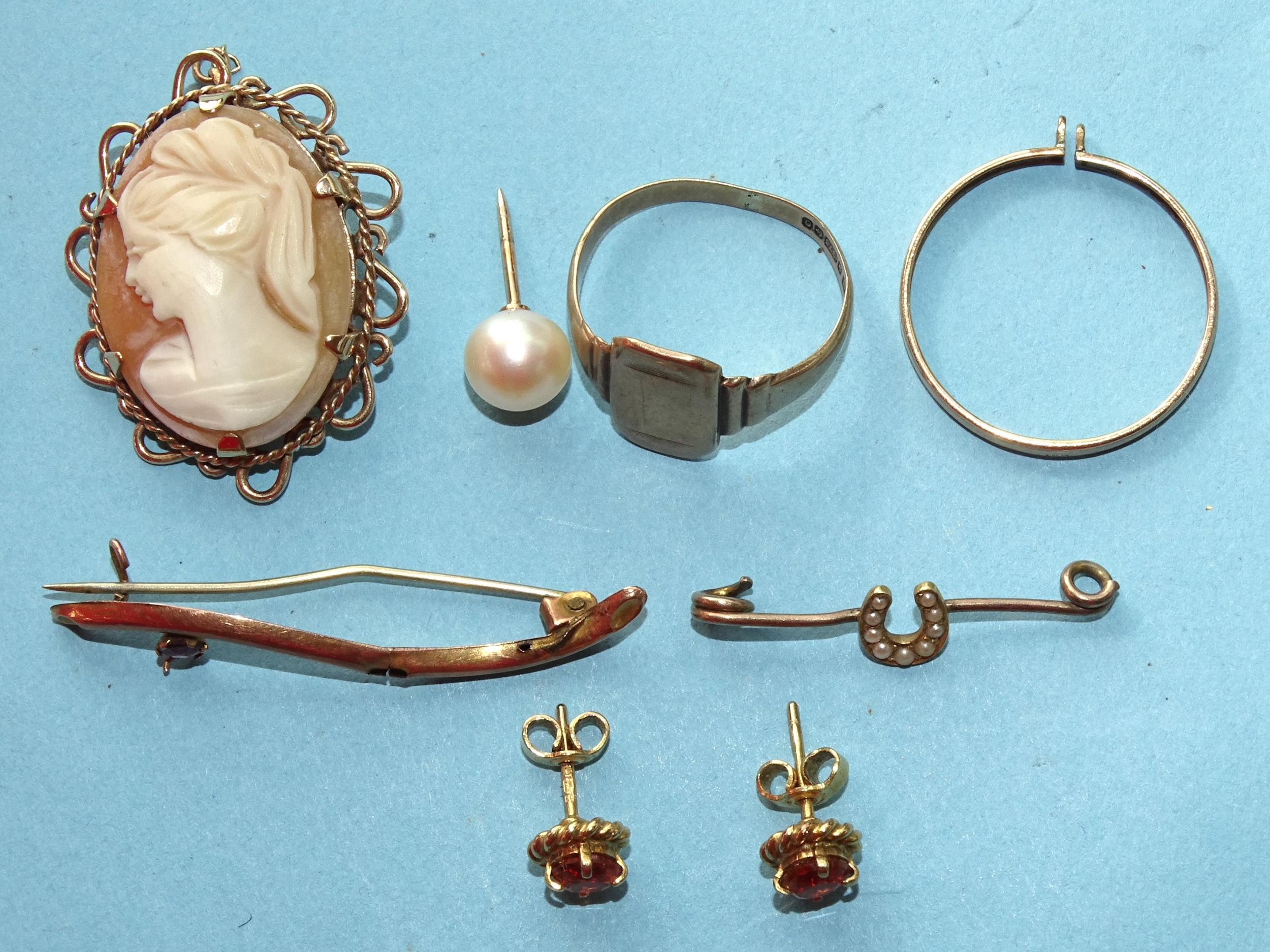 A modern 9ct gold-mounted cameo brooch/pendant, a small 9ct gold signet ring, a pair of citrine ear studs and other items, gross weight 12.7g.