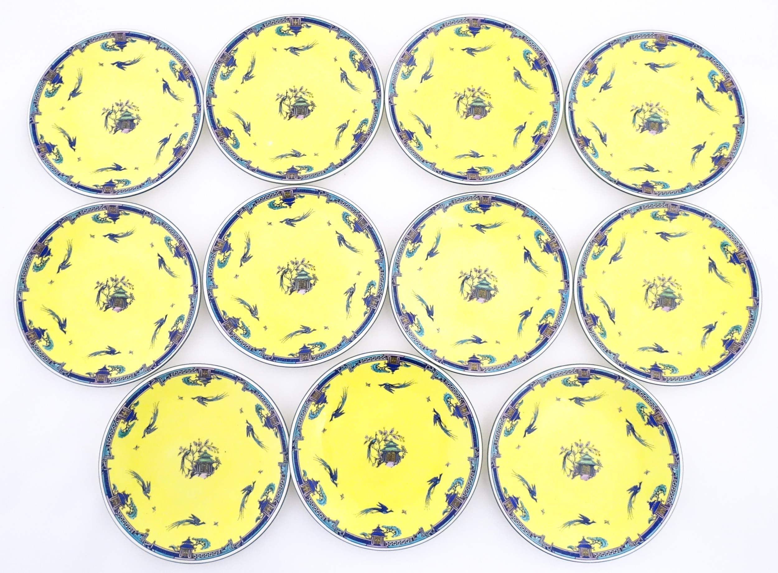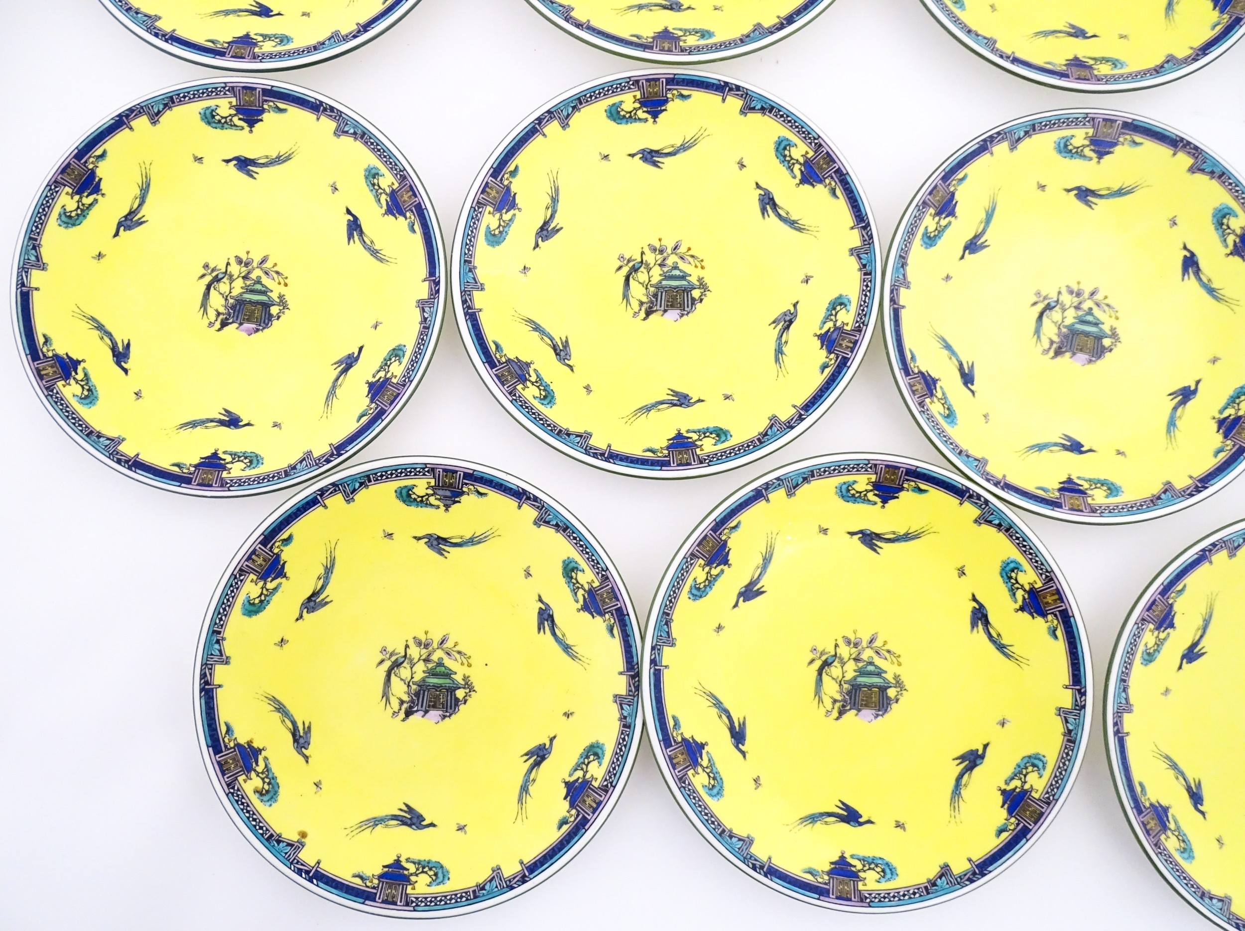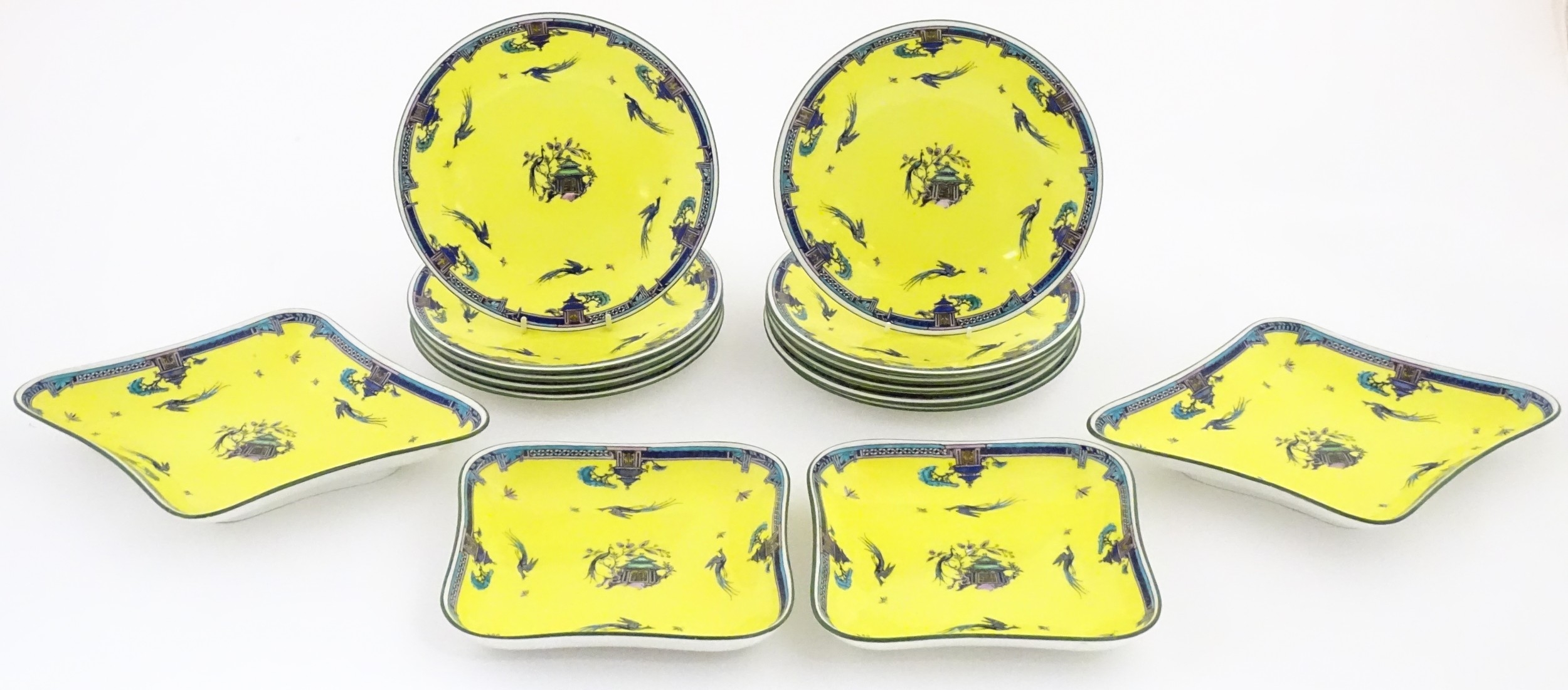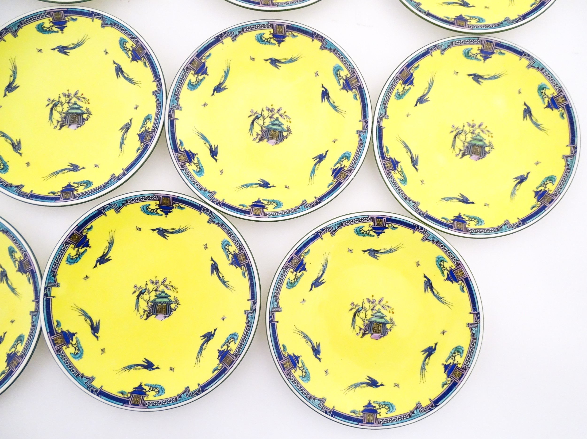 Fifteen Wedgwood yellow ground plates decorated with Chinoiserie temples and Asiatic pheasants. Marked under. Various shapes. Plates approx. 9" wide (15)