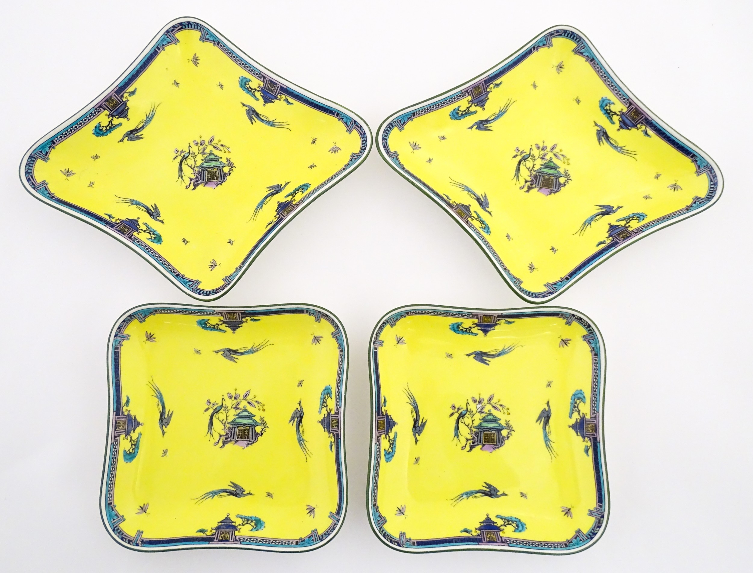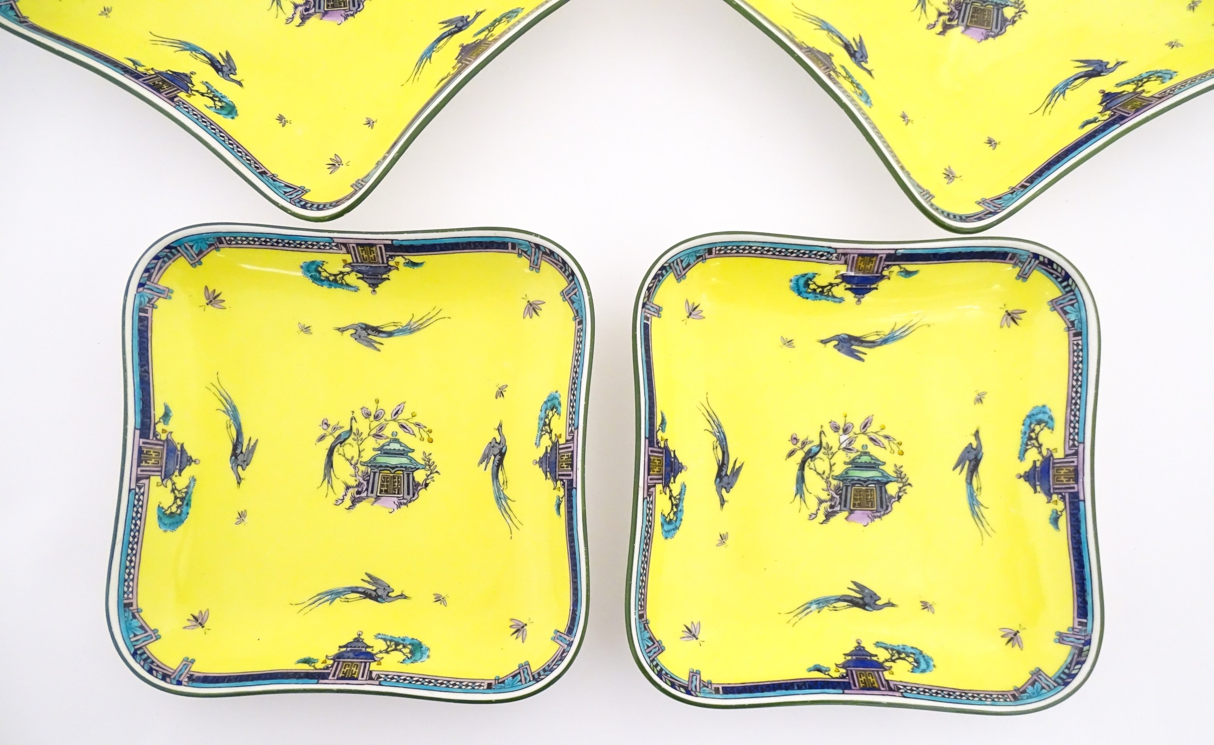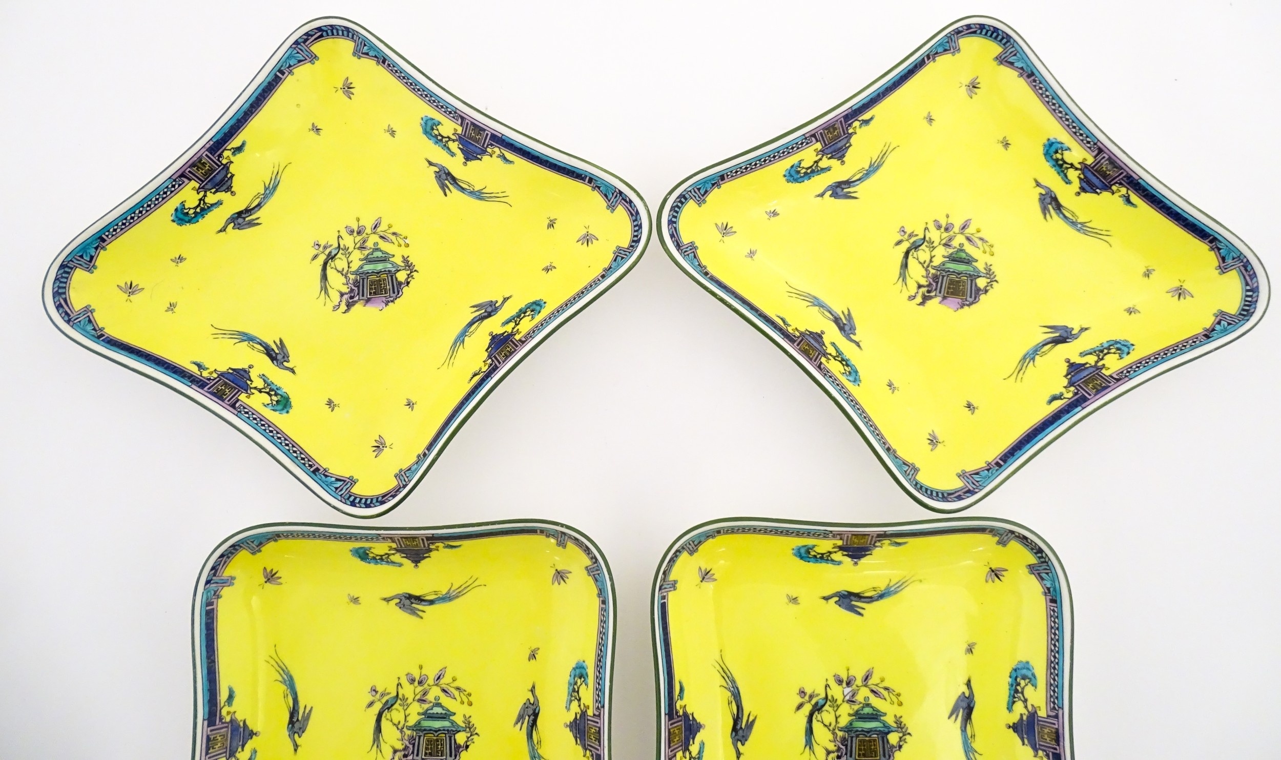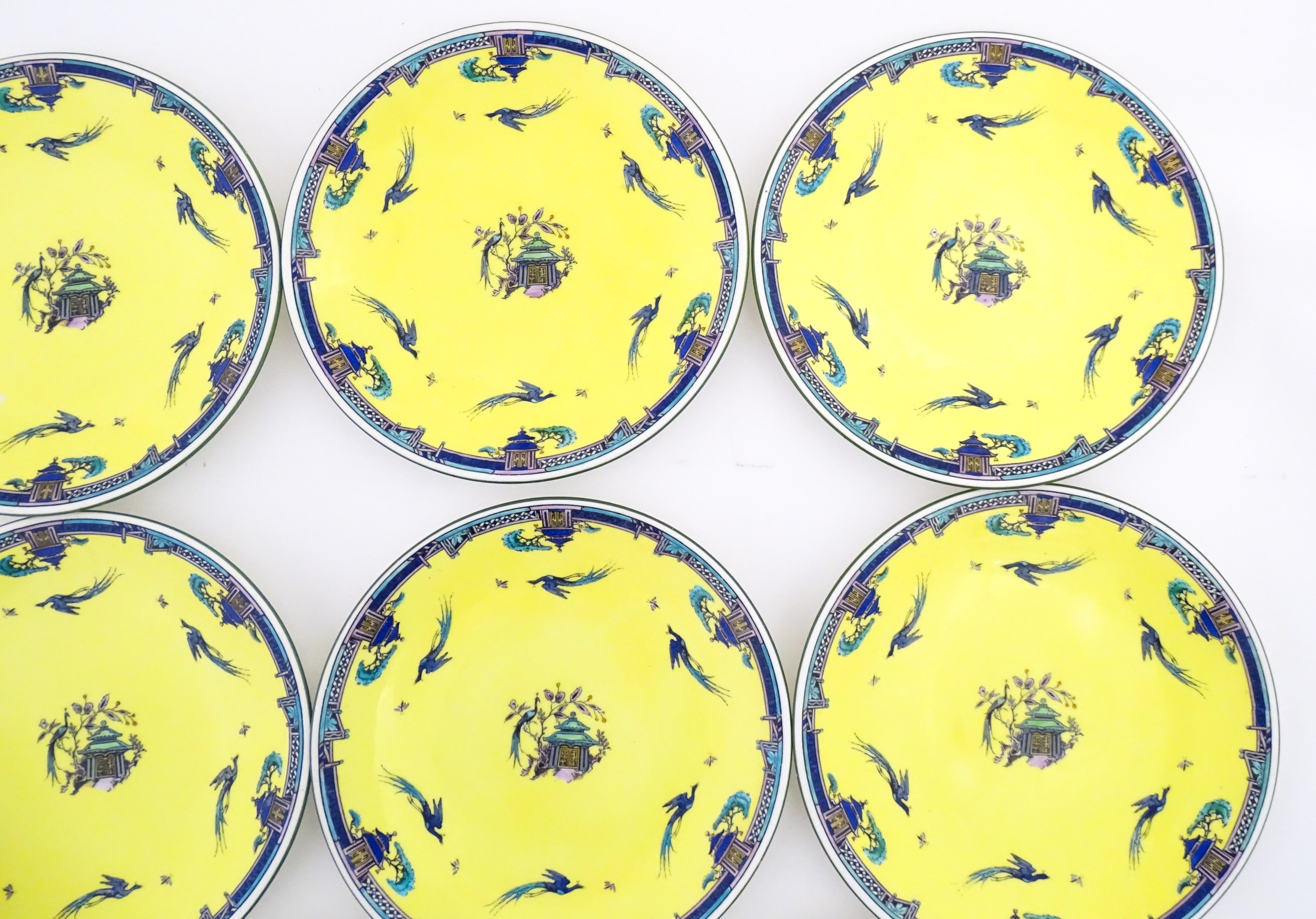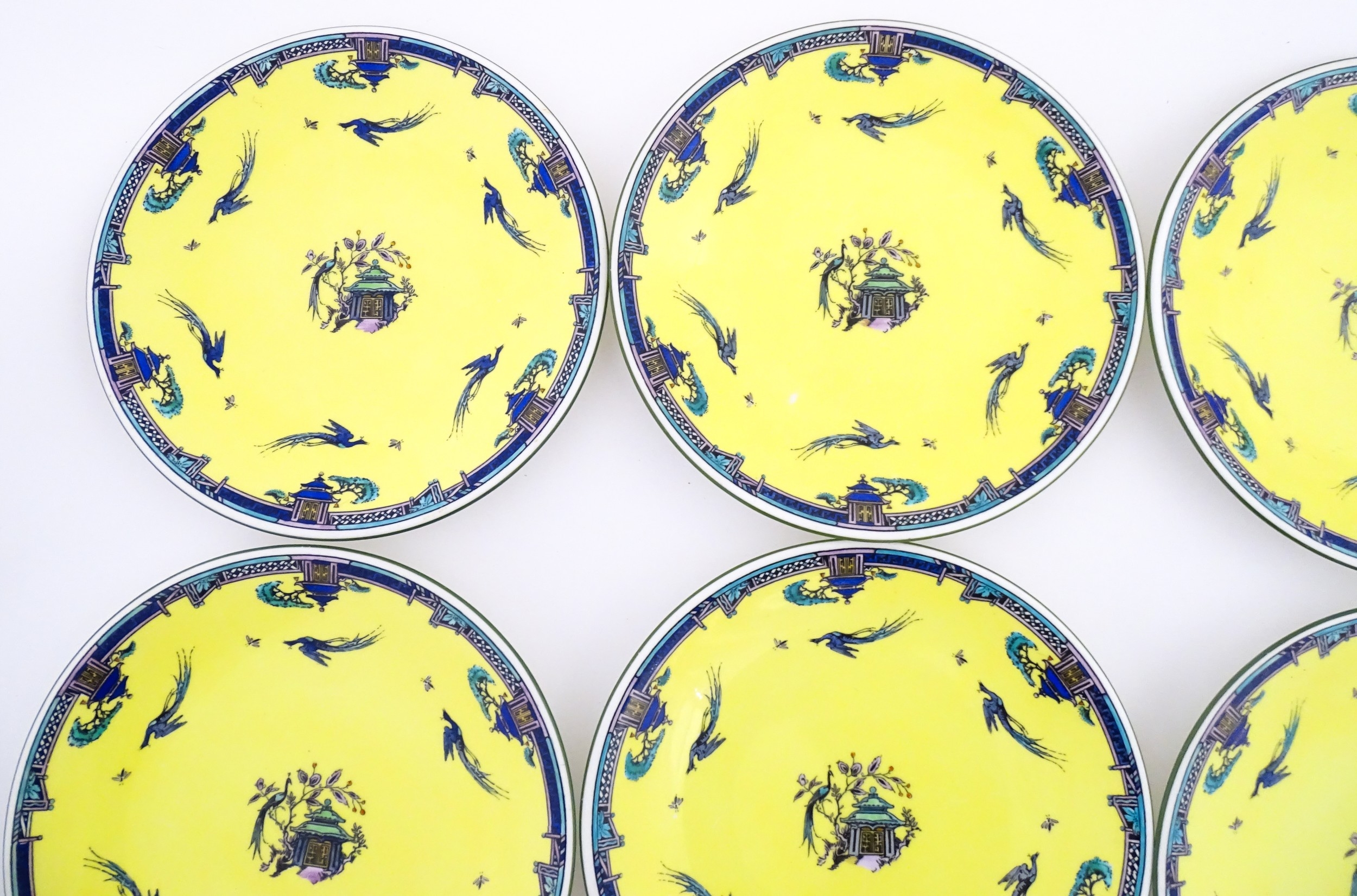 Fifteen Wedgwood yellow ground plates decorated with Chinoiserie temples and Asiatic pheasants. Marked under. Various shapes. Plates approx. 9" wide (15)