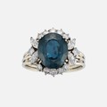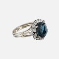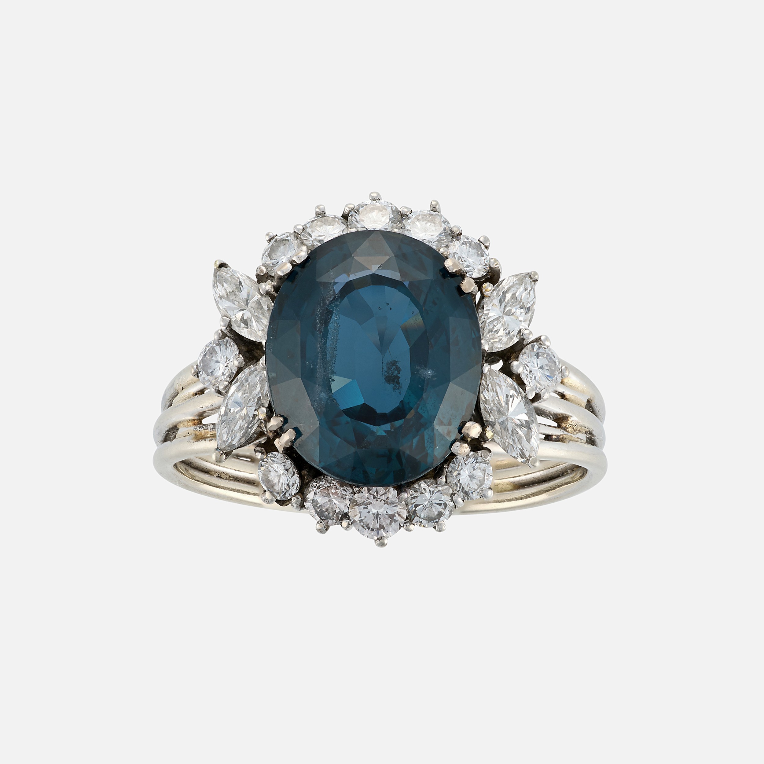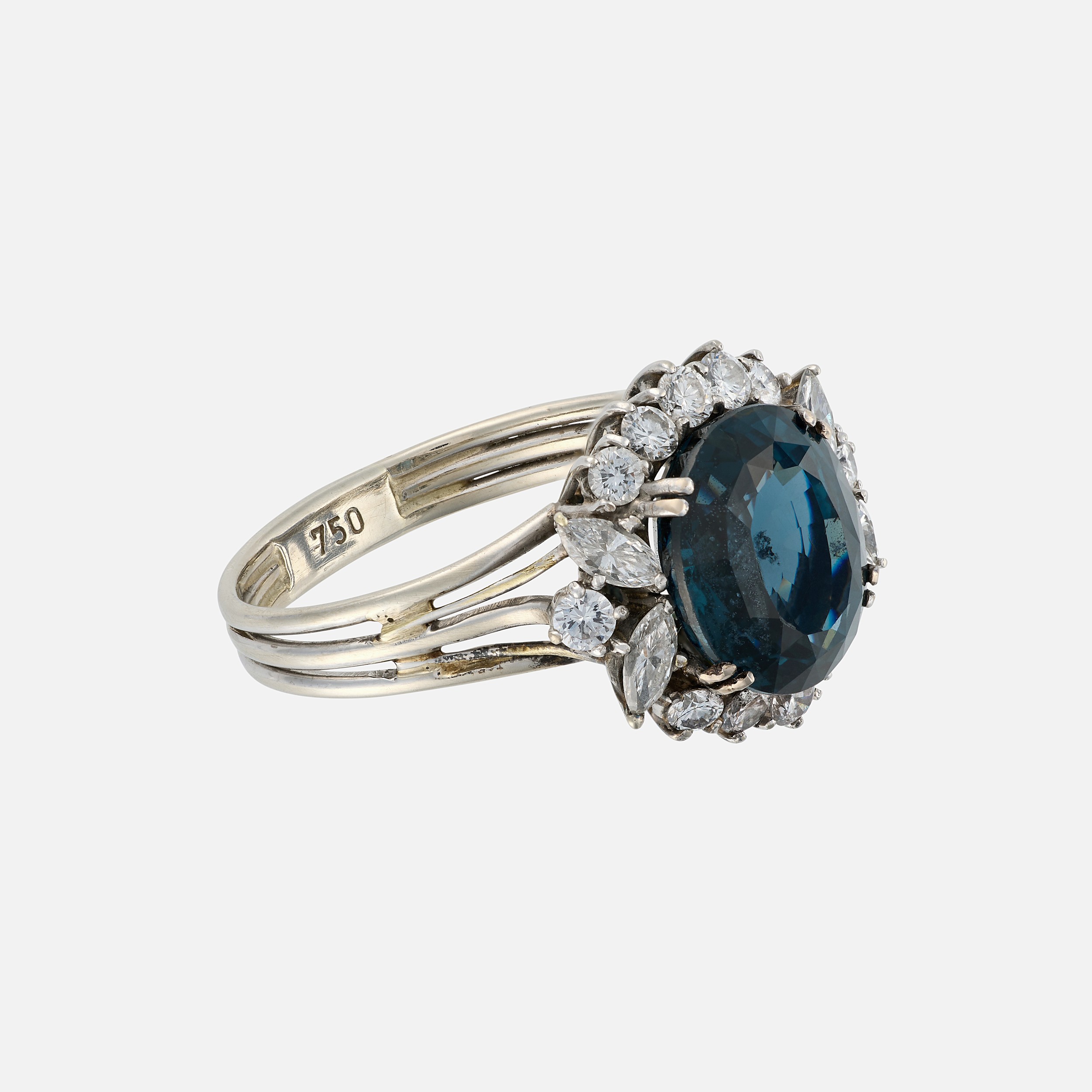 A Spinel and Diamond Cluster Ring in 18 carat white gold, set with a principal oval cut spinel of approximately 6.10 carats, within a border of round and marquise cut diamonds. Marked 750 for 18 carat gold.