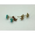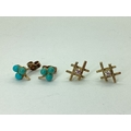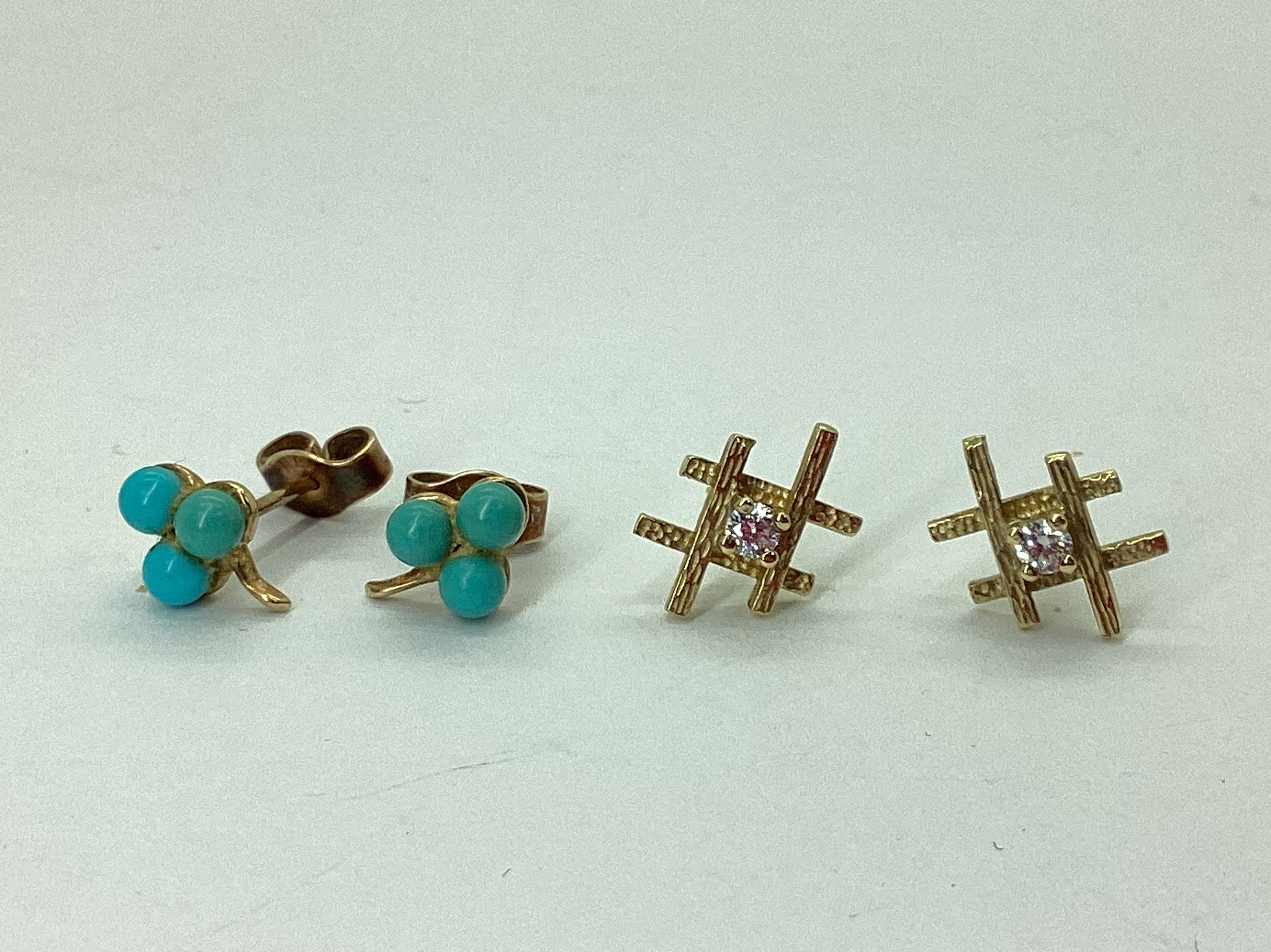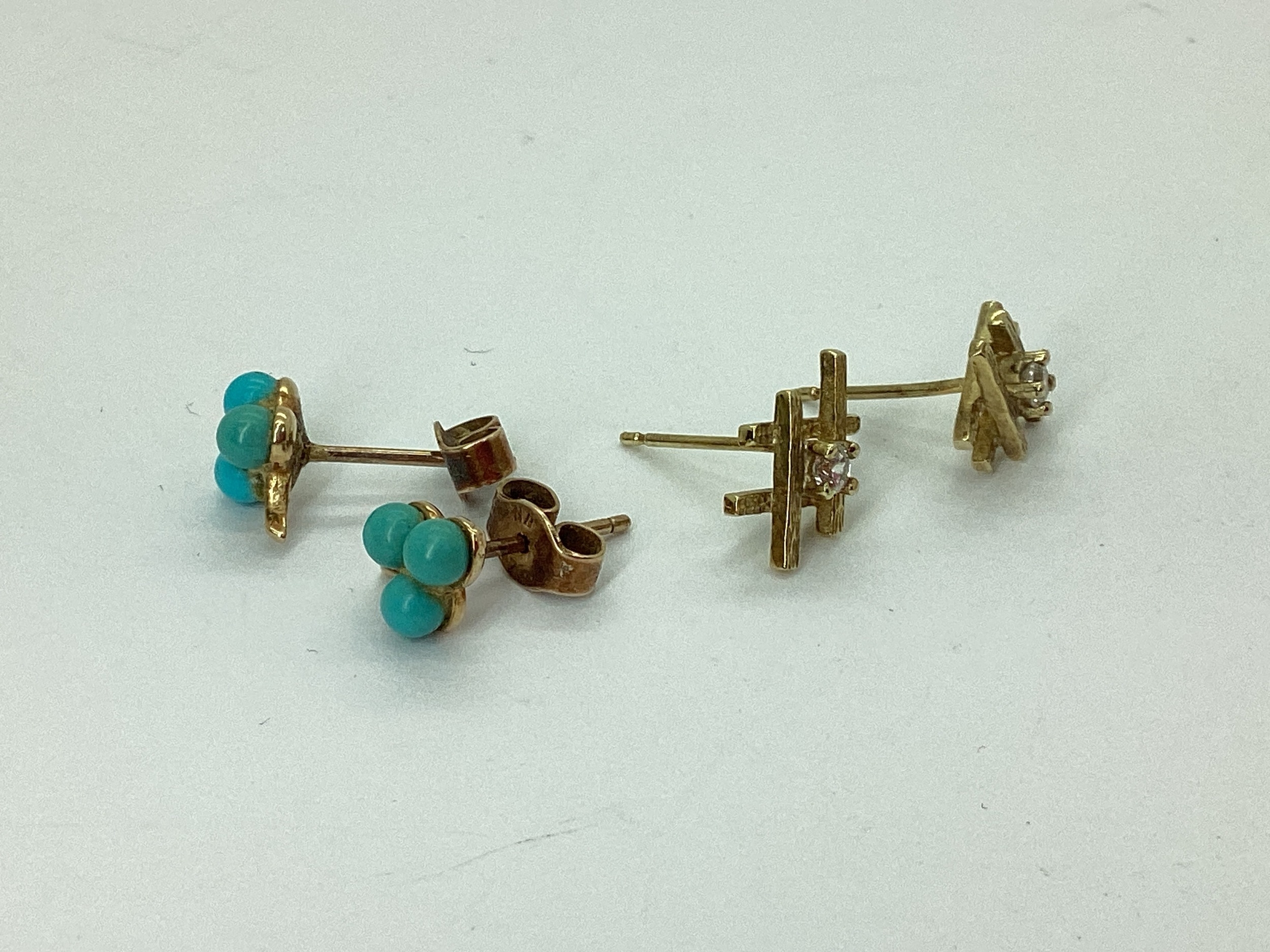 A Pair of Turquoise Coloured Earrings, of cabochon triangular form, to post and scroll fitting, indistinctly stamped "375"; Together with a Pair of Modernist Style Earrings, of crosshatch textured design, with claw set centre highlight, to post fitting (lacking scroll backs), stamped "375". [620072] [398757]