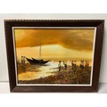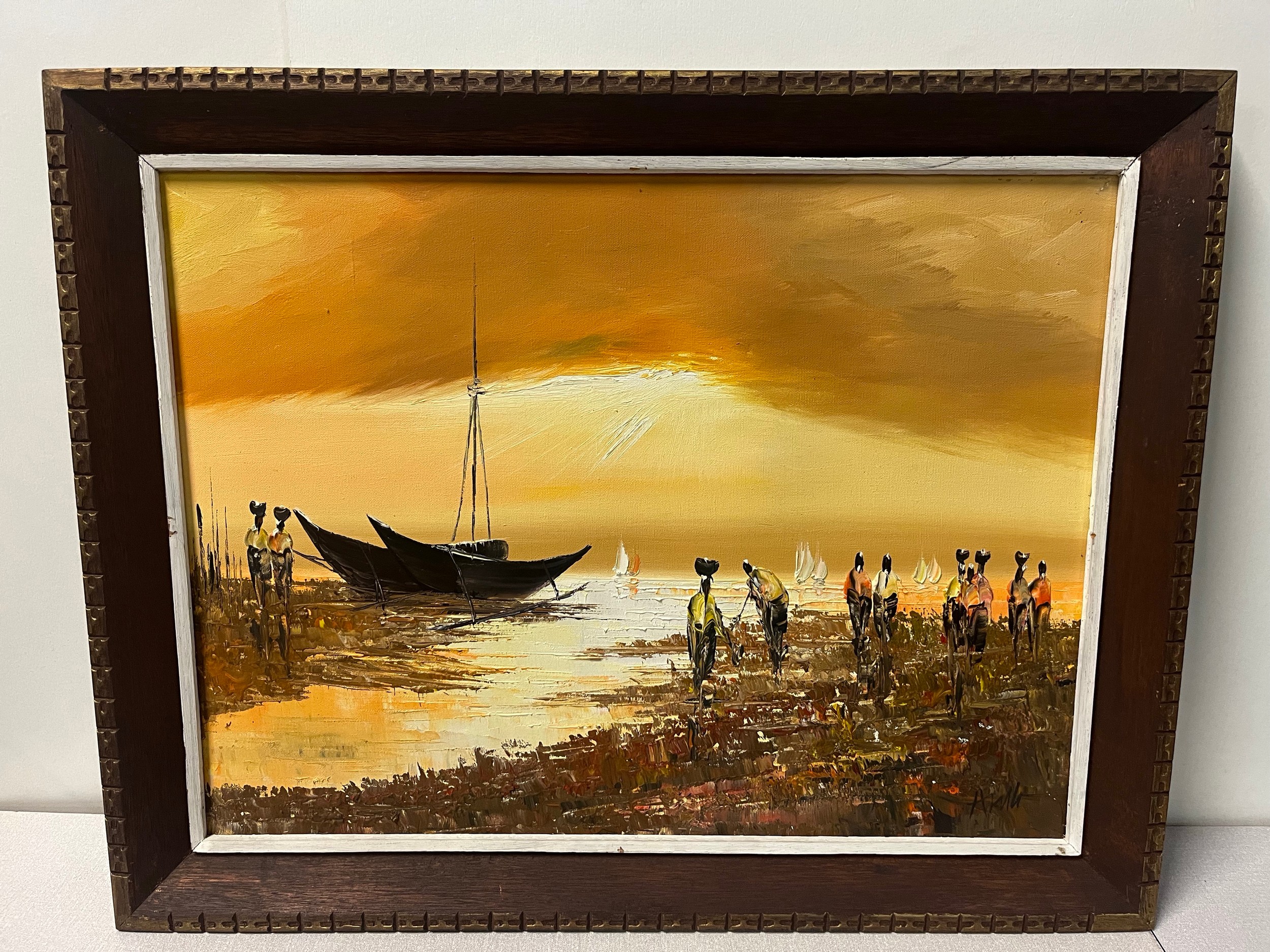 Original framed signed oil on canvas of nautical scene at sunset, 28x22".