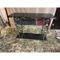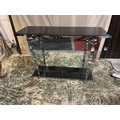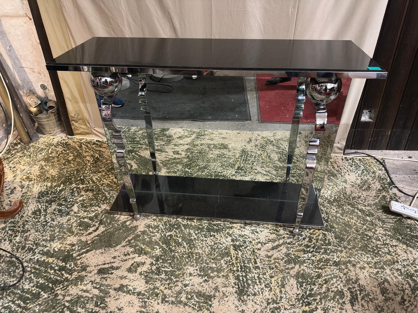Decorative Chrome & Mirror Glass Consul Table with Black Fleck Marble Top also Granite Base "cracked"