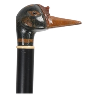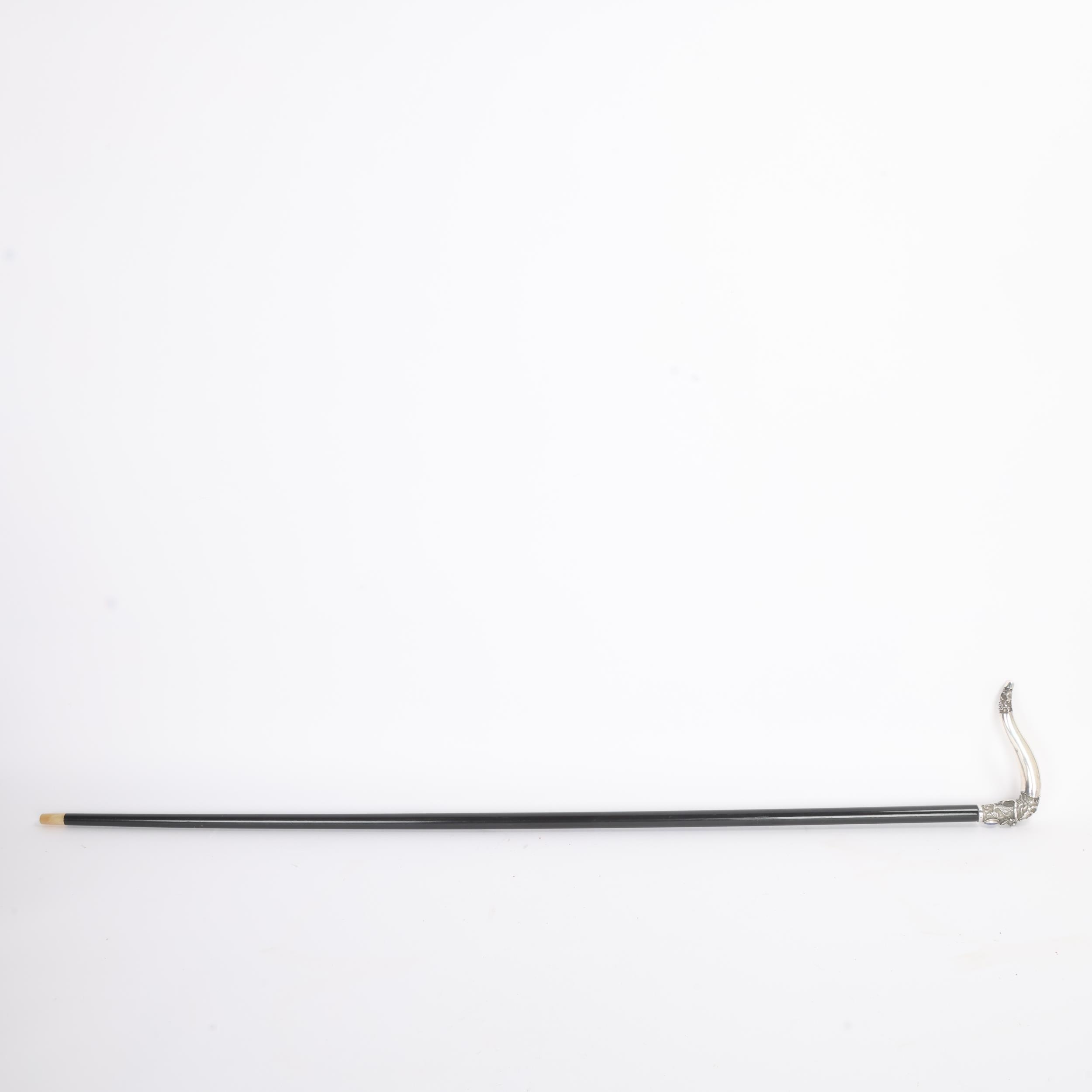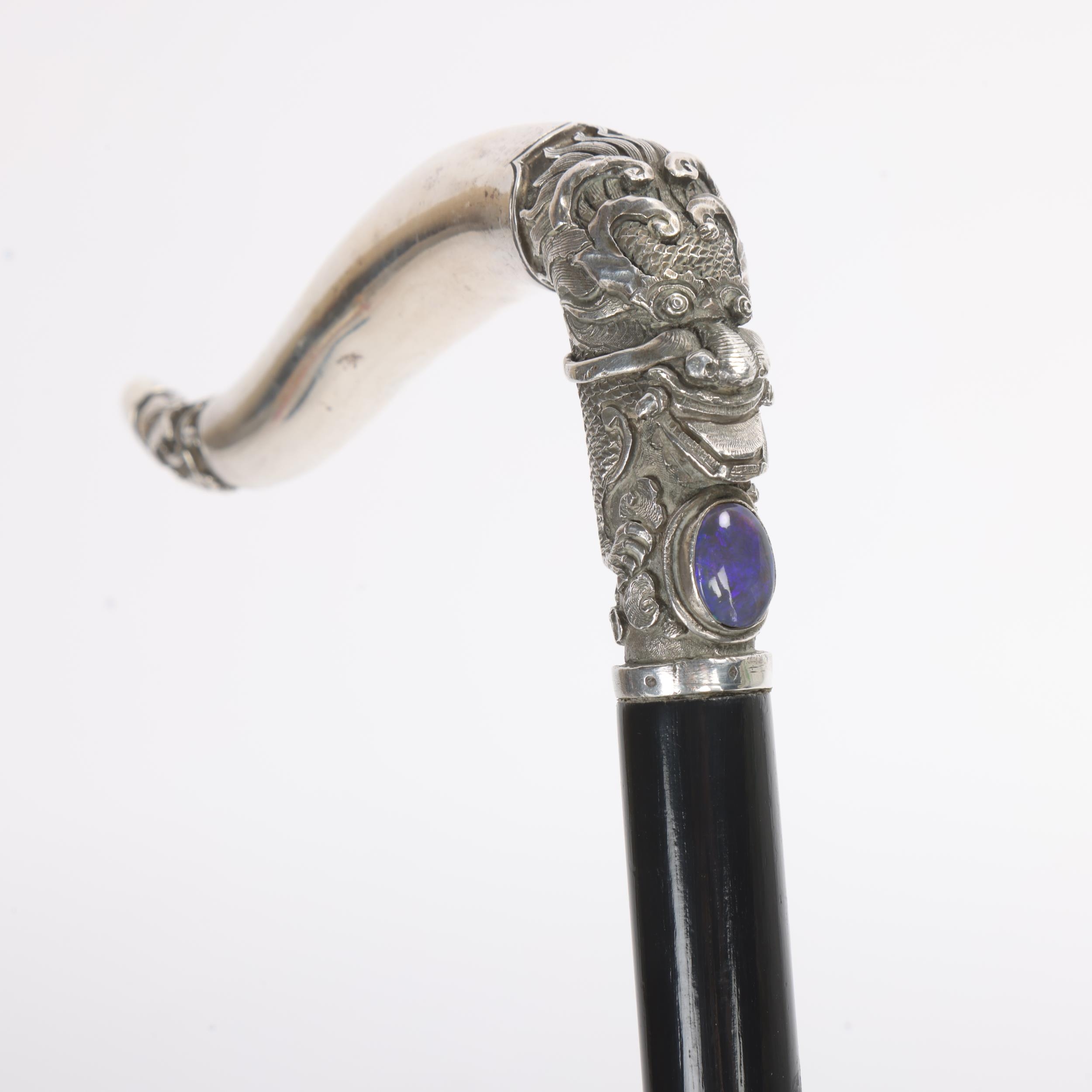 A Chinese silver tau-handle cane, with a raised, horned and whiskered five-toed dragon holding an oval opal cabochon, the handle terminal with a raised floral design, stained and varnished hardwood shaft, blonde cow horn ferrule, Chinese circa 1890s, length 91cm