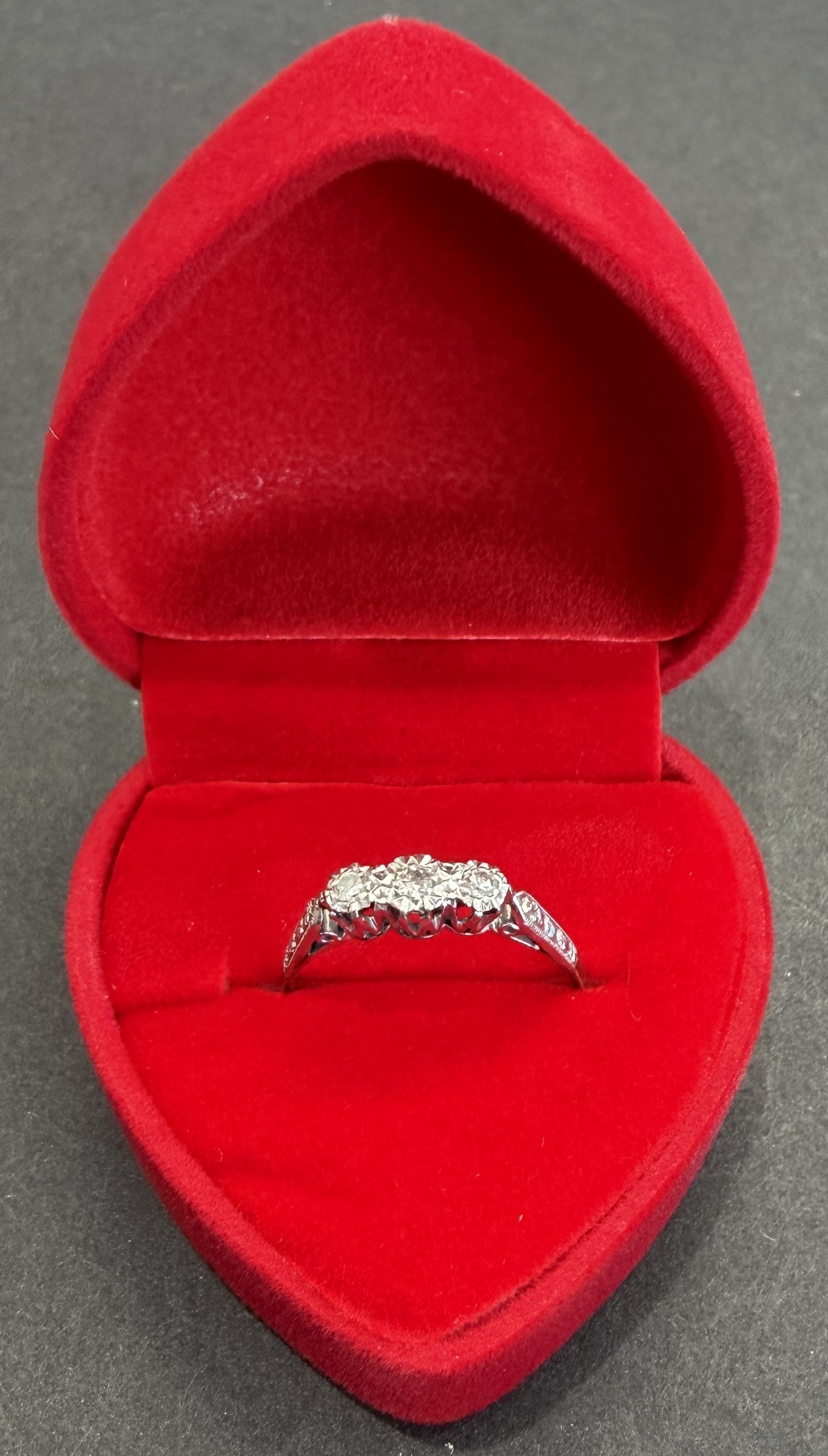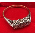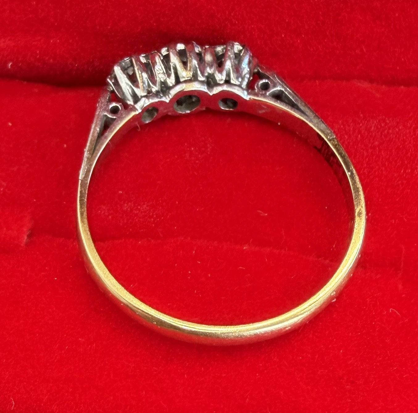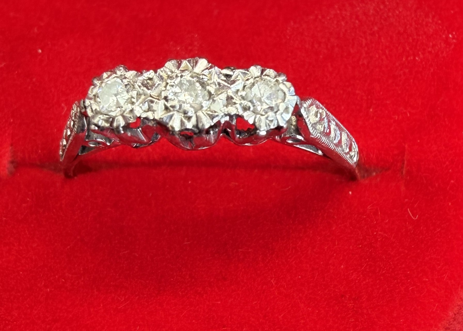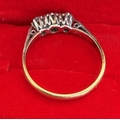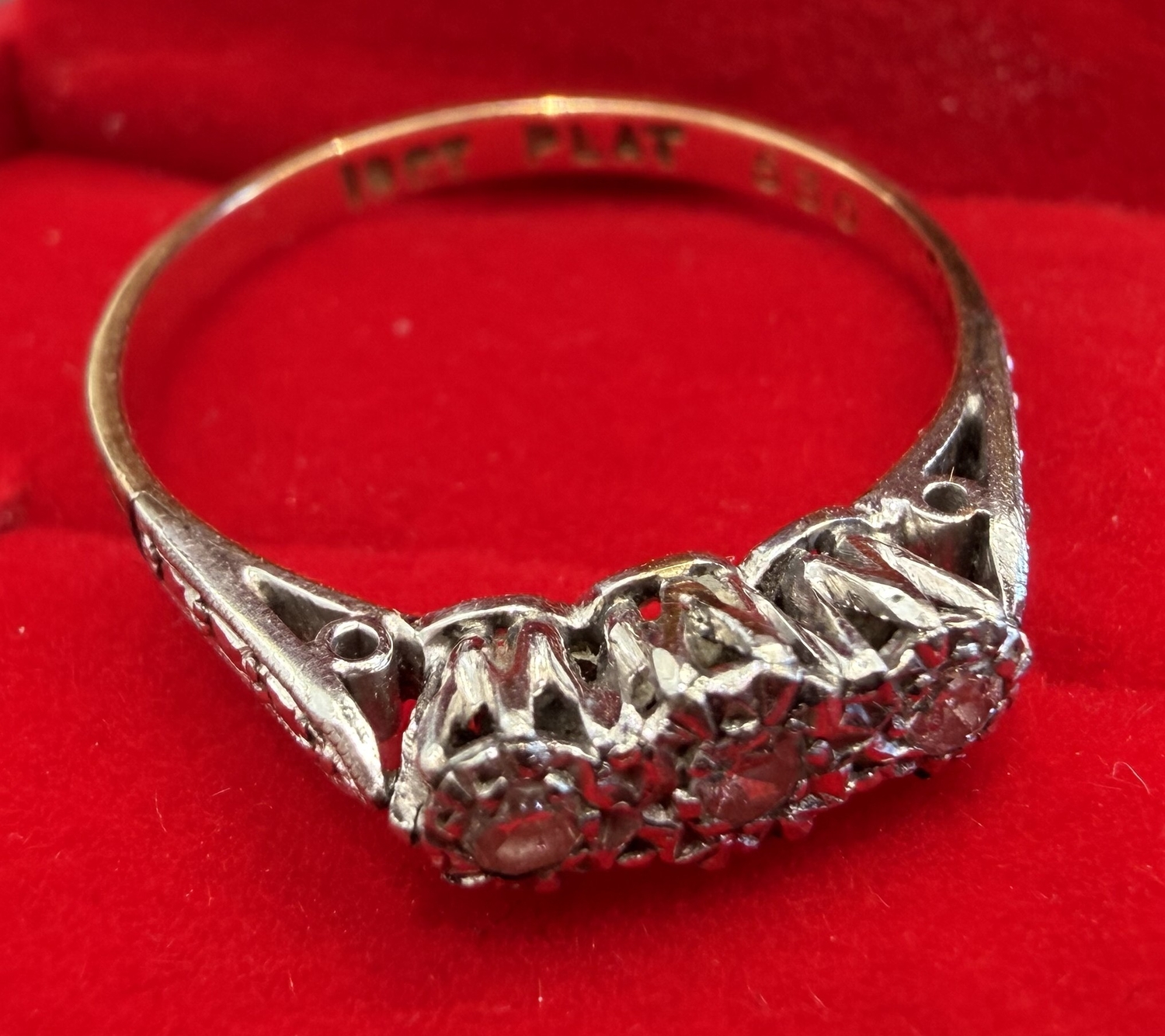 Jewellery : 18ct Gold triple diamond ring marked 18ct PLAT (assumed this is the platinum setting) 1.95g Size O tests as 18ct and diamonds tested PLEASE MAKE SURE YOU READ TERMS AND CONDITIONS REGARDS PAYMENT OPTIONS, CARD NOT PRESENT TRANSACTIONS NOT ACCEPTED ON GOLD JEWELLERY OR WATCHES.