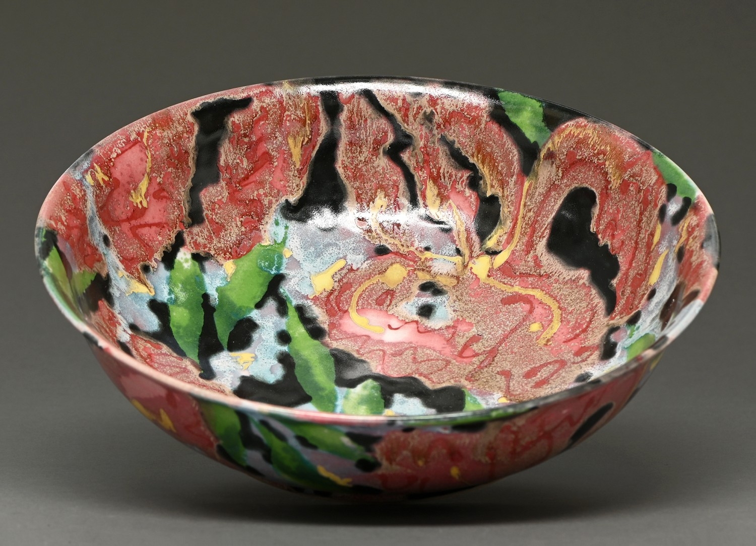 Studio Pottery. Janice Tchalenko (1942-2018) - Bowl, thrown stoneware decorated with a stylised floral design in a polychrome glaze, 36cm diam