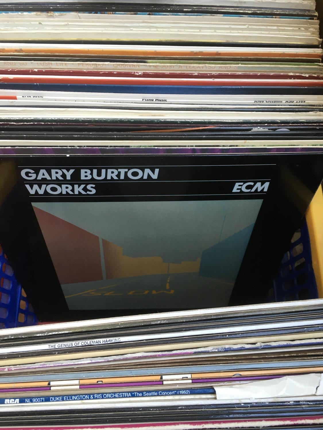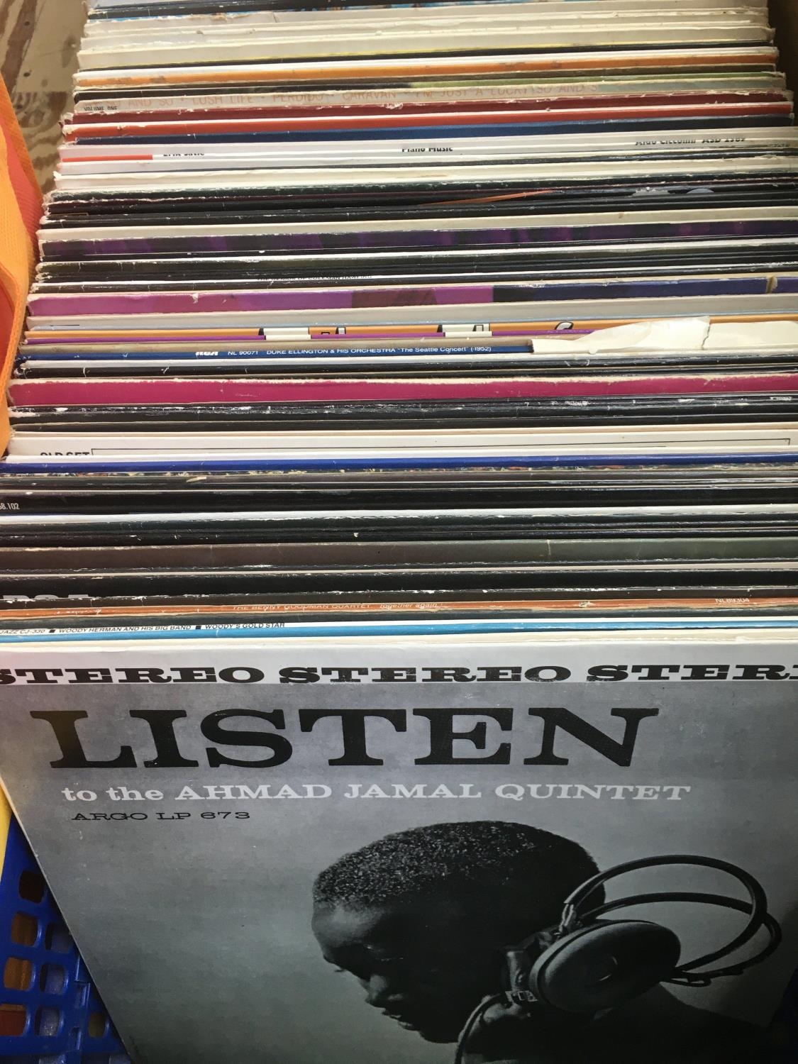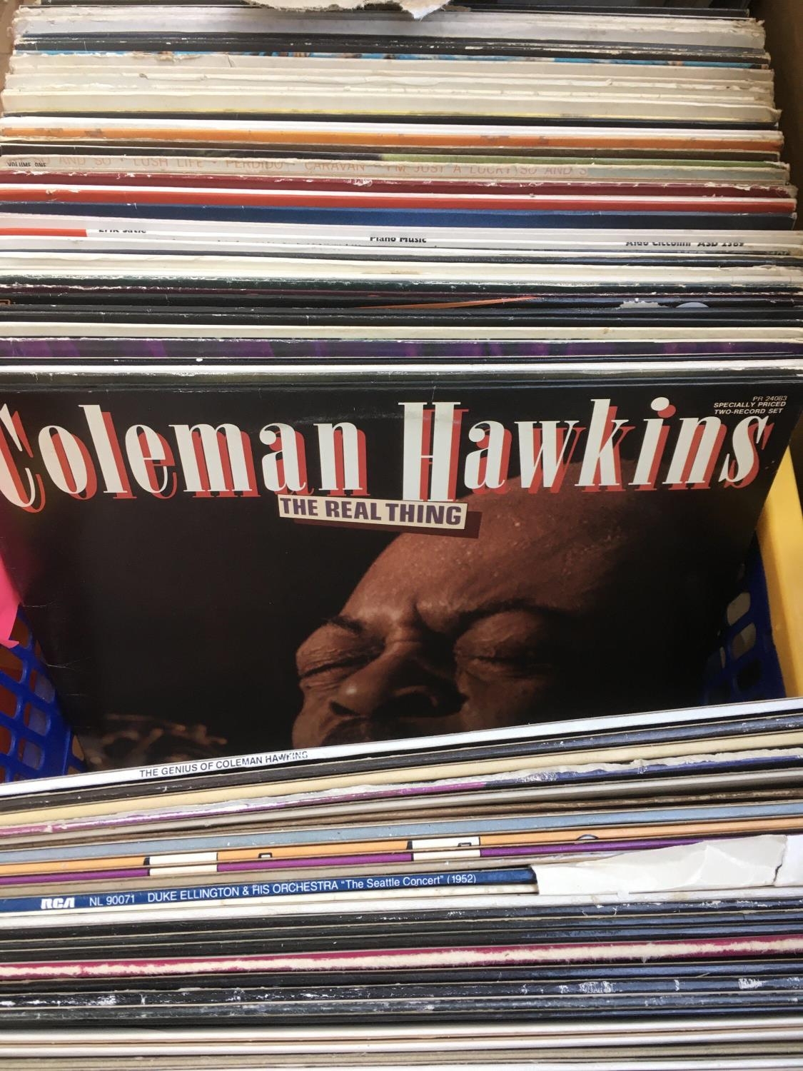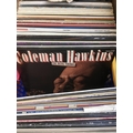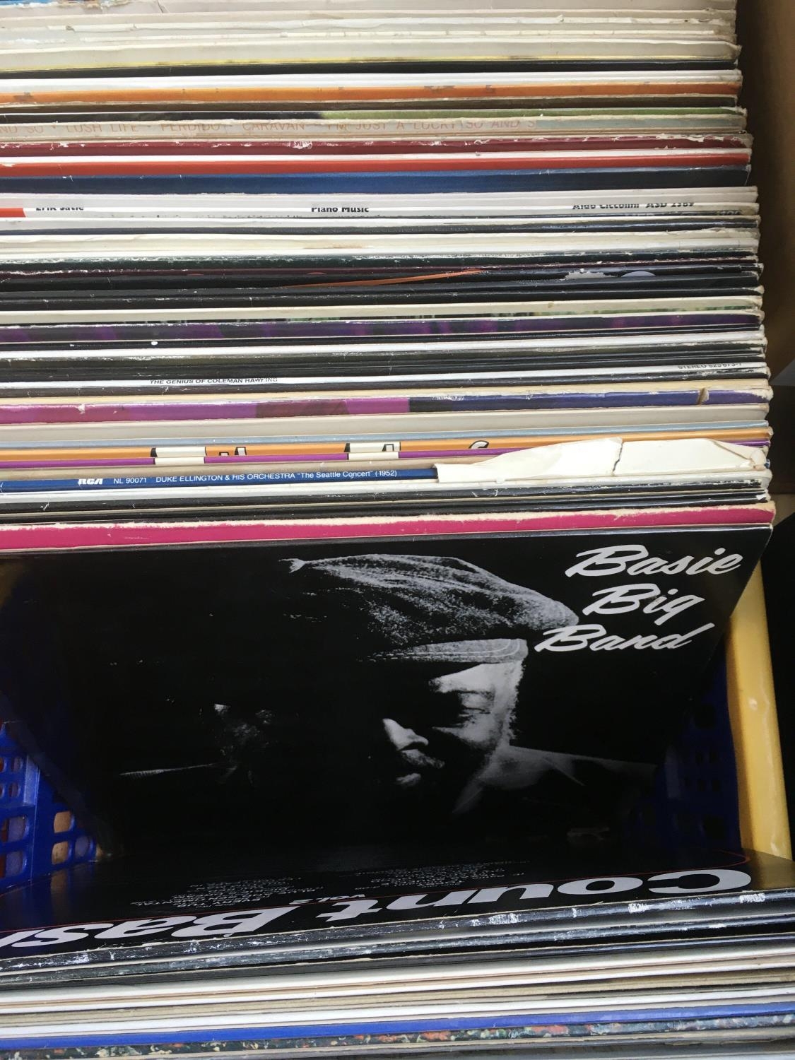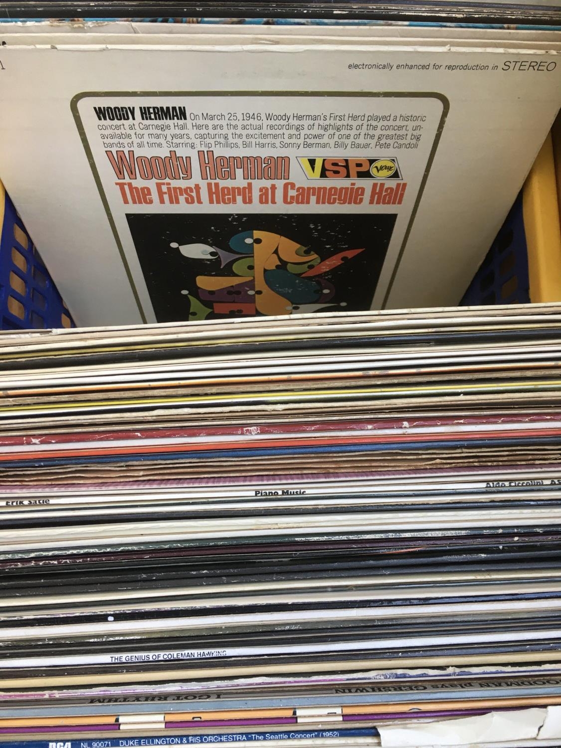 A box of mainly jazz LPS by various artists including Dizzy Gillespie, Woody Herman, Count Basie and others.