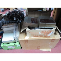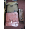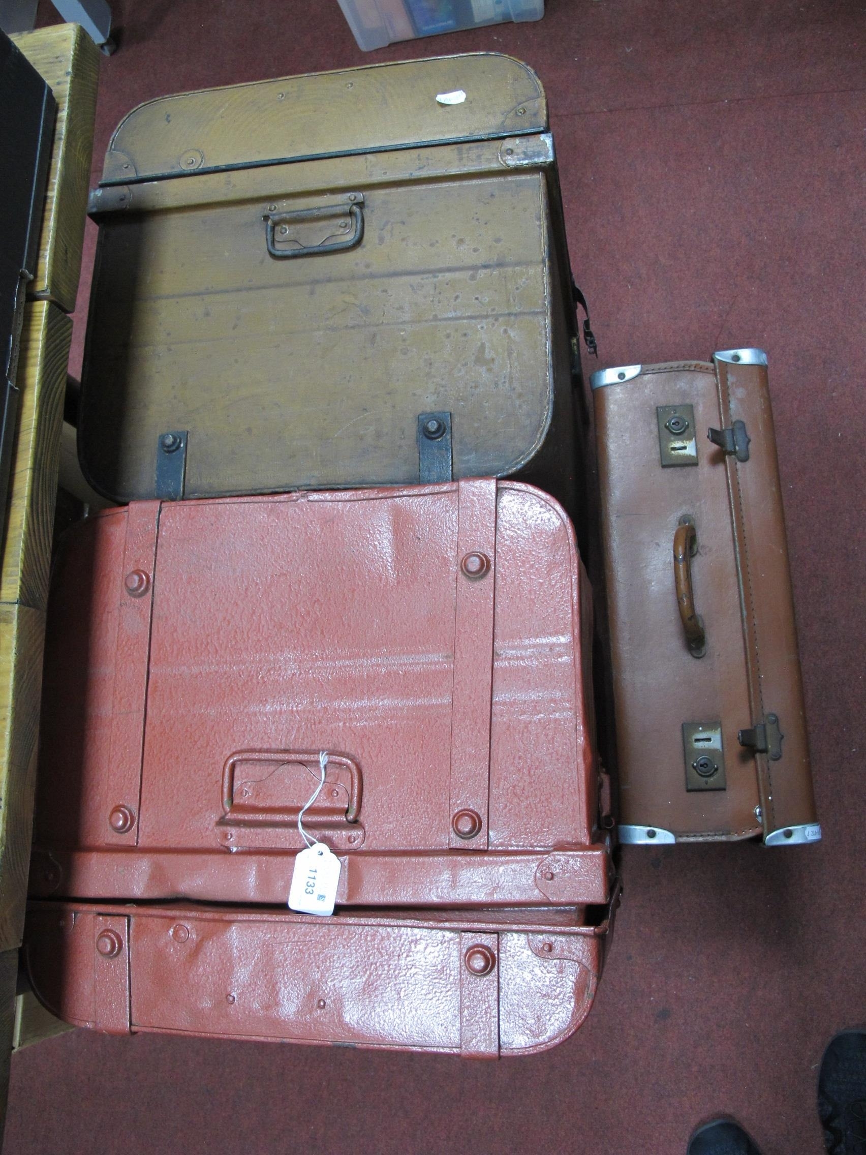 Two Large Metal Trunks Painted Red and Brown (W66×D44×H39cm and W61×D42×H41cm), together with a leather rigid suitcase (W51×D33×H17cm). (3)