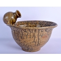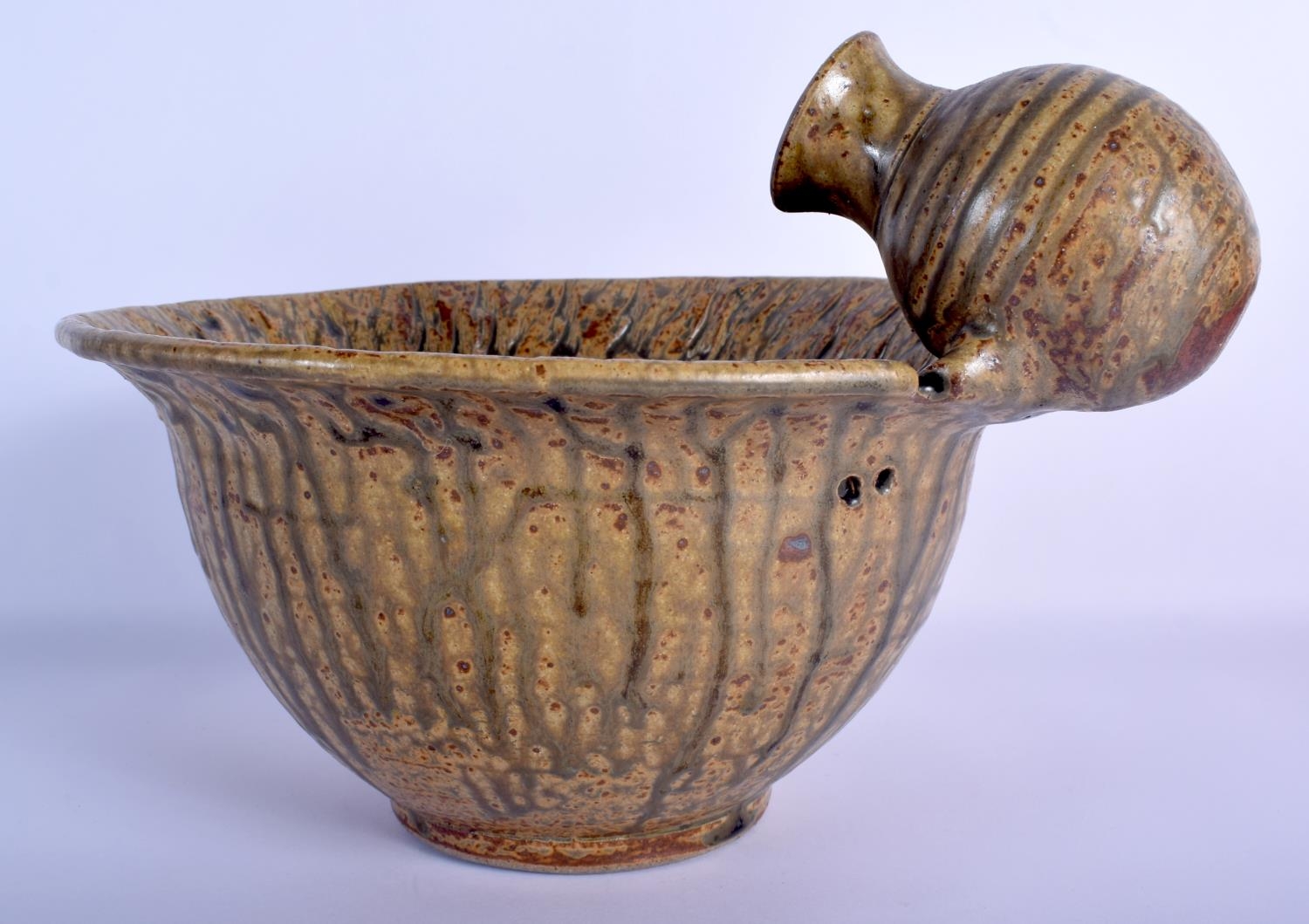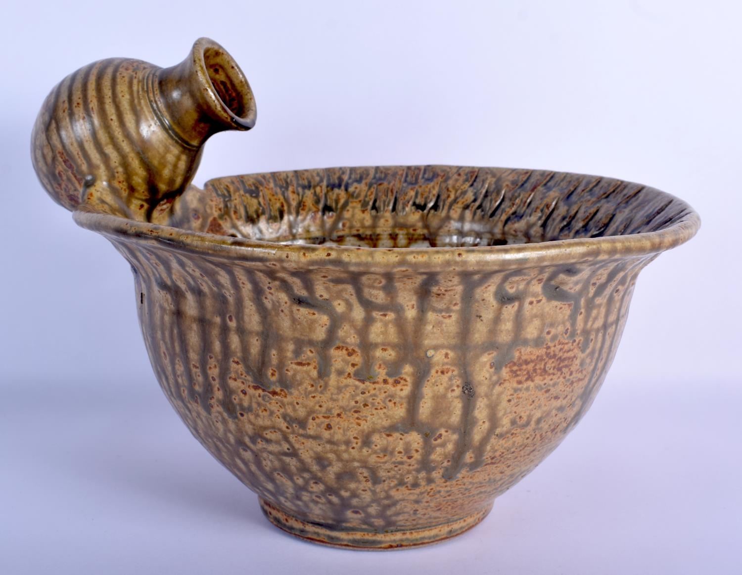 AN UNUSUAL STUDIO POTTERY STONEWARE BOWL unusually modelled with an overlaid amphora. 21 cm x 27 cm.