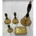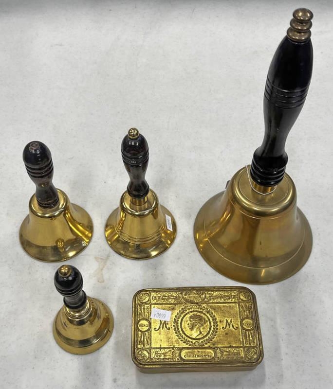 GRADUATED SET OF 4 HAND BELLS AND A CHRISTMAS 1914 TIN