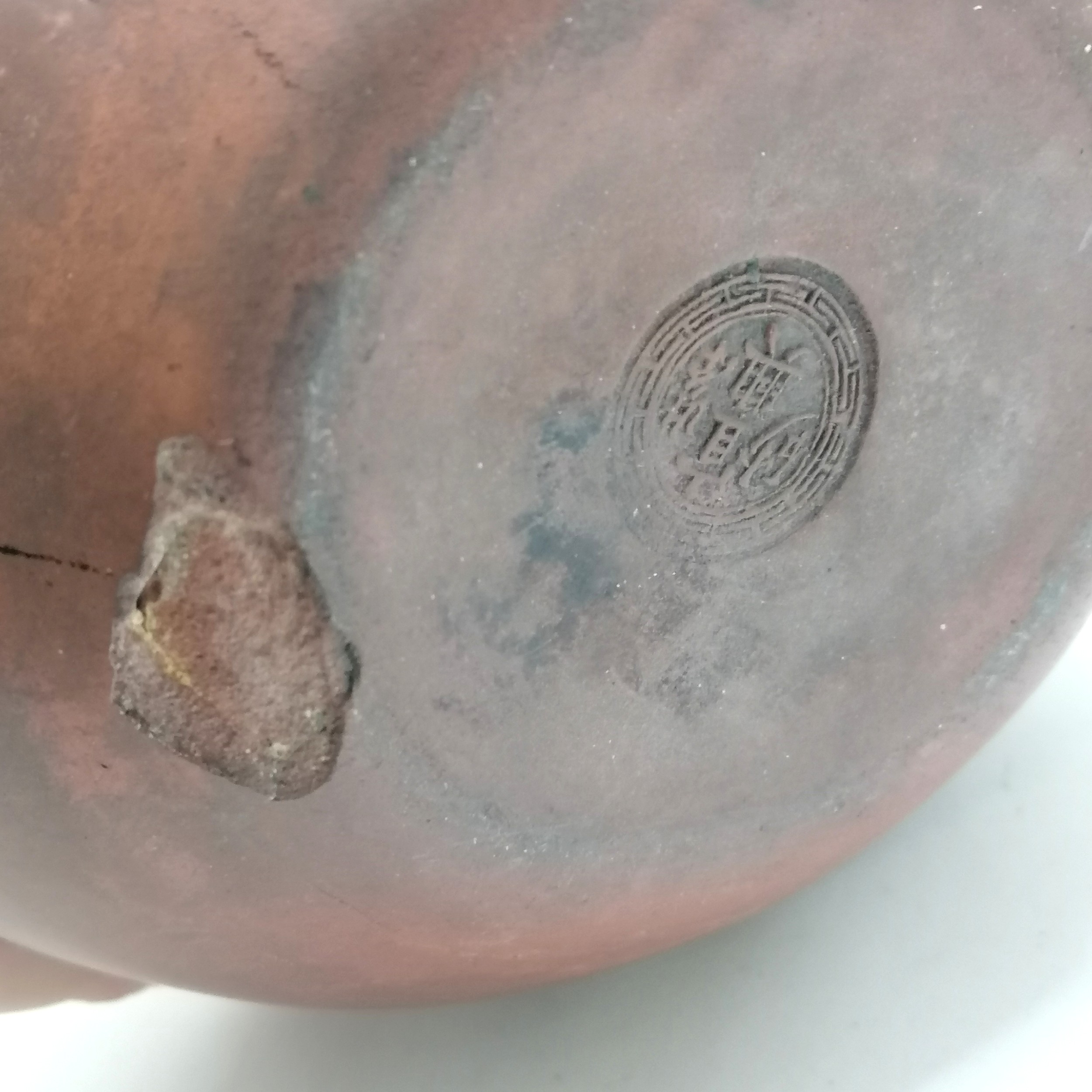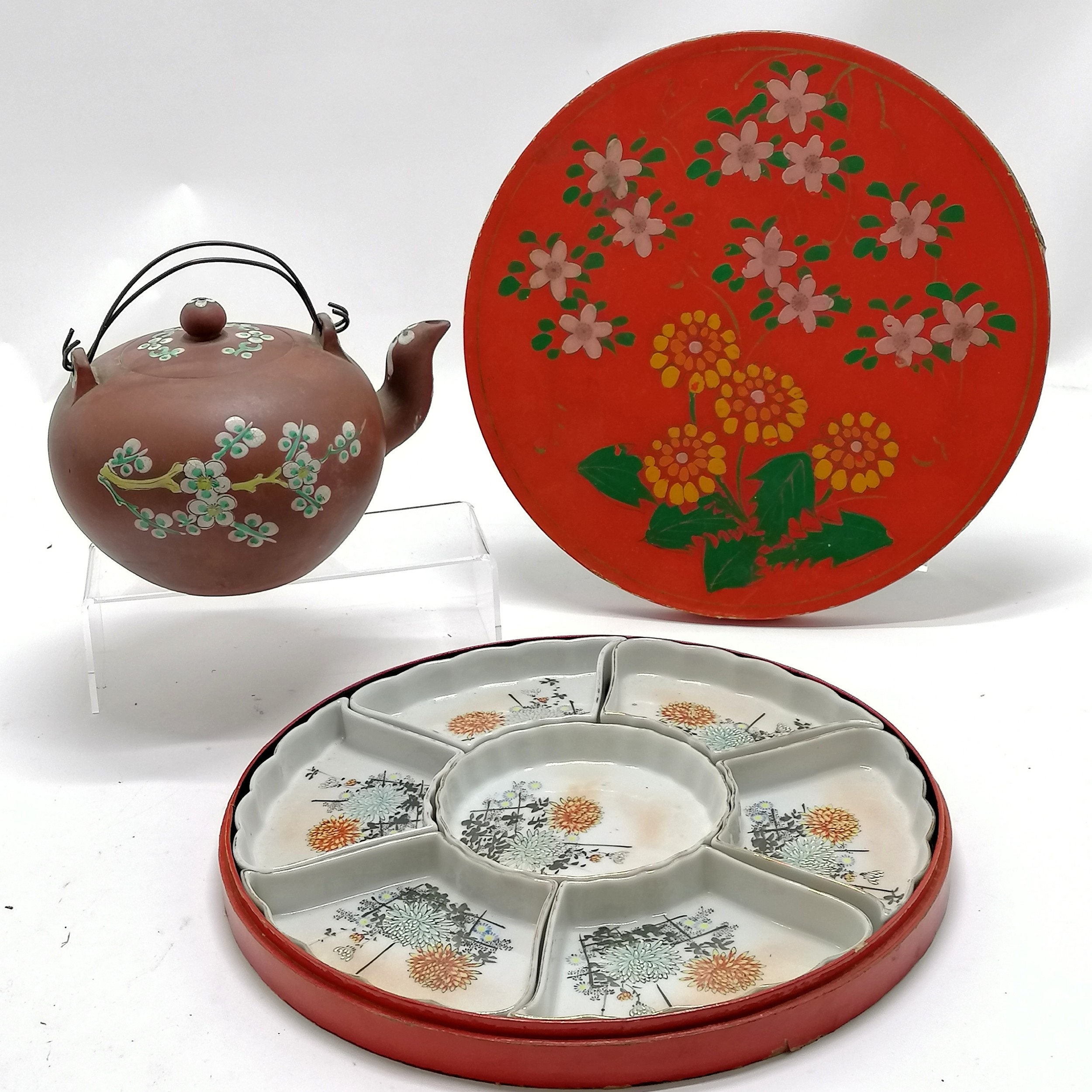 Antique Chinese terracotta tea kettle with enamel flower detail t/w hors d'oeuvres set in red lacquer box (31.5cm diameter) ~ both slight a/f