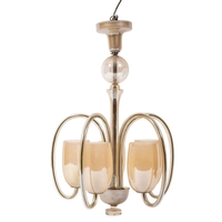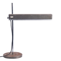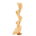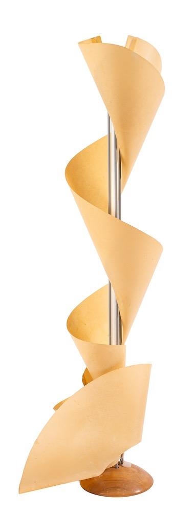 A metal and oatmeal fabric standard lamp, circa 1970s; the stitched shade spiralling down around the straight shaft, housing a light fitment; to a domed beech base; 171cm high