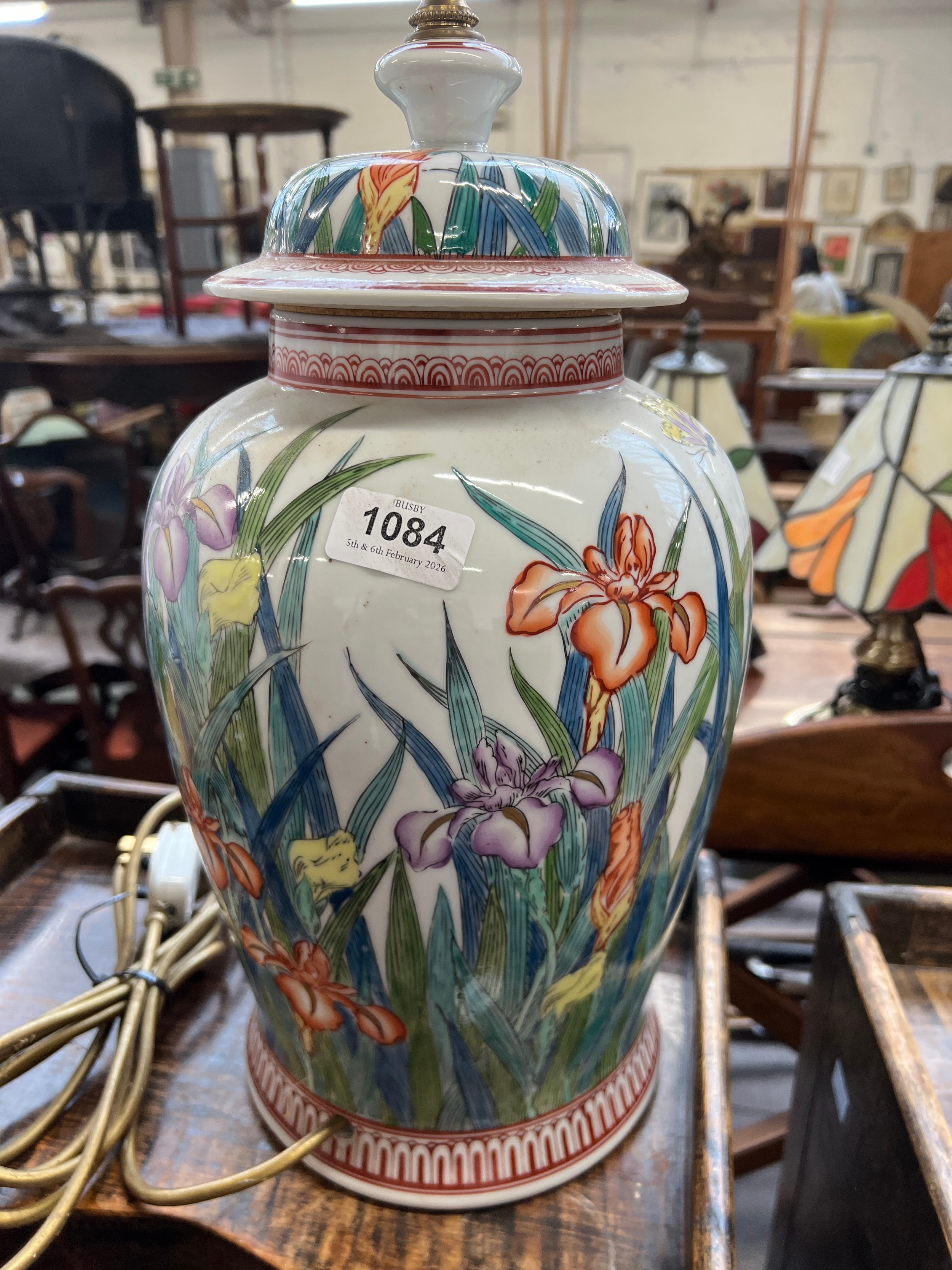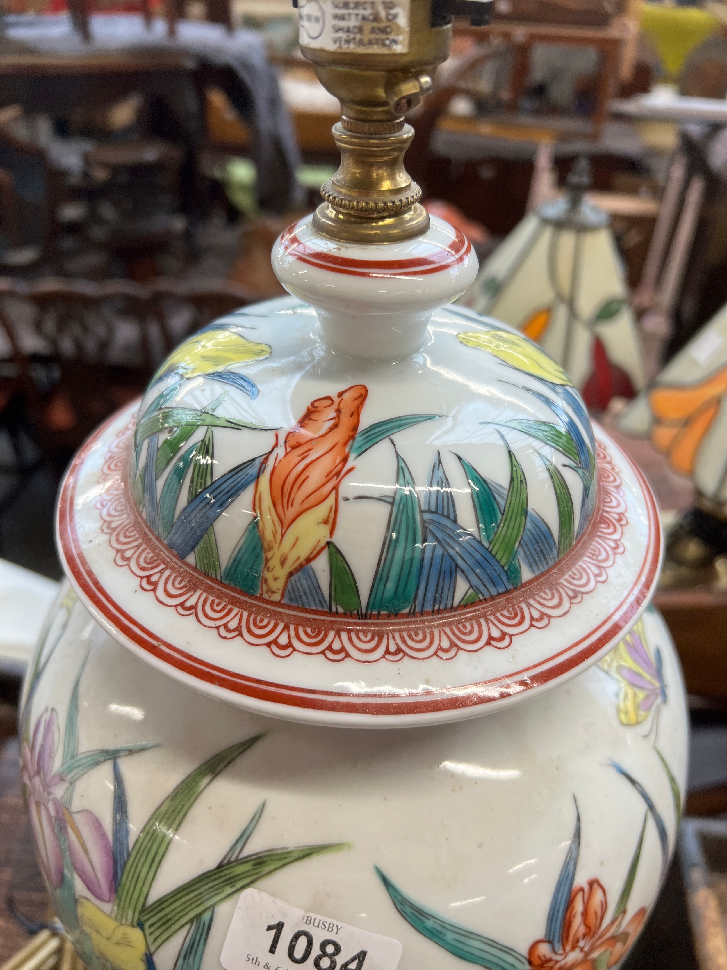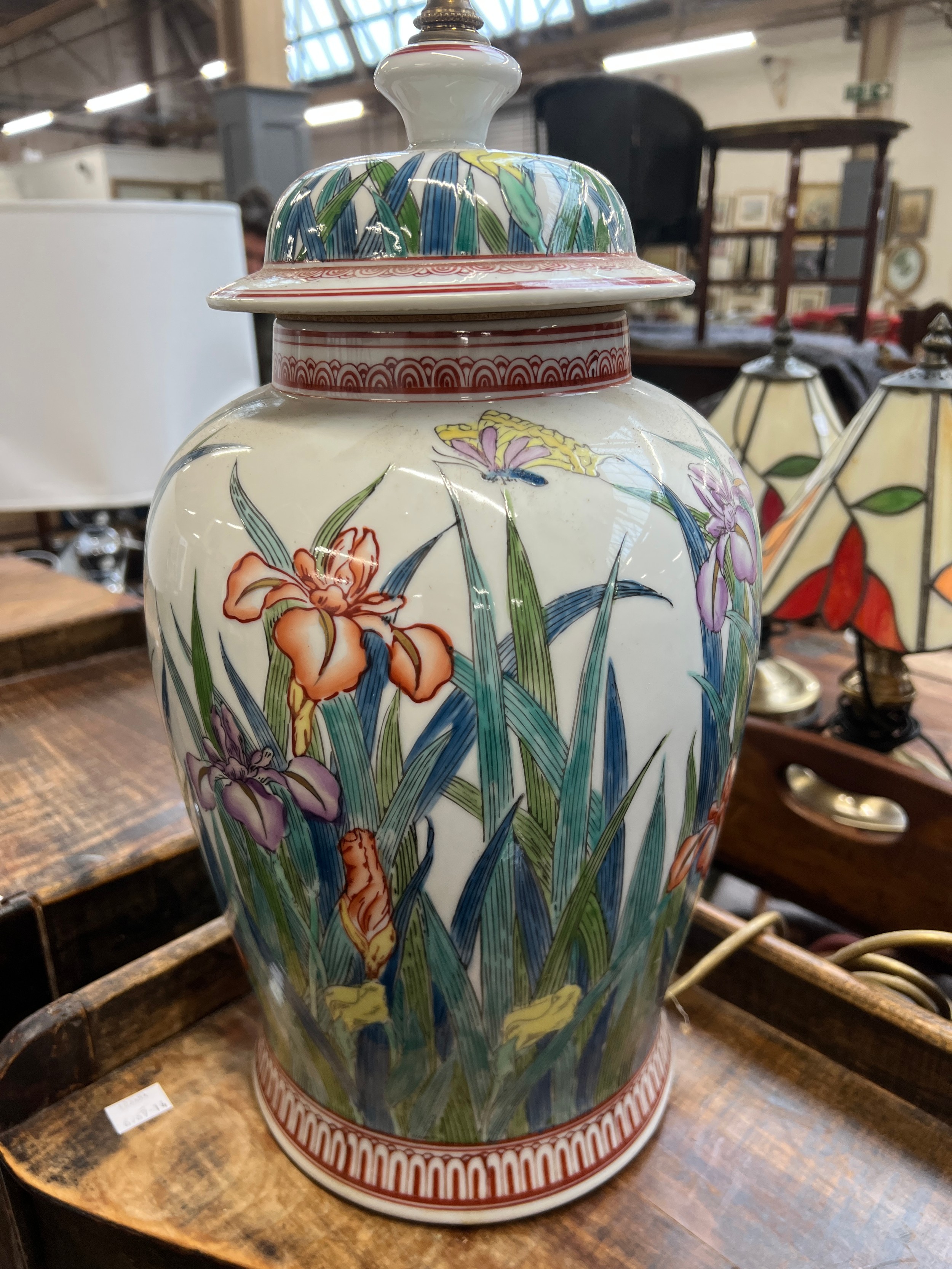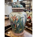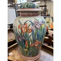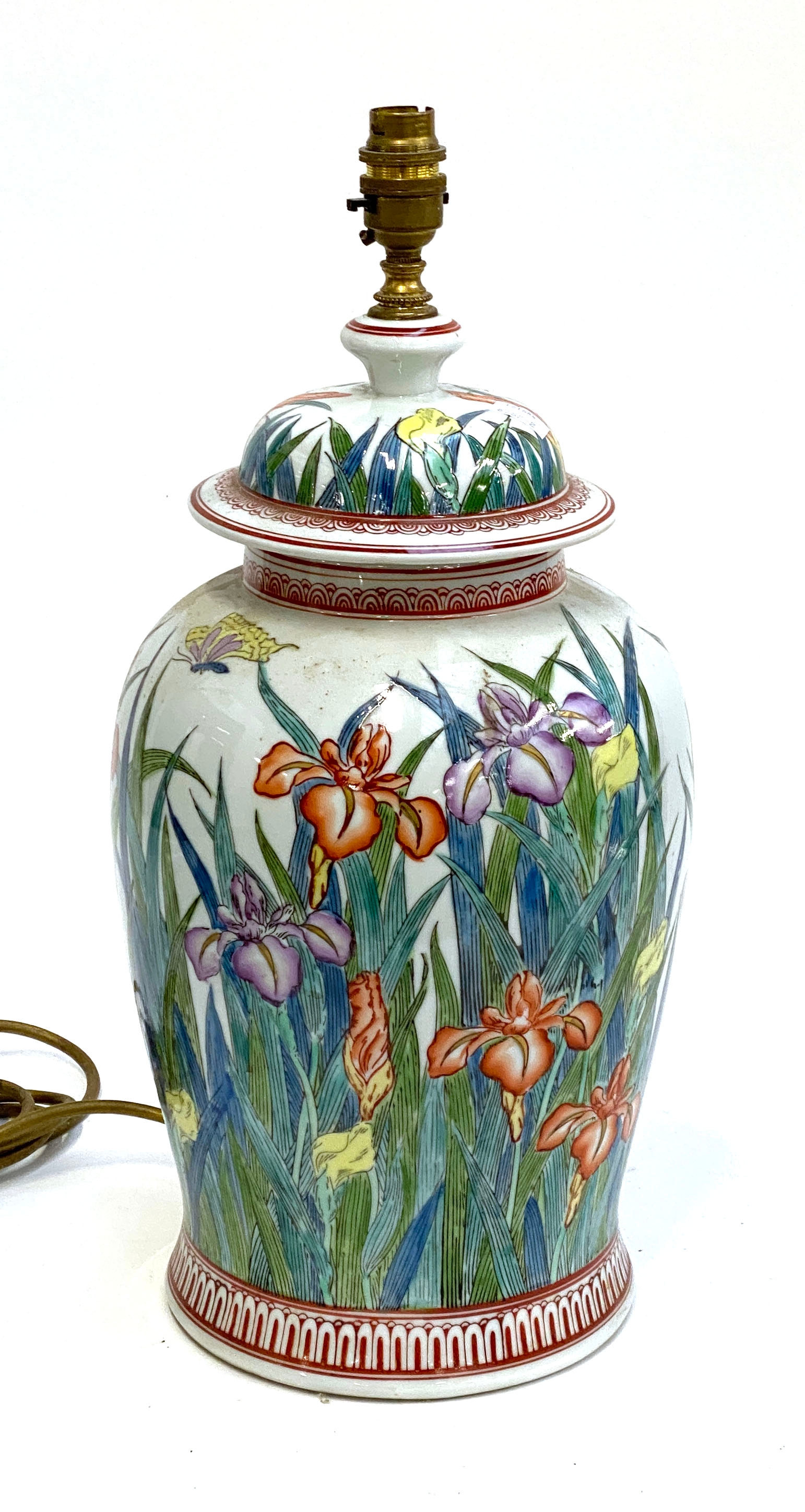 A large ceramic table lamp decorated with irises, 40cmH to base of fitting