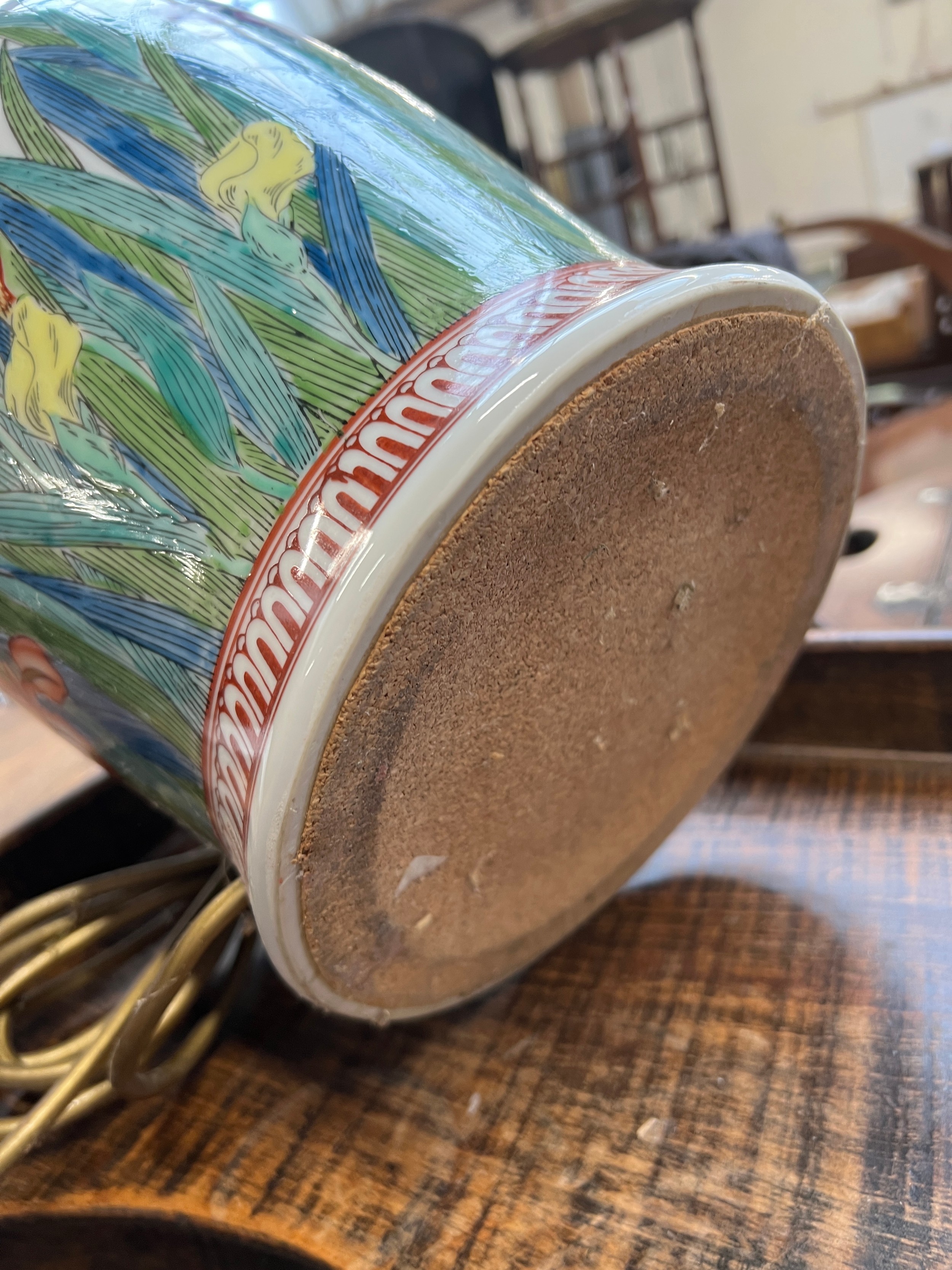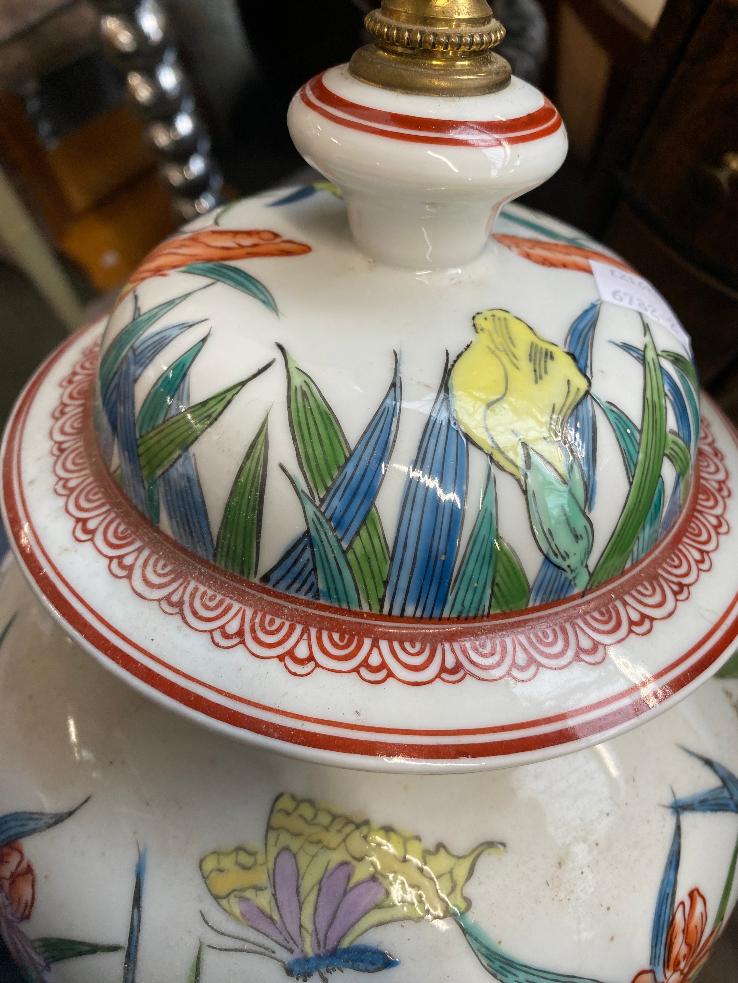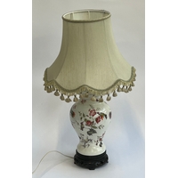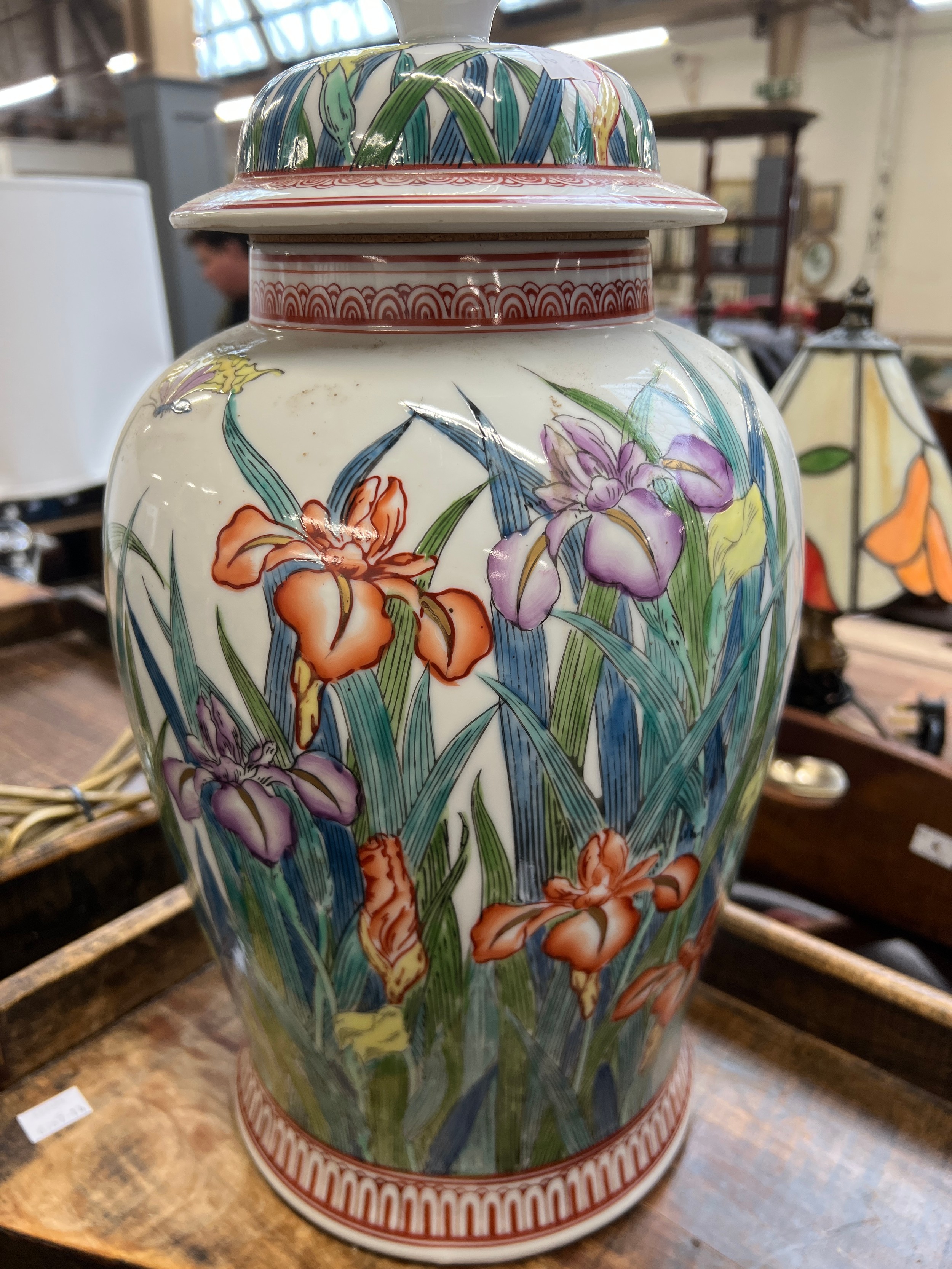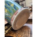 A large ceramic table lamp decorated with irises, 40cmH to base of fitting