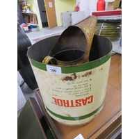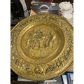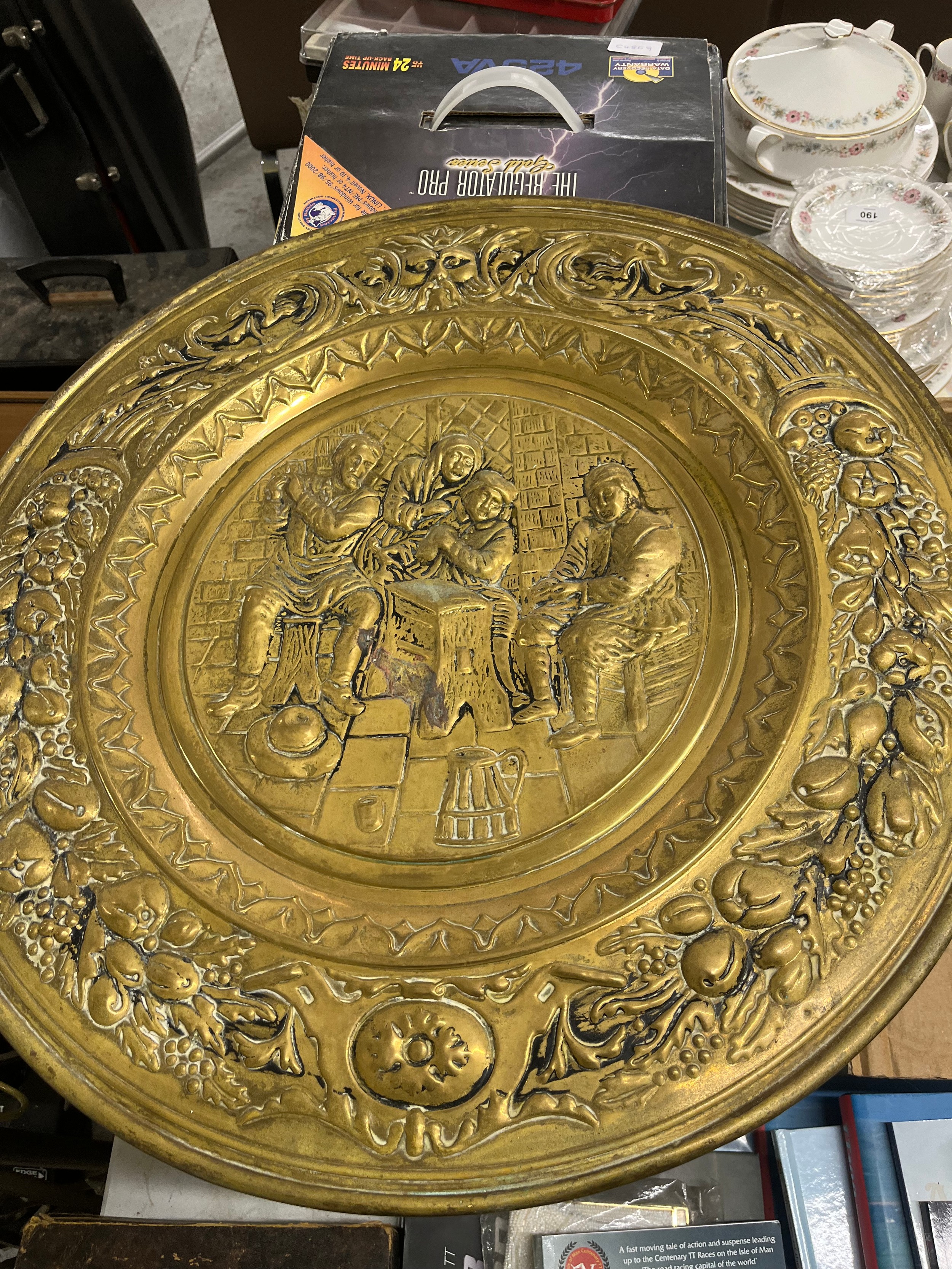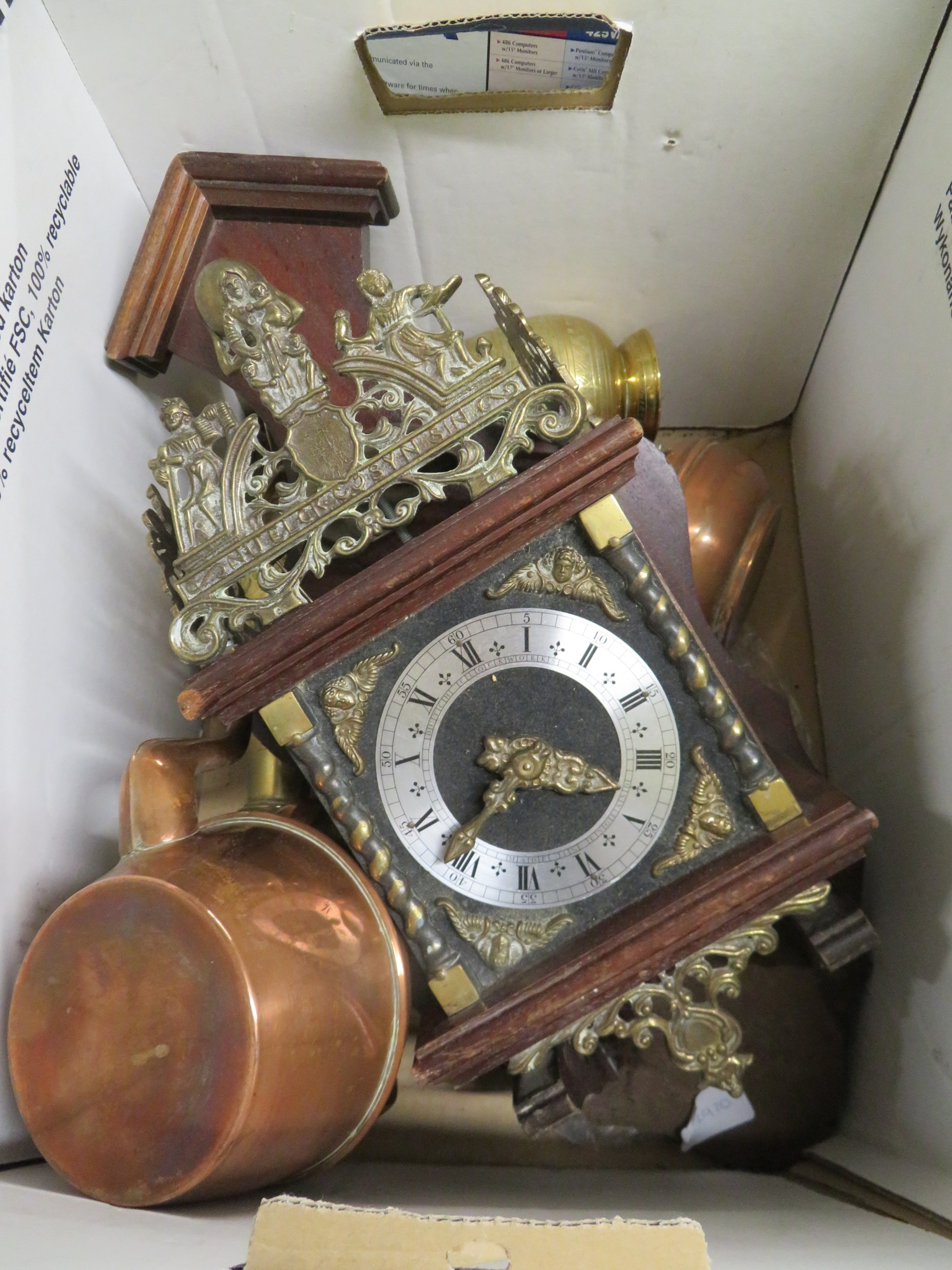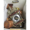 Box of metalware, including a clock, plus metal fire plate