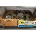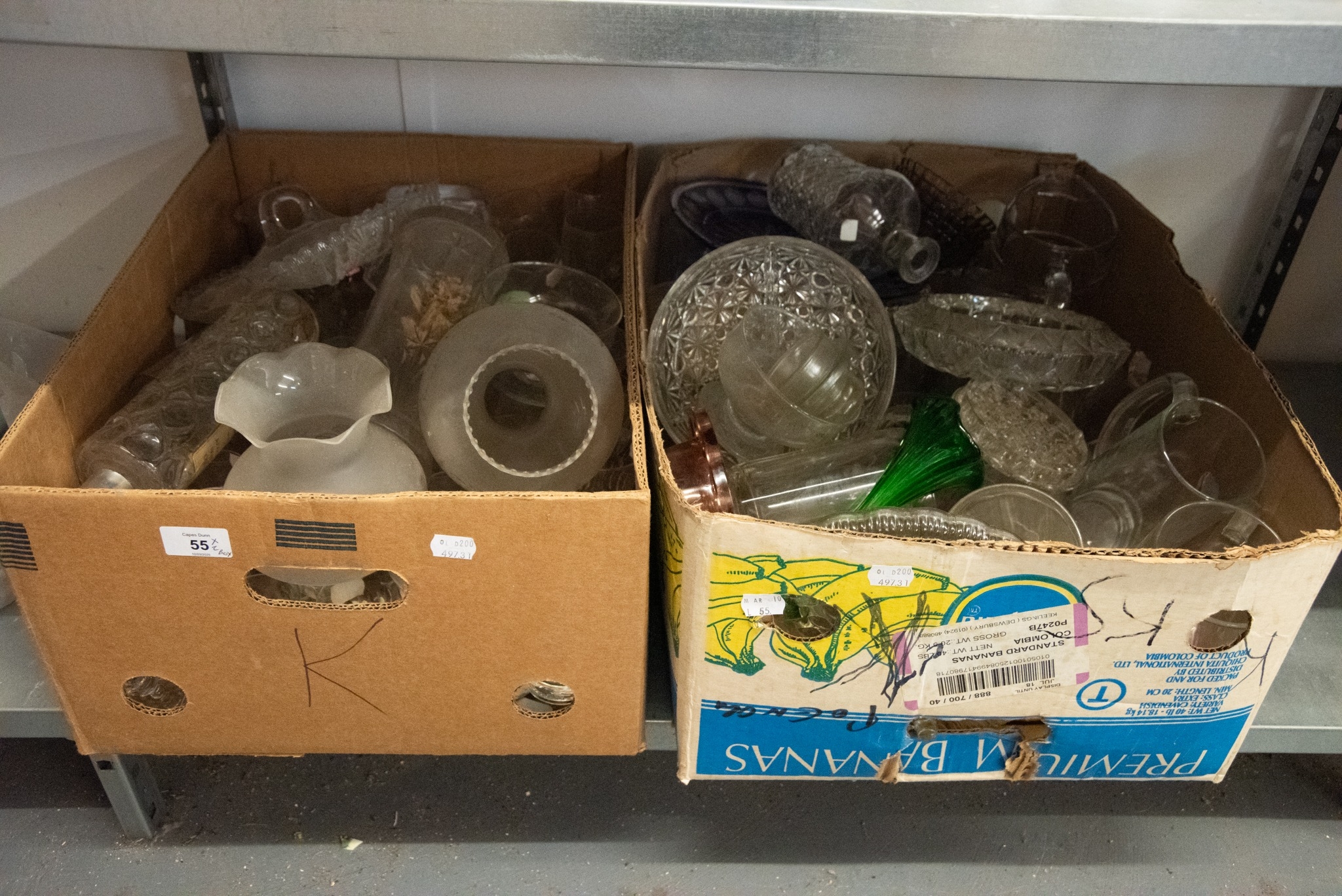 GOOD SELECTION OF EARLY TWENTIETH CENTURY AND LATER MAINLY MOULDED GLASSWARES INCLUDING TWO DIVISION DISH WITH RAISED LOOP HANDLE, TWO FROSTED GLASS LAMP SHADES, STEM WINES ETC... (CONTENTS OF TWO GOOD SIZED BOXES)