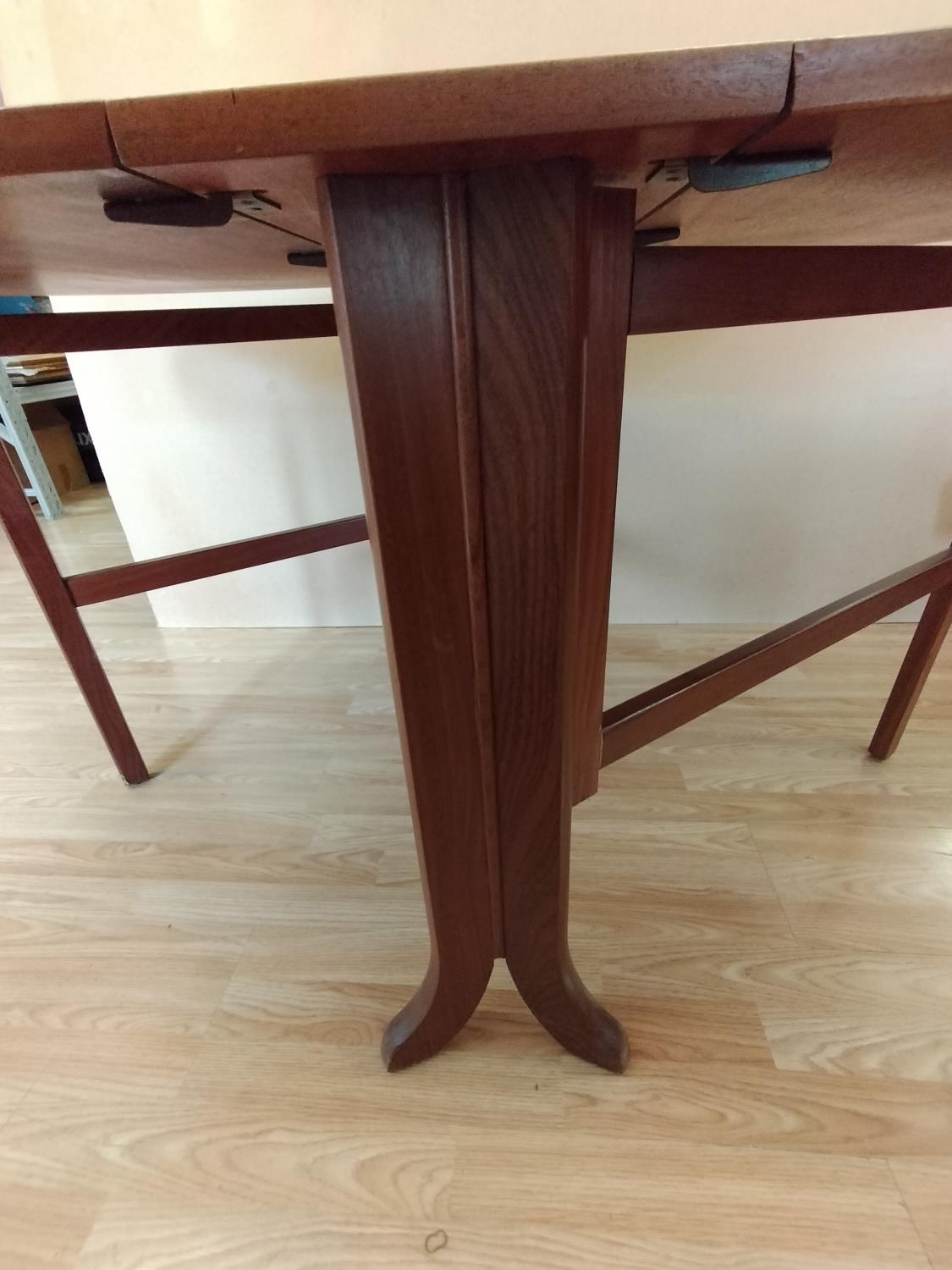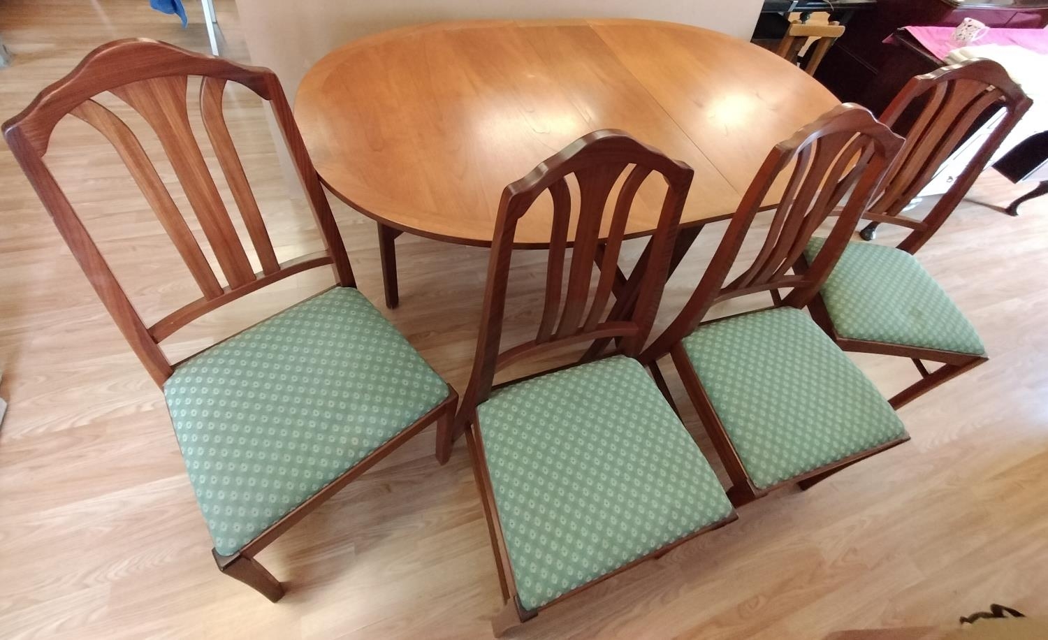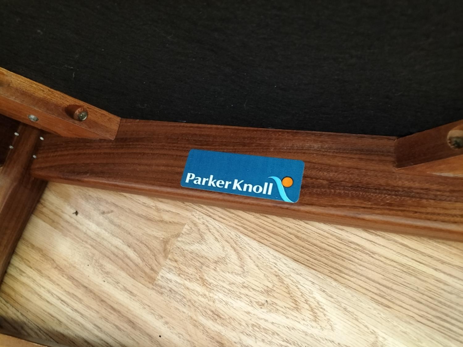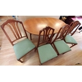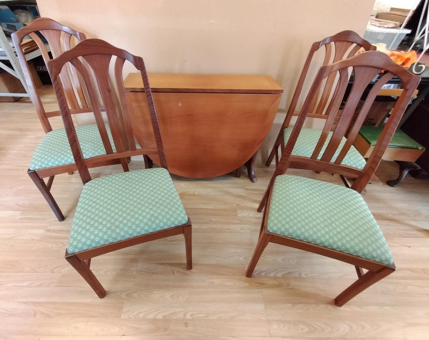 Mid Century Parker Knoll Teak Drop Leaf Dining Table and 4 Fabric Seat Parker Knoll Chairs. Table Closed 75cm High, 91cm x 25cm. Open 160cm. Chairs 96cm High, 48cm x 43cm, Seat Height 43cm. Collection Only.