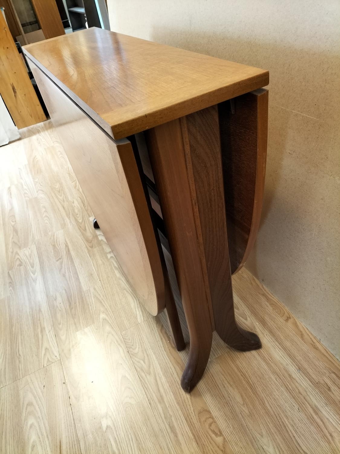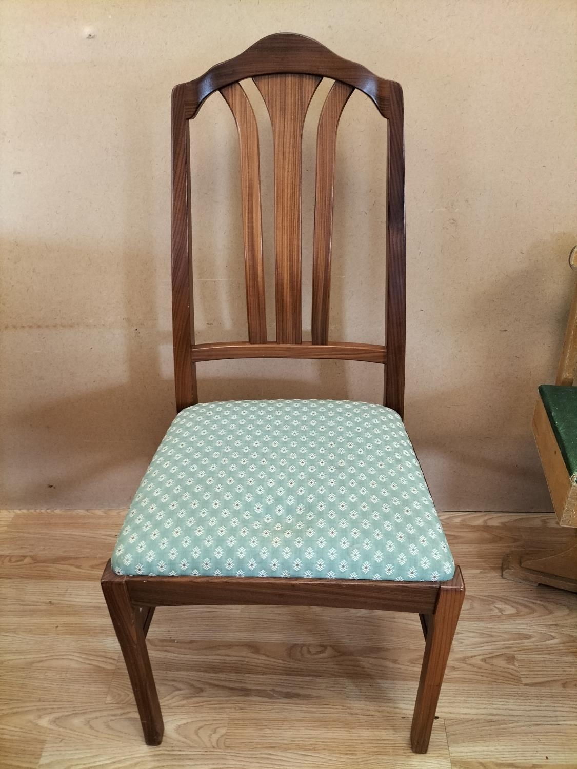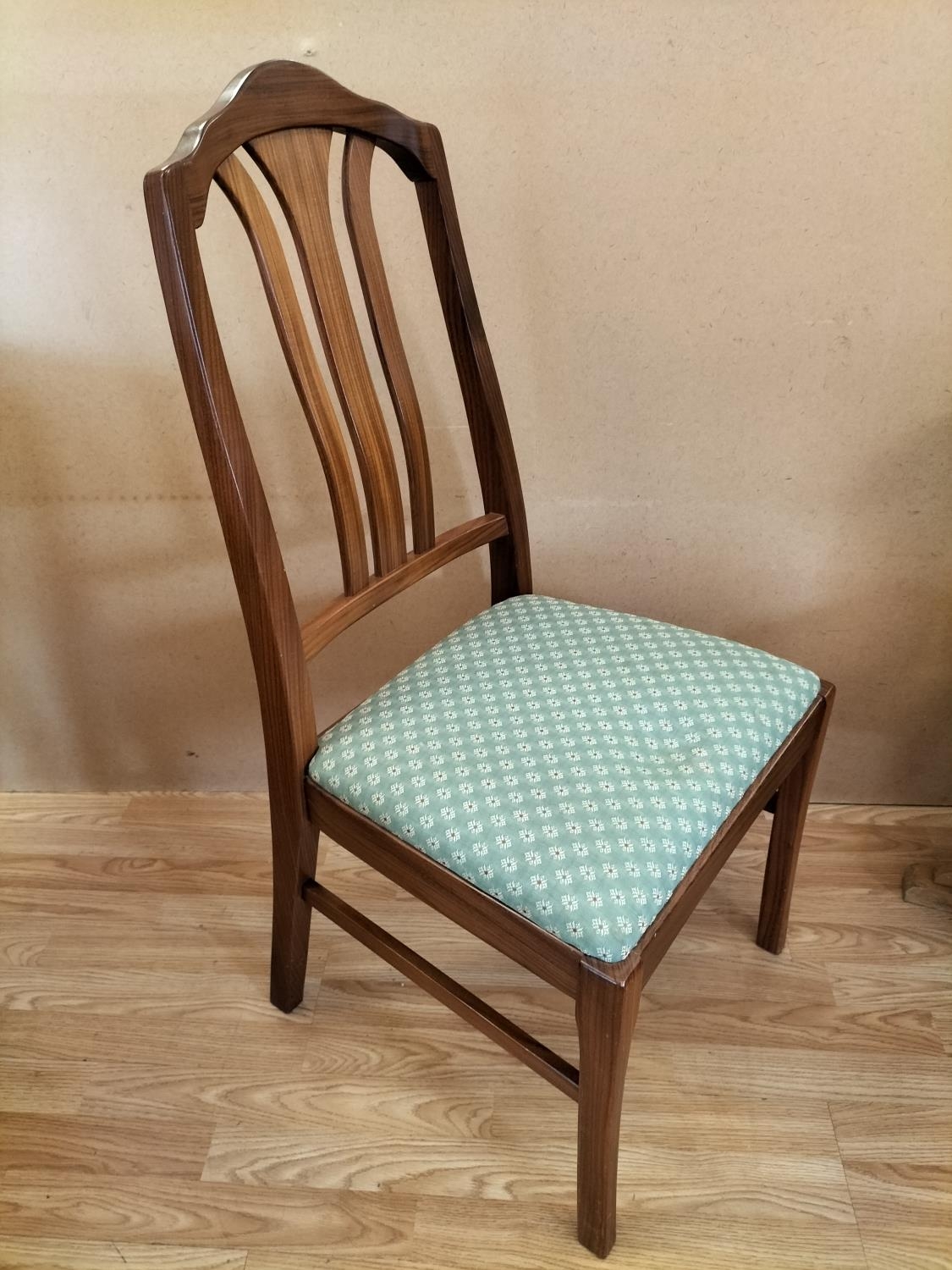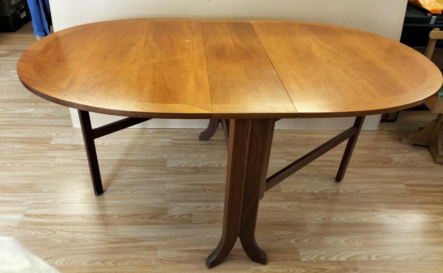 Mid Century Parker Knoll Teak Drop Leaf Dining Table and 4 Fabric Seat Parker Knoll Chairs. Table Closed 75cm High, 91cm x 25cm. Open 160cm. Chairs 96cm High, 48cm x 43cm, Seat Height 43cm. Collection Only.