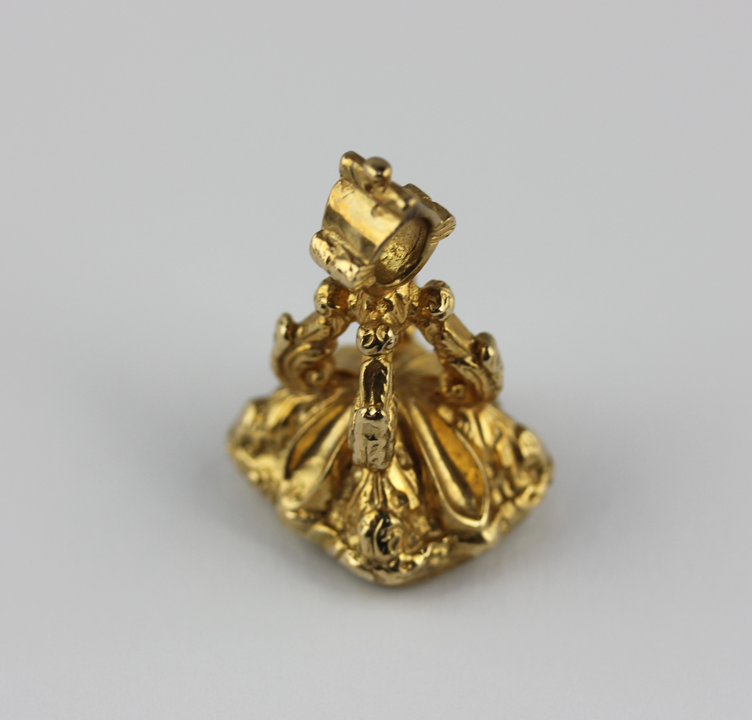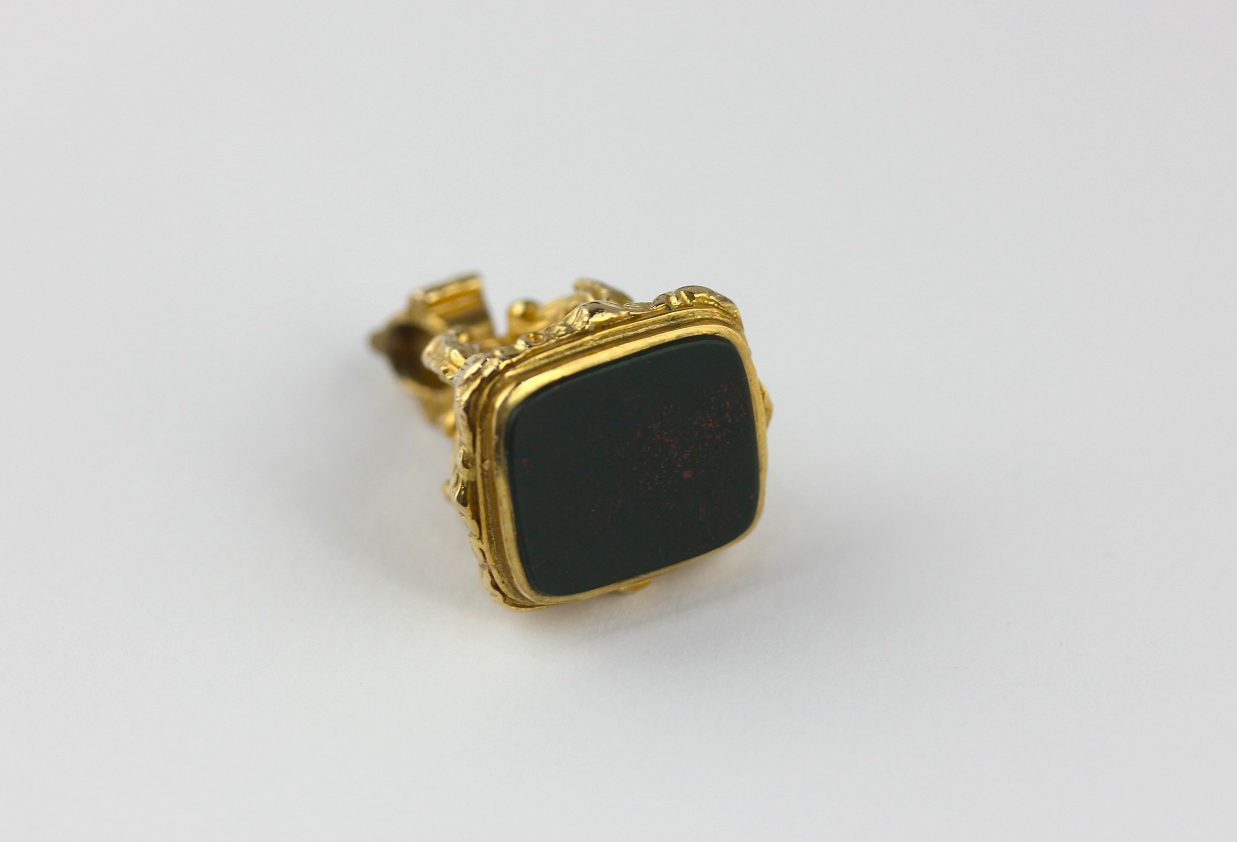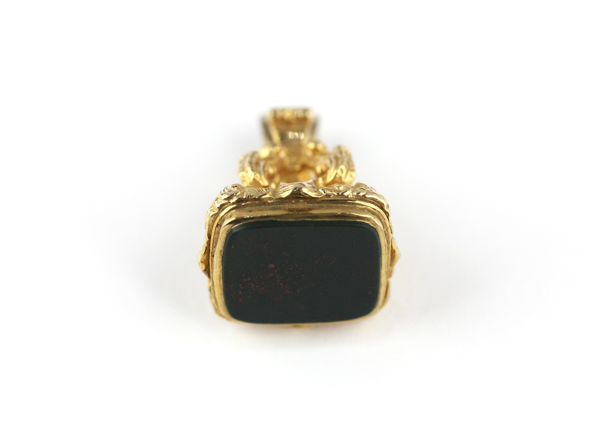 A 9ct gold and bloodstone pendant fob seal with cast scrolling decoration, London 1966, gross weight 14.5g, with its original purchase receipt.