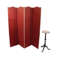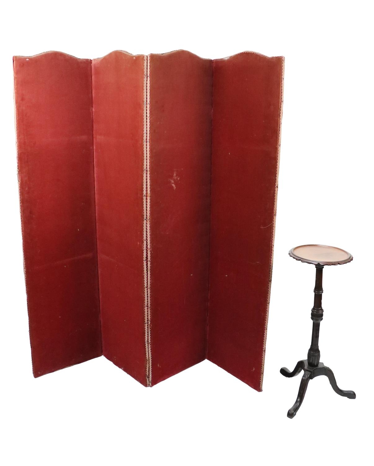 A four-fold fabric covered Draught Screen; together with a 19th Century tripod Wine Table. (2)