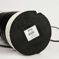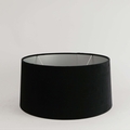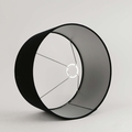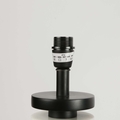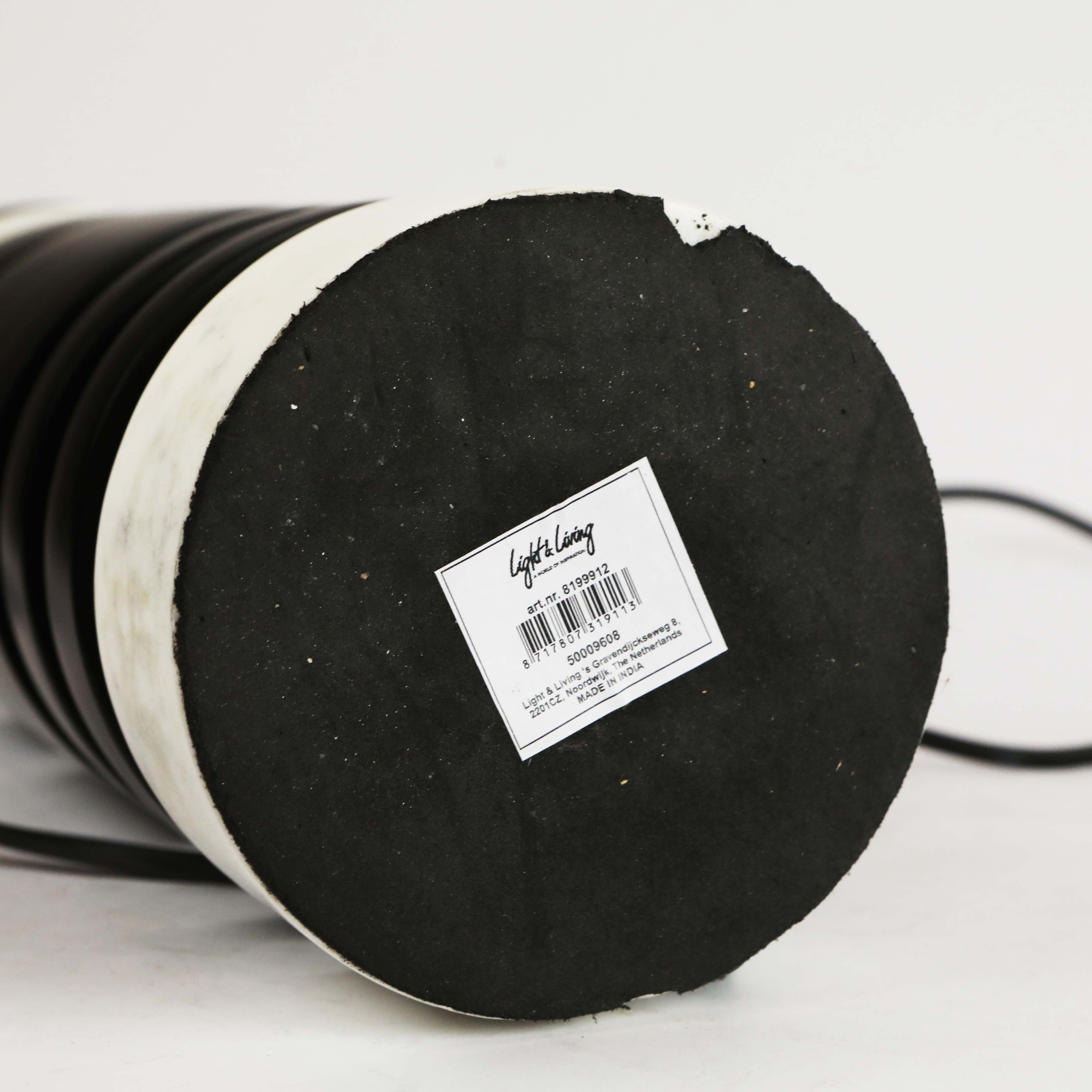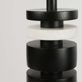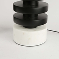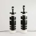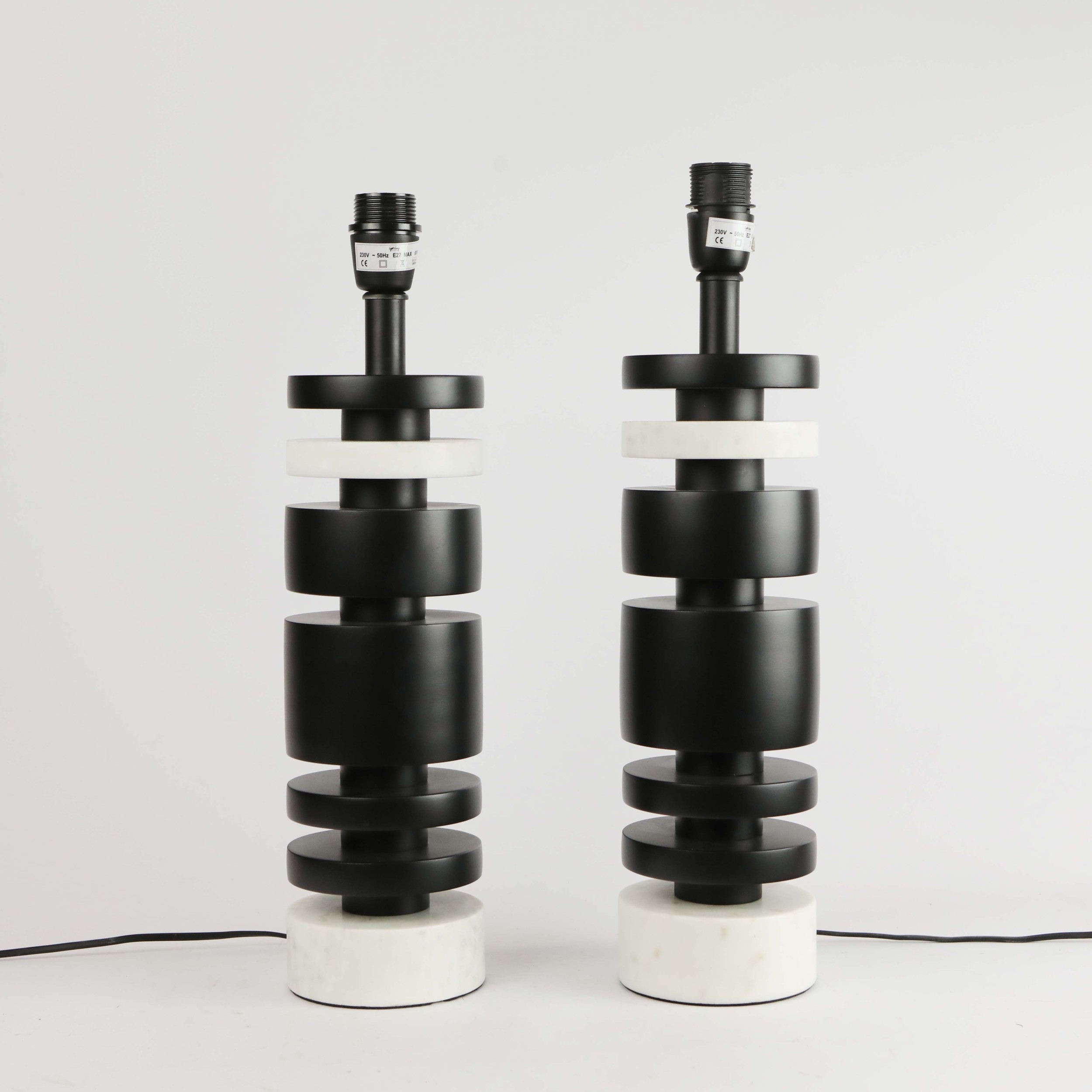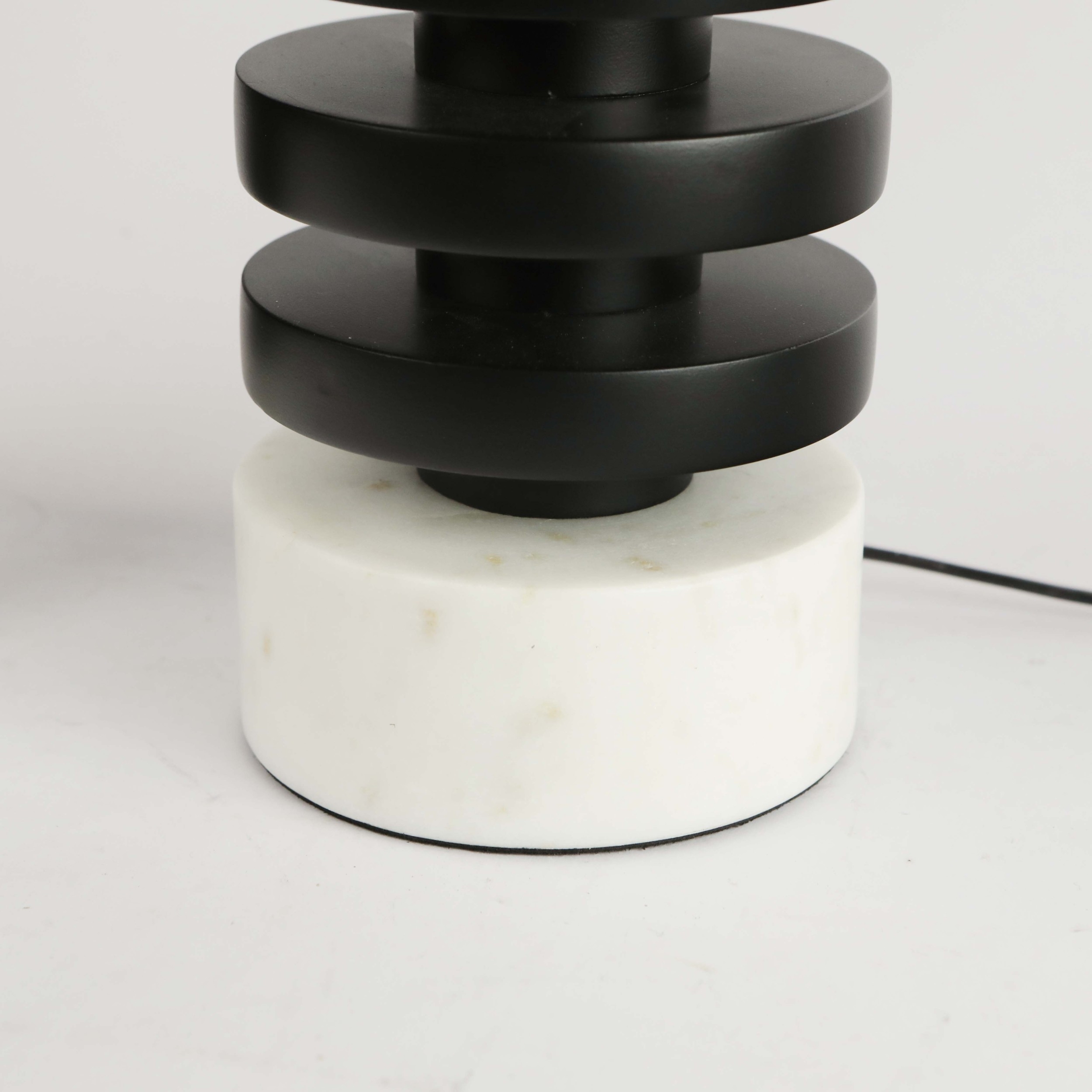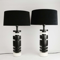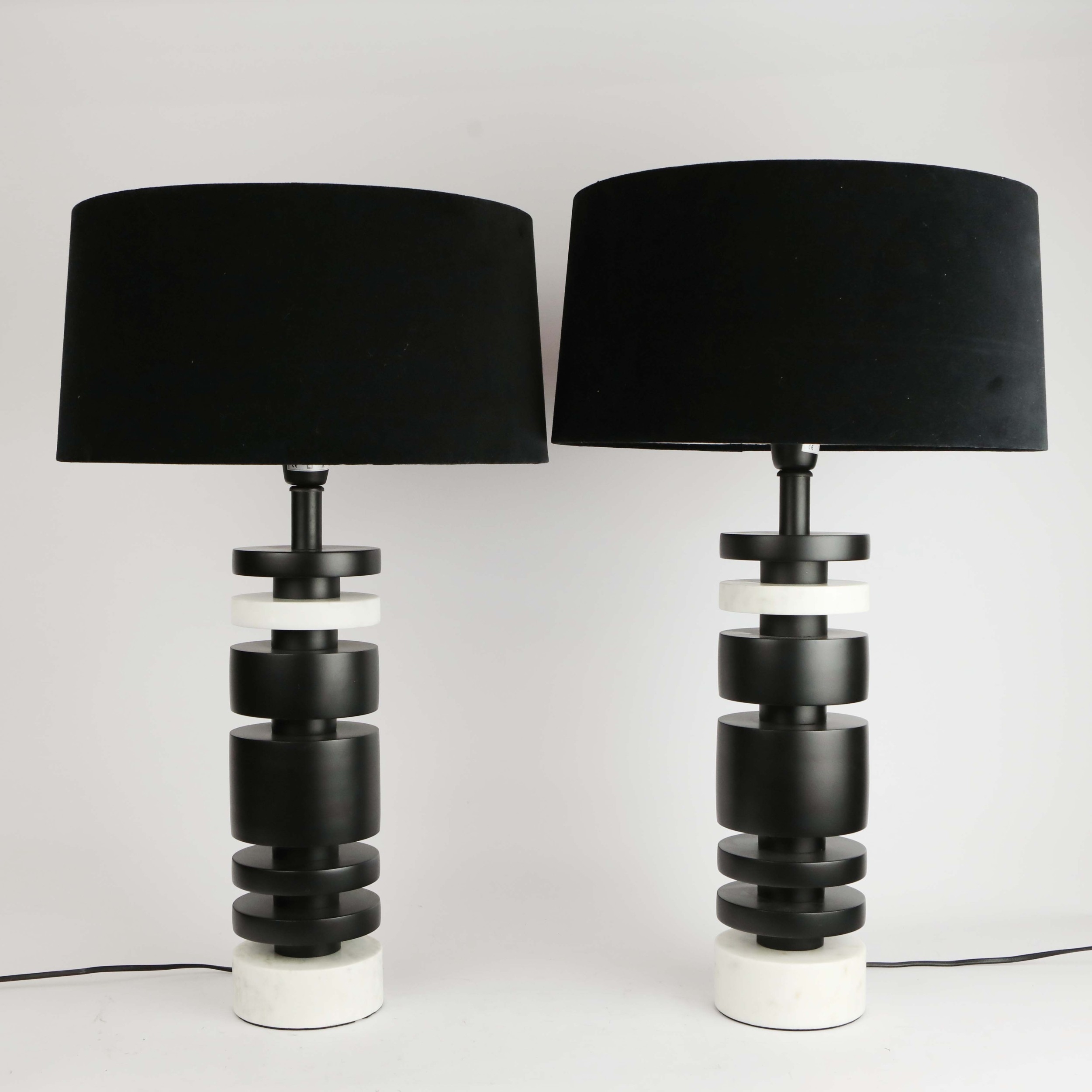 ROBERT LANGFORD TABLE LAMPS, A PAIR, BLACK DISCS WITH WHITE MARBLE. with black shades, each overall 68cm t including the shades (2).