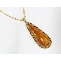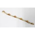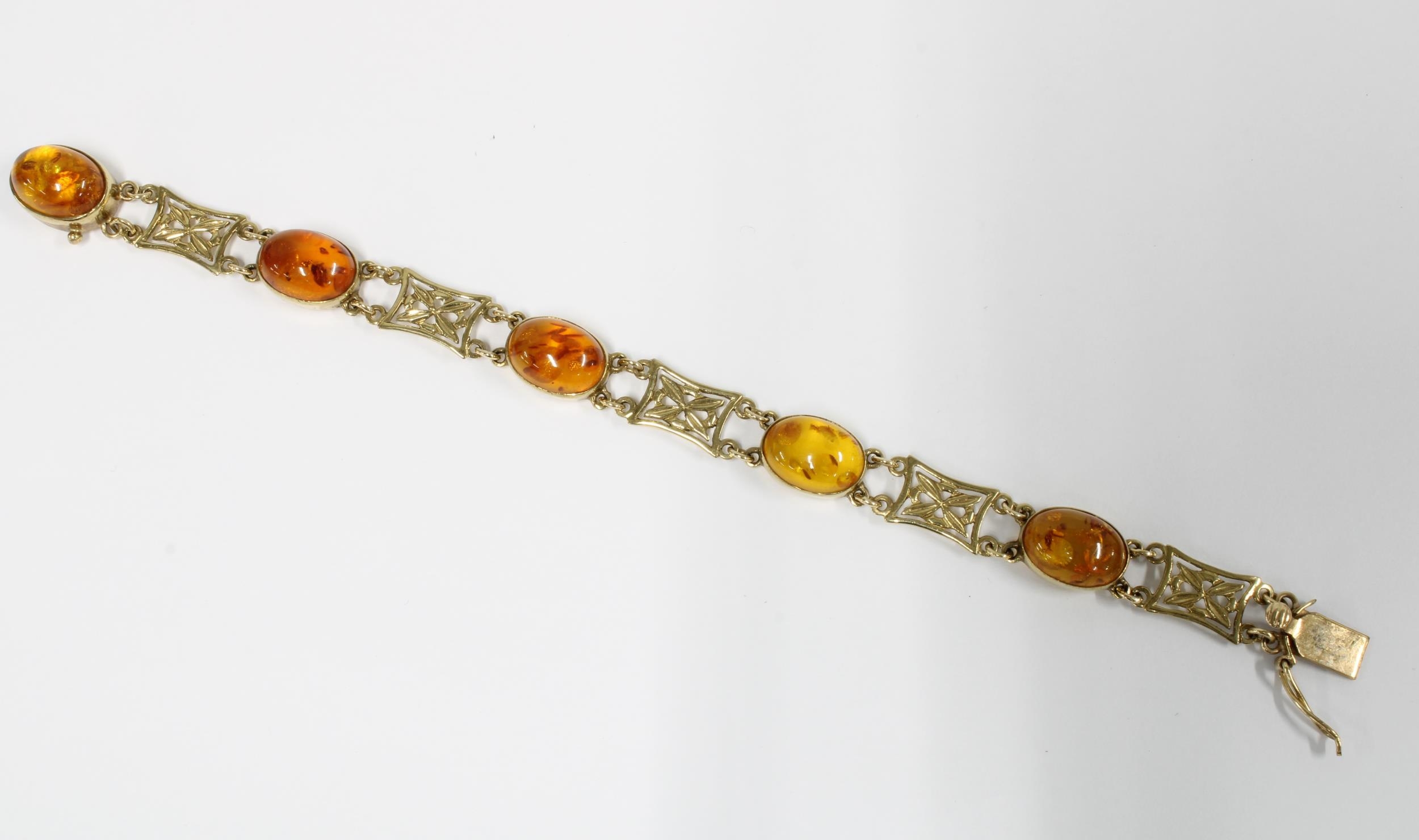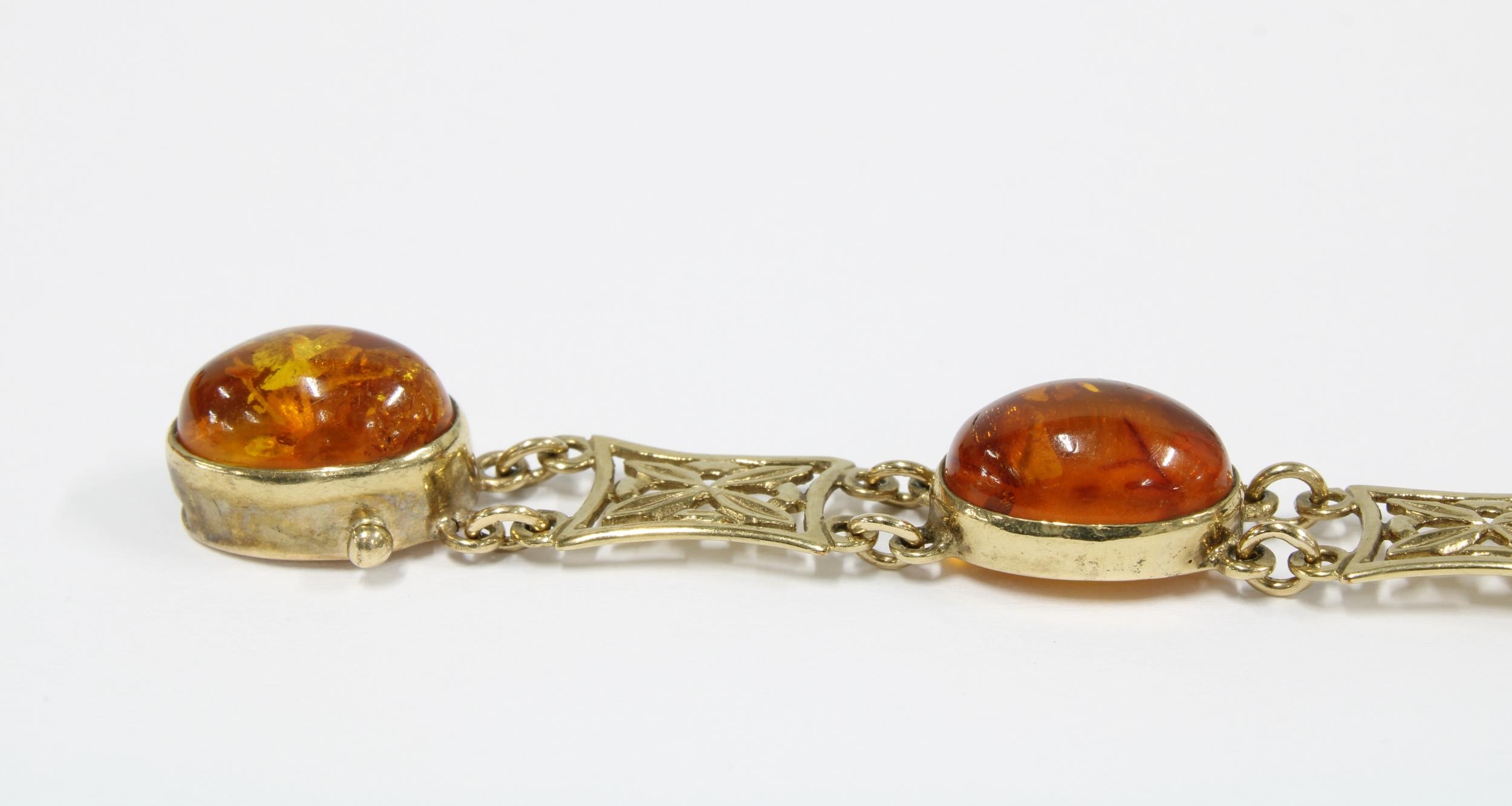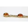 9ct gold bracelet with five amber cabochons interspersed with gold flowerhead panels, full set of hallmarks for Birmingham 1991