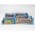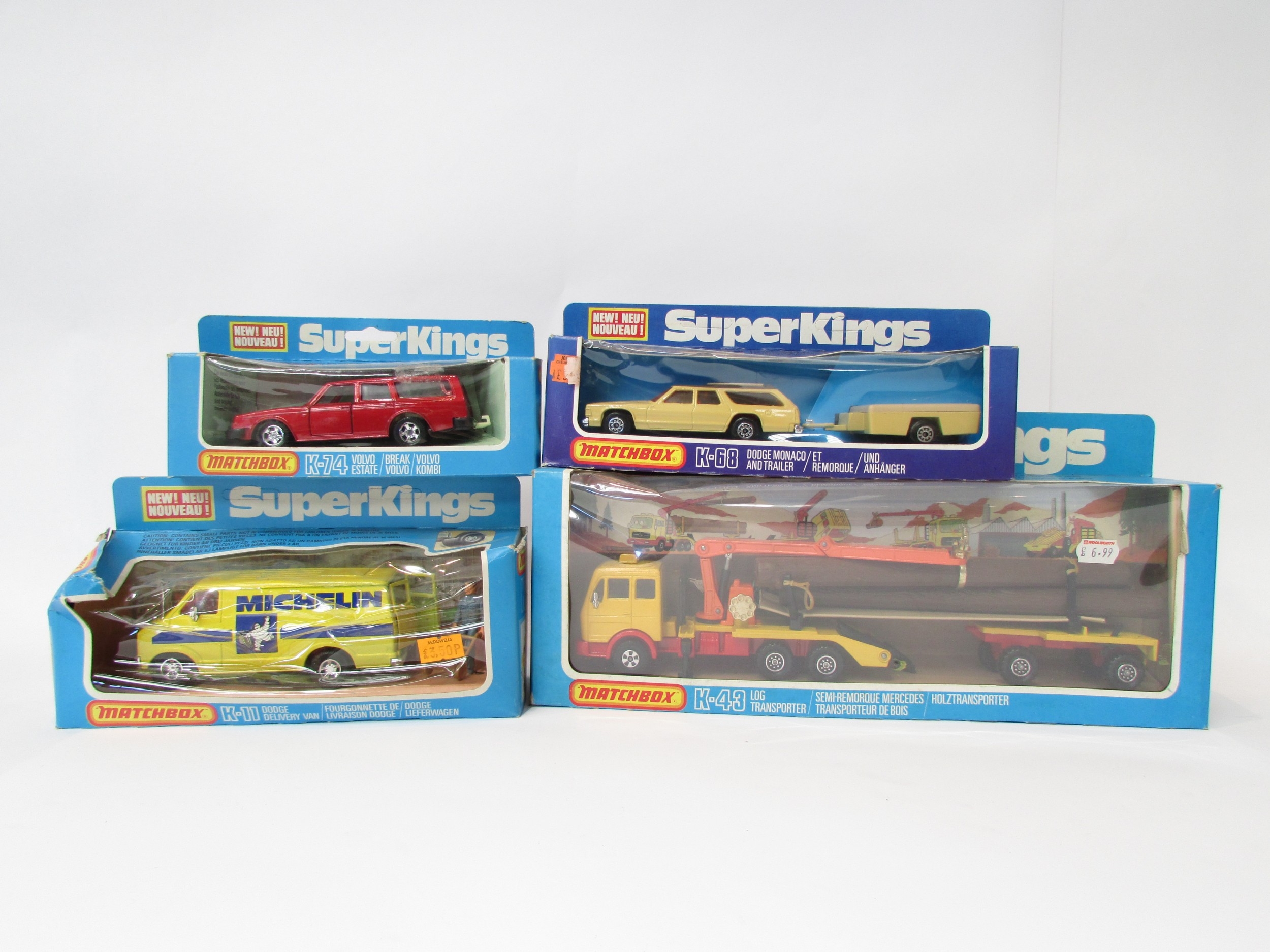 Four Matchbox SuperKings diecast models - K-43 Log Transporter, K-11 Michelin Dodge Delivery Van, K-68 Dodge Monaco and Trailer, and K-74 Volvo Estate, all in original boxes