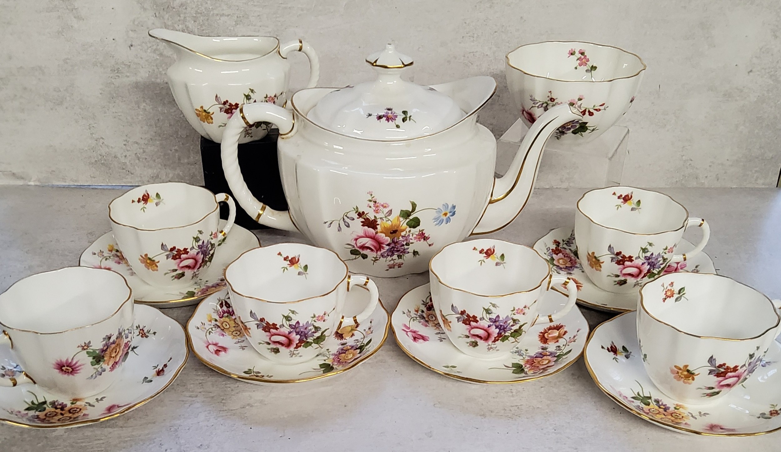 A Royal Crown Derby, Derby Posies pattern part tea service for six comprising tea pot, teacups & saucers, milk jug and sugar bowl