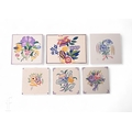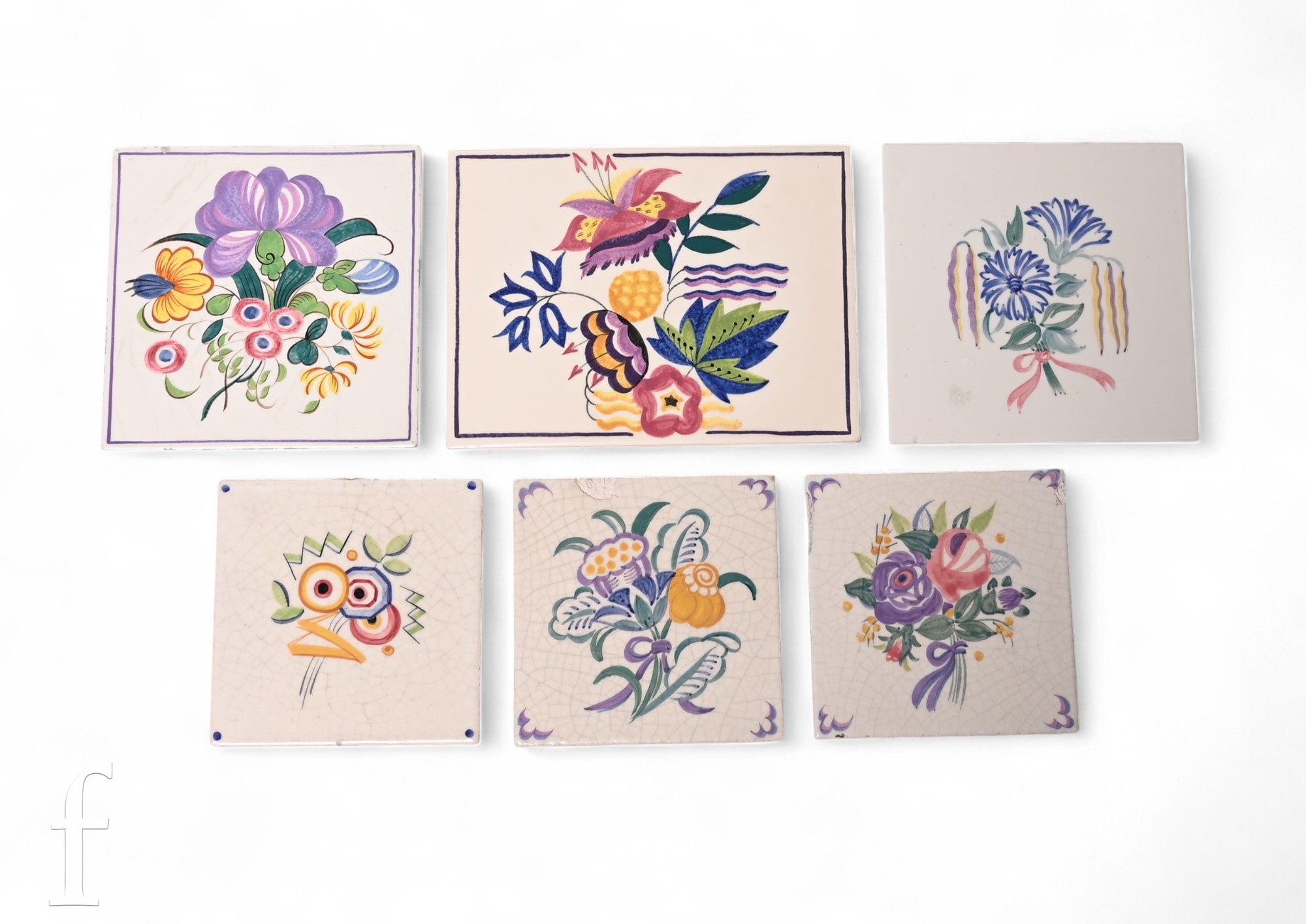 A collection of Carter & Co (Poole Pottery) handpainted tiles, to include a plastic clay 5 inch tile with stylised Art Deco flowers by Truda Carter circa 1925, two plastic clay 5 inch tiles with floral sprays also by Truda Carter, and three other tiles also with floral sprays, to include a dust pressed 6 inch example probably by Reginald Till, a dust pressed 6 inch tile by Truda Carter, and a dust pressed rectangular tile, also by Truda Carter and painted by Jacqueline Way. (6)