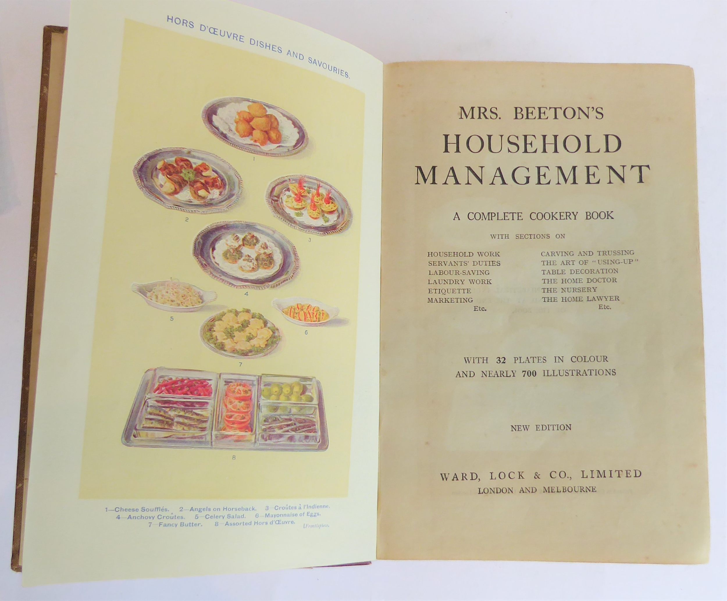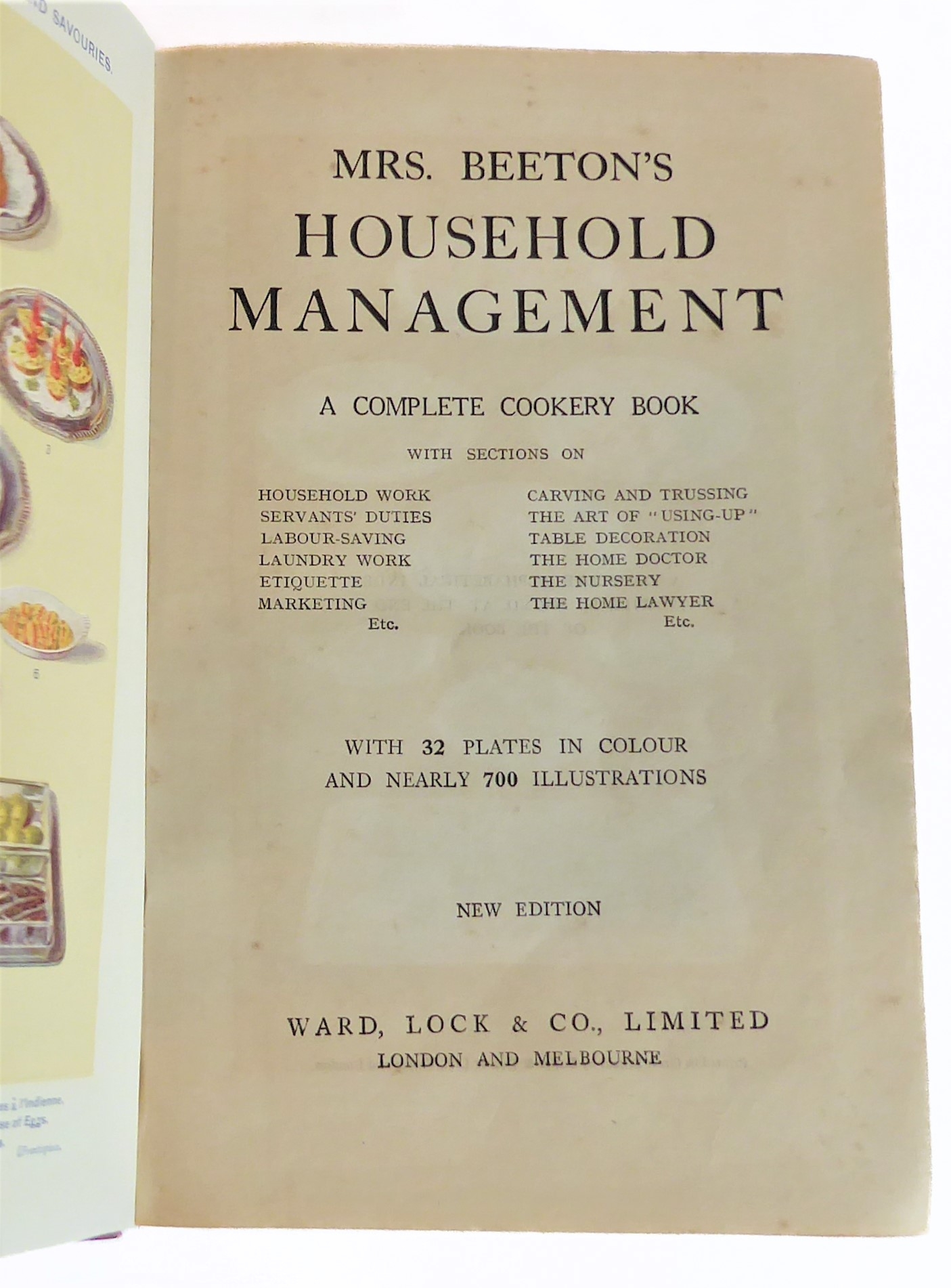 Isabella Beeton - 'Mrs Beeton's Household Management', new edition, quarter red buckram, cloth sides, pp xvi 1680, 32 colour plates, adverts and nearly 700 illustrations (Ward, Lock & Co. London, 1933);