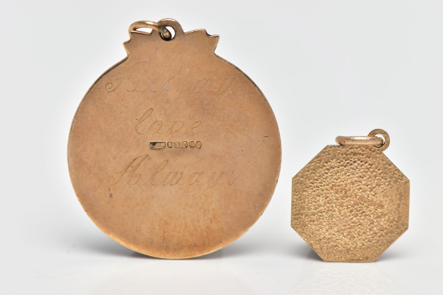 TWO 9CT GOLD ST.CHRISTOPHER PENDANTS, the first a of a circular form, personal engraving to the reverse partially worn name, the rest reads 'my love always', hallmarked 9ct Birmingham, approximate diameter 23.0mm, fitted with a jump ring, together with a smaller hexagonal St. Christopher pendant, hallmarked 9ct London, fitted with a jump ring, approximate diameter 12.6mm, approximate gross weight 6.0 grams (condition report: both have some general light wear, overall condition good)