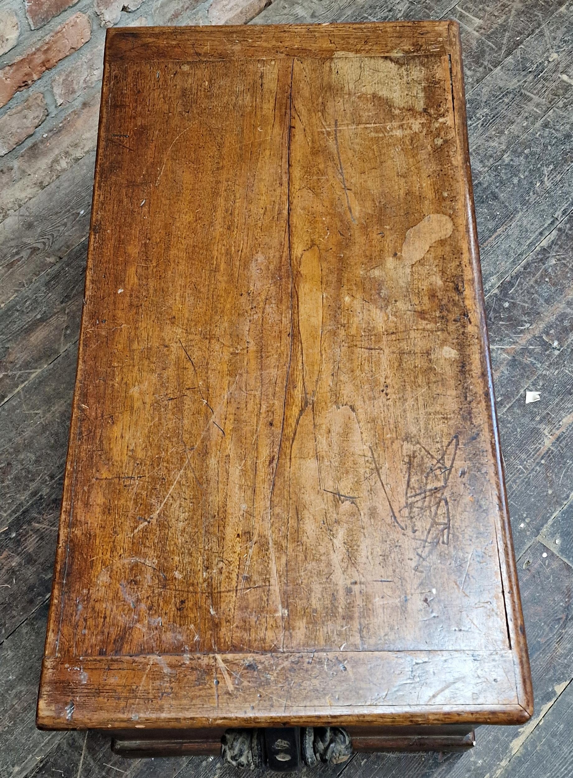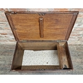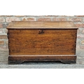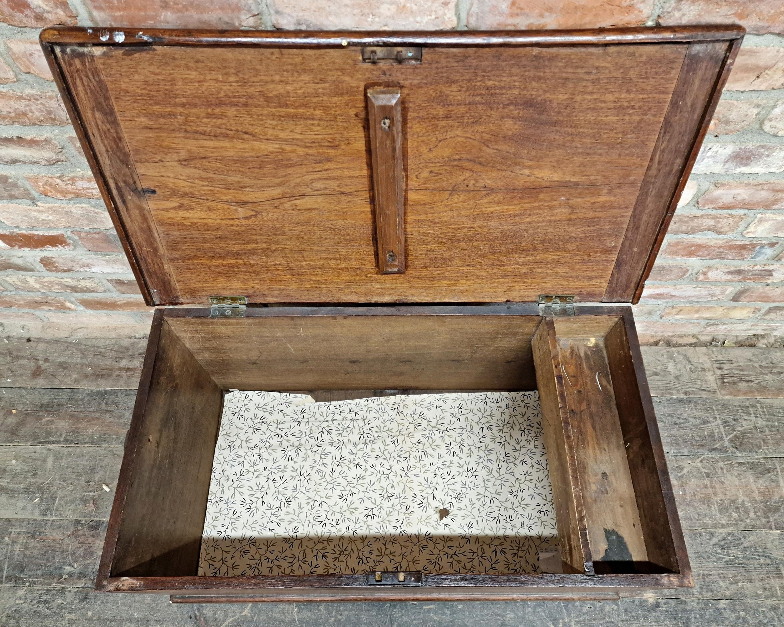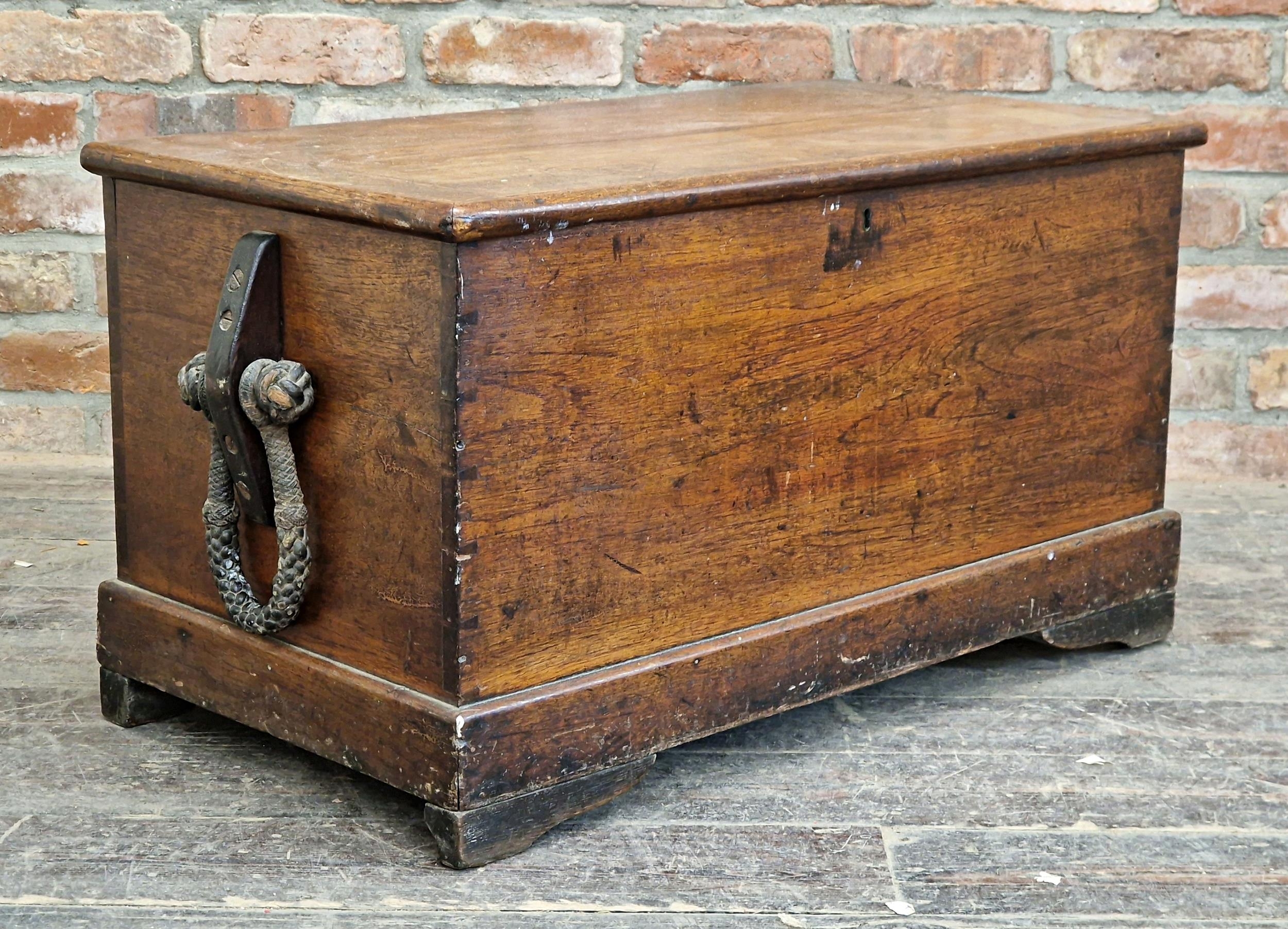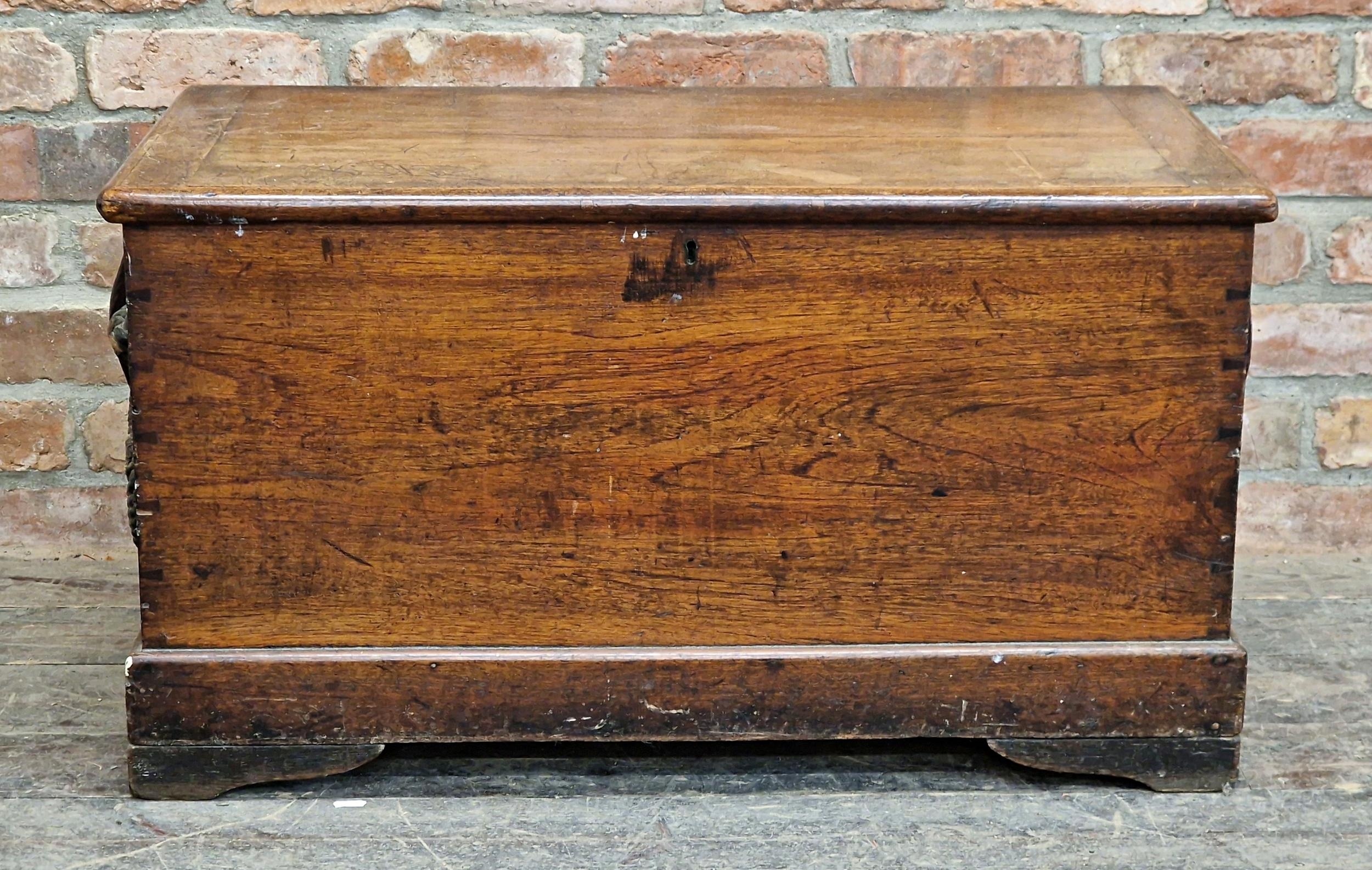19th century teak sea chest with hinged lid and rope handles (missing one), raised on bracket feet, H 49cm x W 90cm x D 48cm