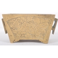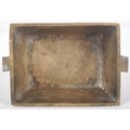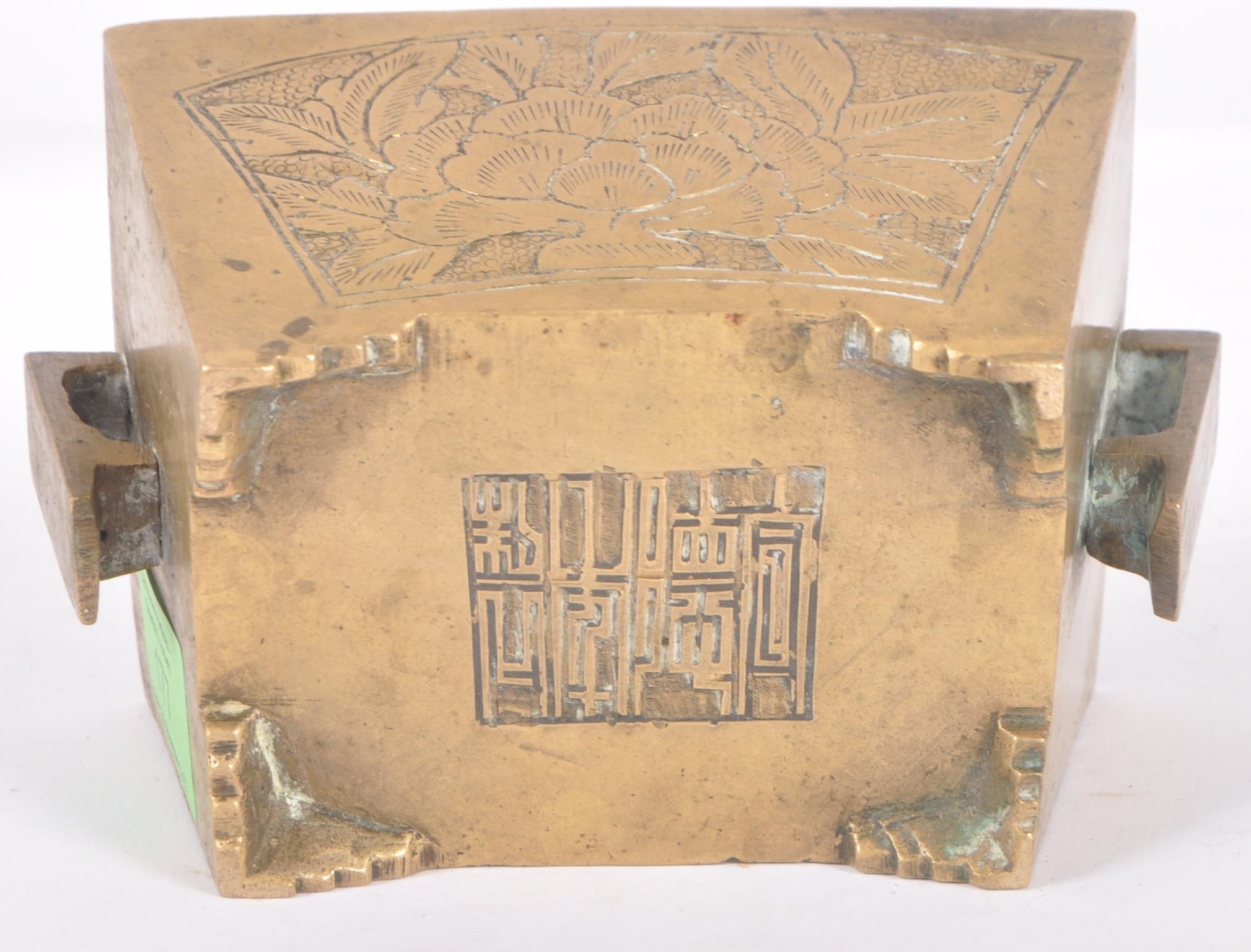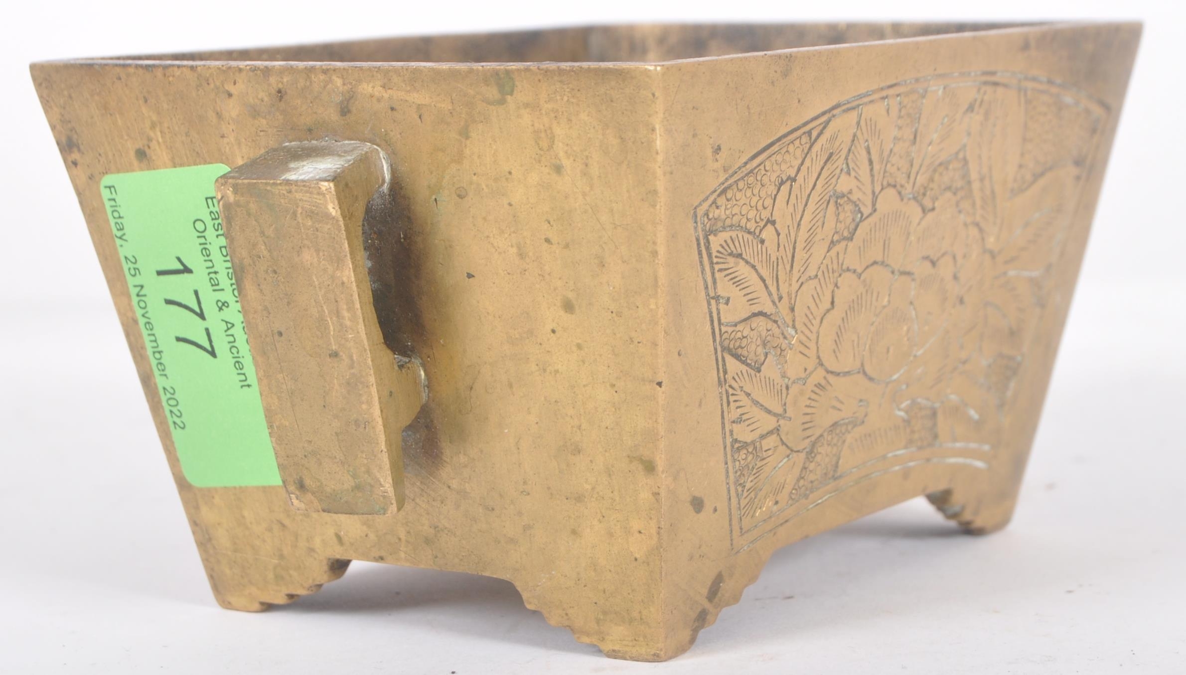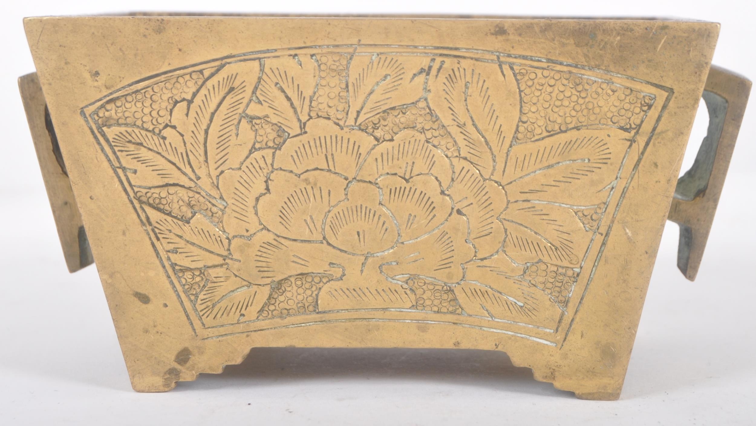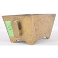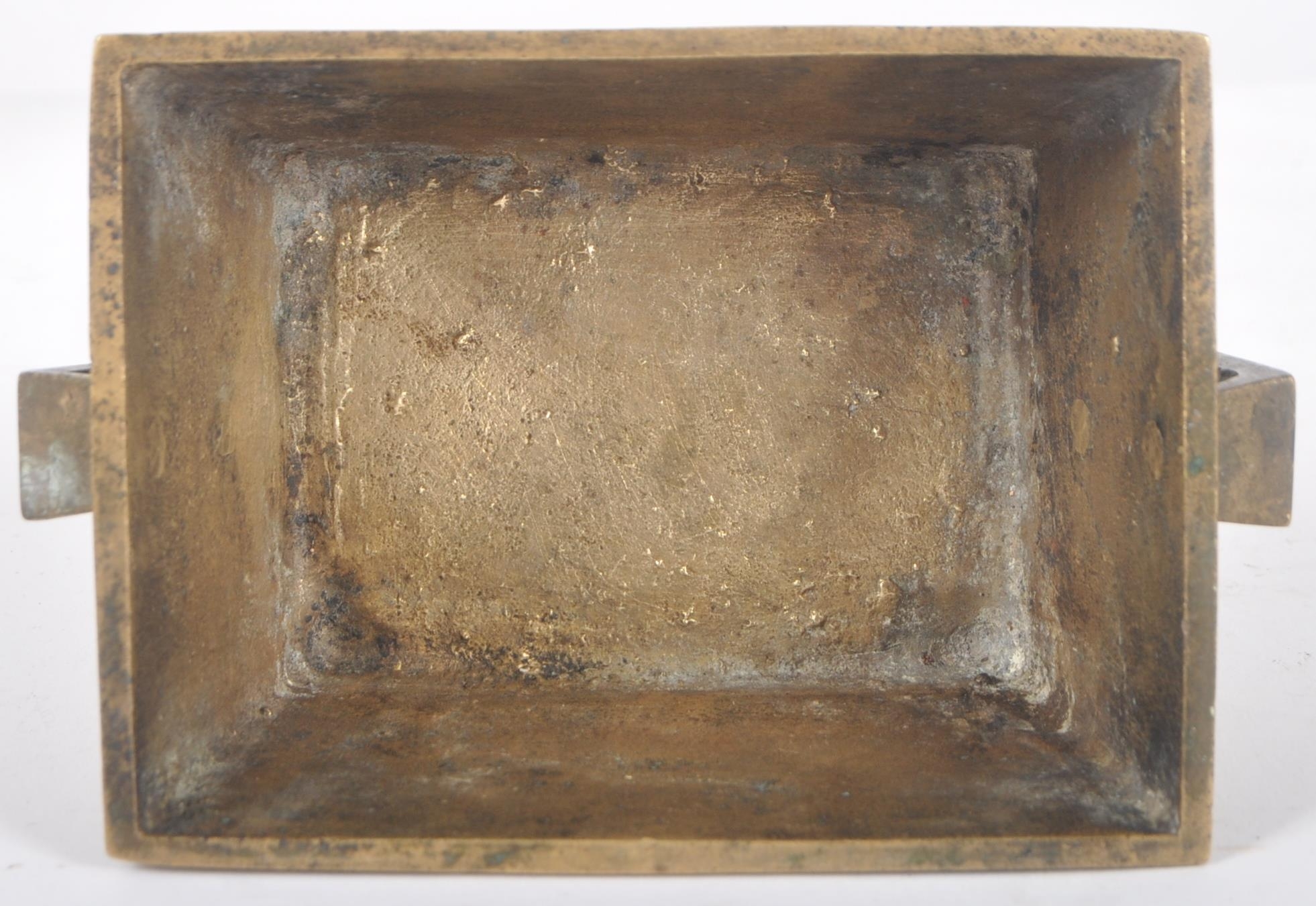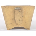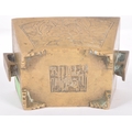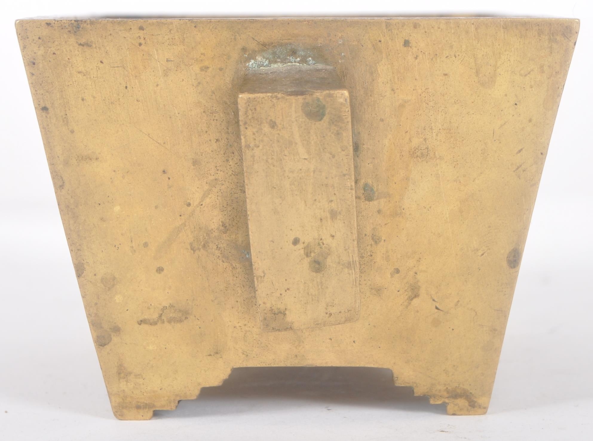 An early 20th Century Chinese bronze censer ding bowl having engraved panels with twin archaic handles raised on small bracket feet. The underside with cast seal script mark. Measures approx; 14cm wide.