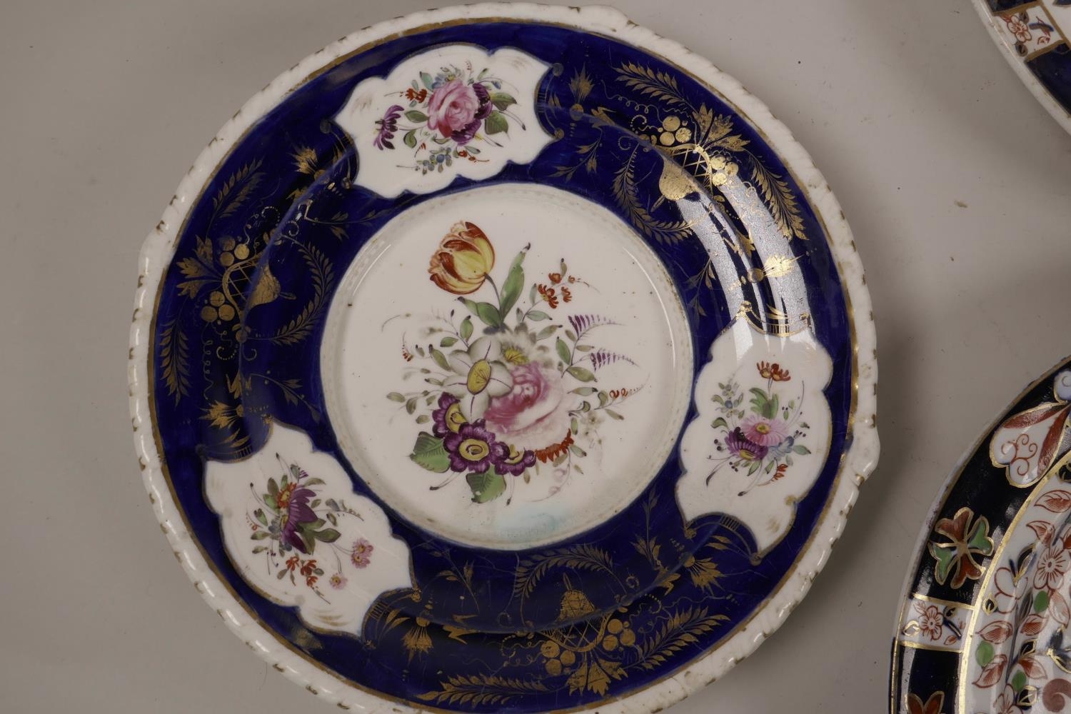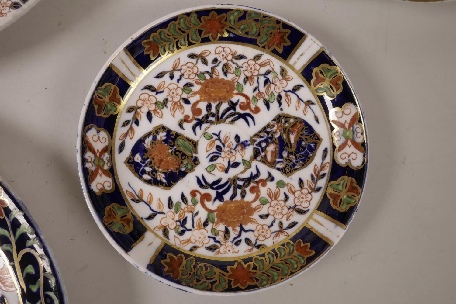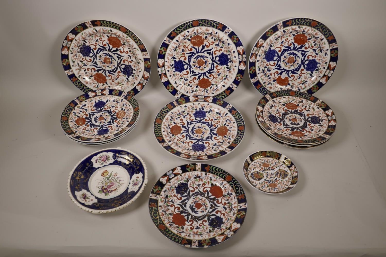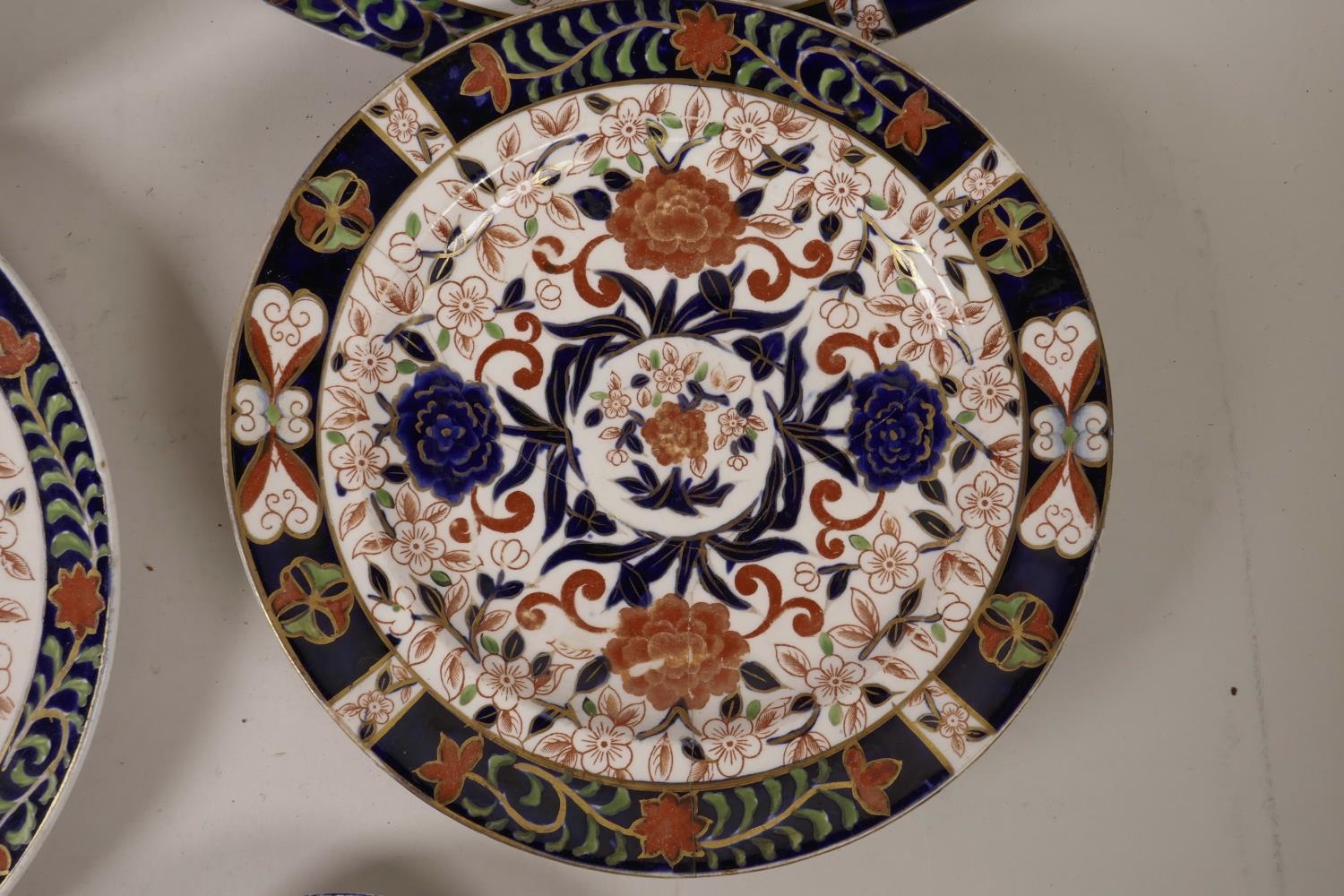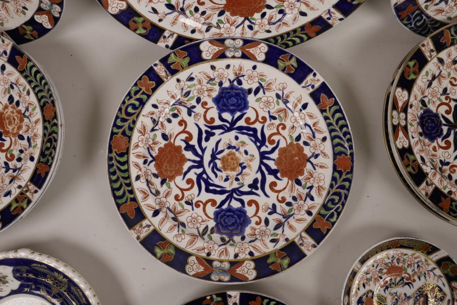 A quantity of C19th Royal Crown Derby plates of assorted sizes, decorated in the Imari palette, A/F, largest 10½" diameter