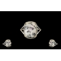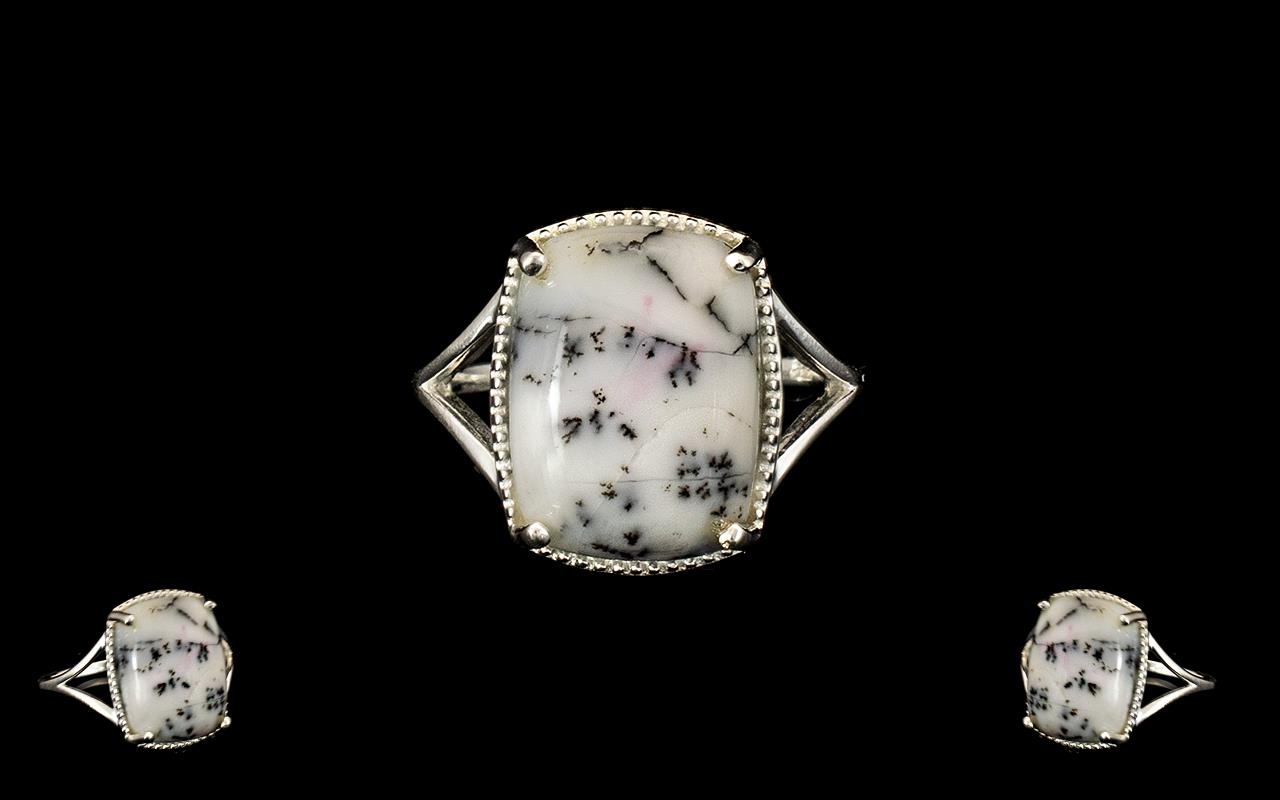 Dendritic Agate Solitaire Ring, an 8ct cushion cut cabochon of dendritic agate, a natural white stone with frond like black markings which can often be interpreted as miniature landscapes with tiny animals or figures; here set in a discreet silver frame and split-shouldered shank; size Q